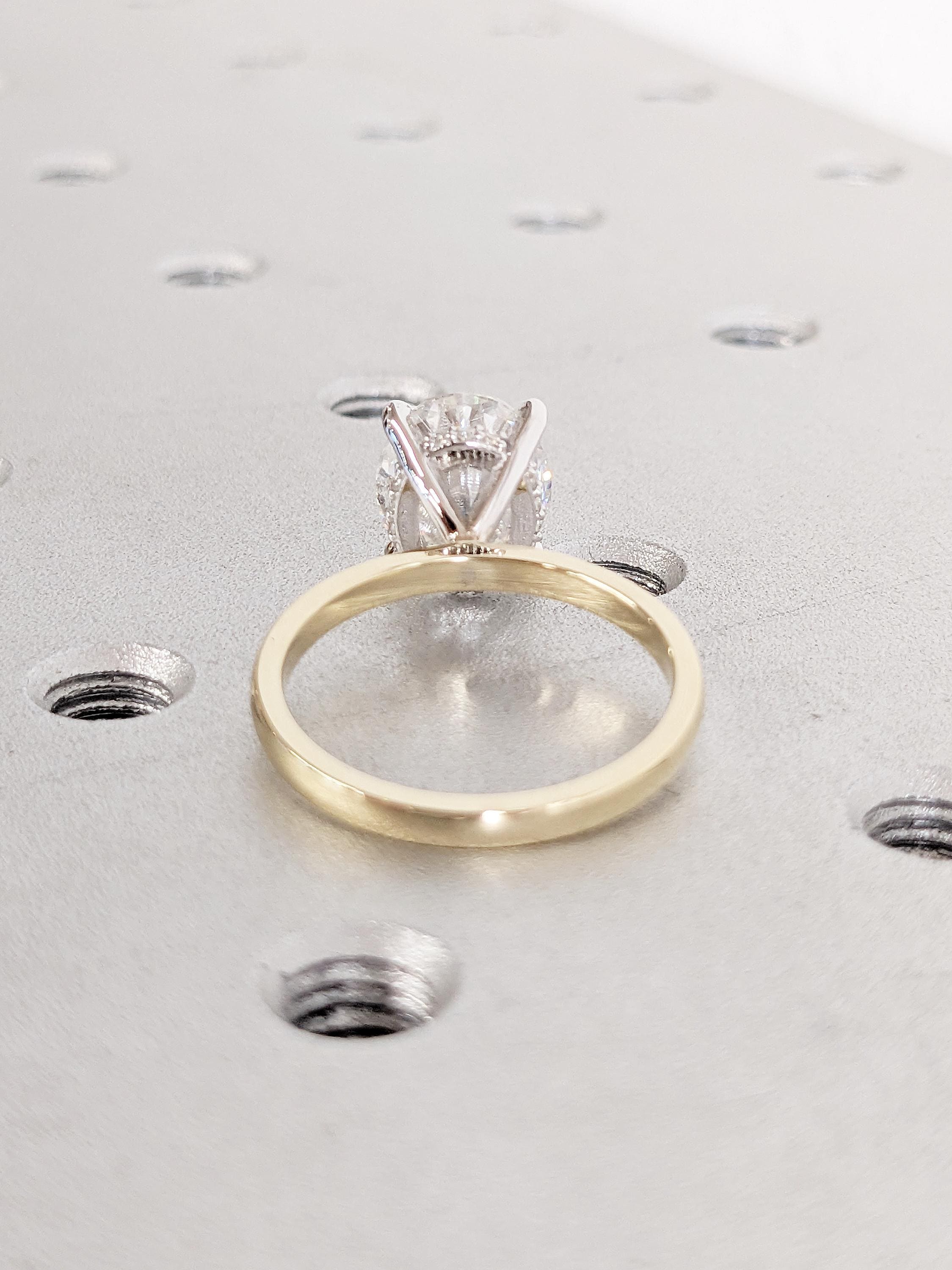 Mark a special moment with this stunning two-tone engagement ring, featuring a dazzling oval cut Moissanite at its heart. A hidden halo of sparkling moissanites enhances its brilliance, while the sleek prong setting adds a refined touch. Designed to capture timeless elegance, this ring is an ideal symbol of love for weddings, anniversaries, or unforgettable milestones.