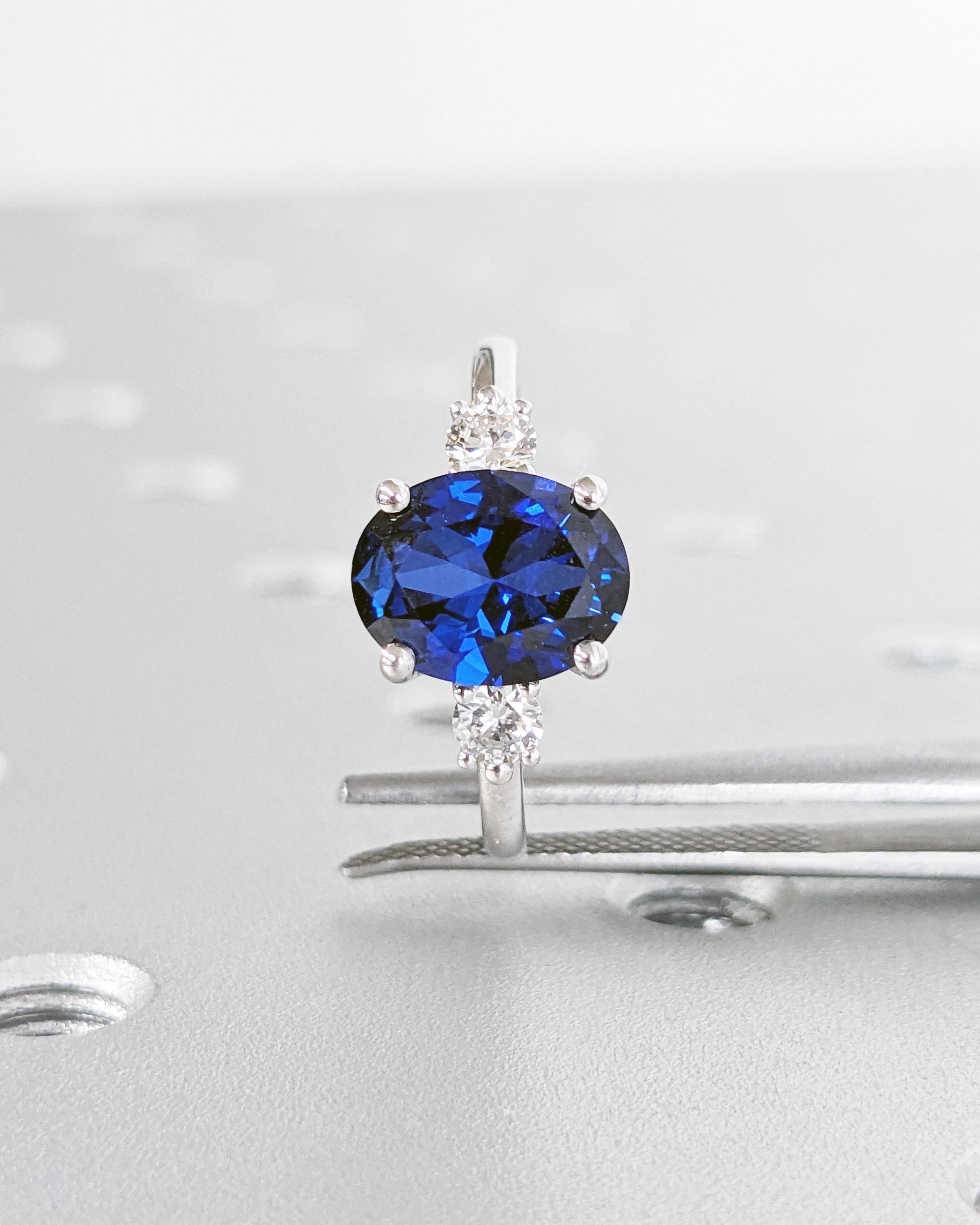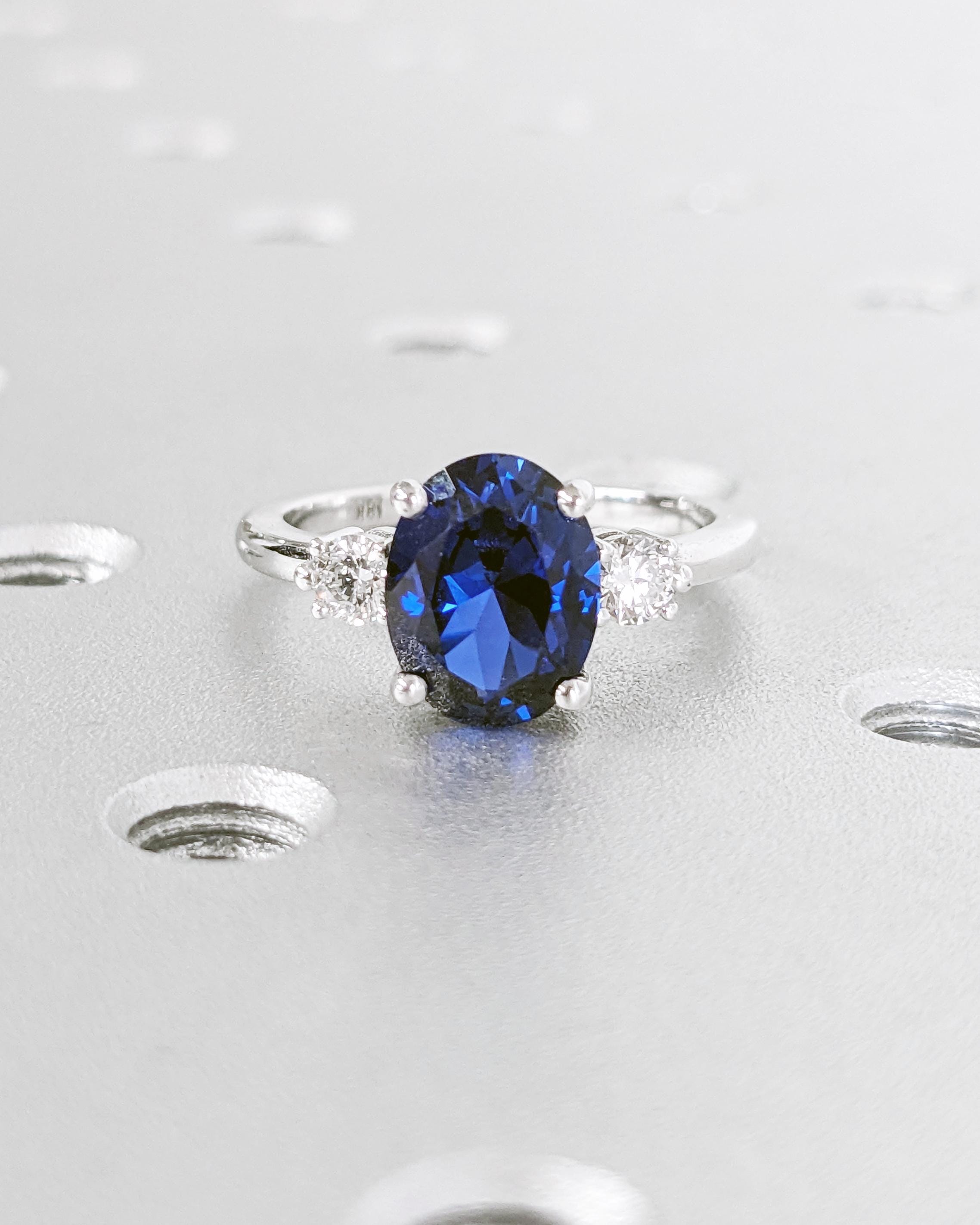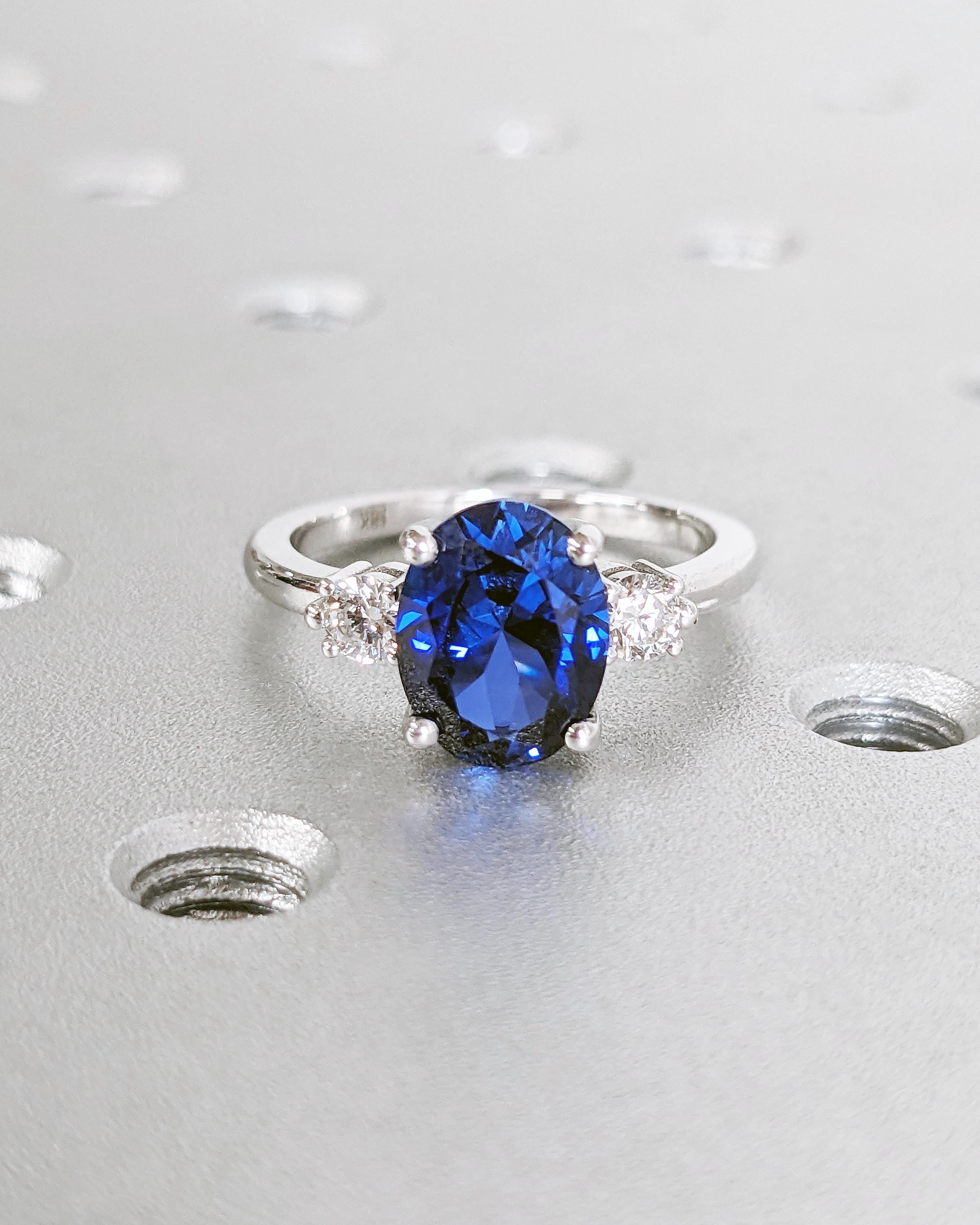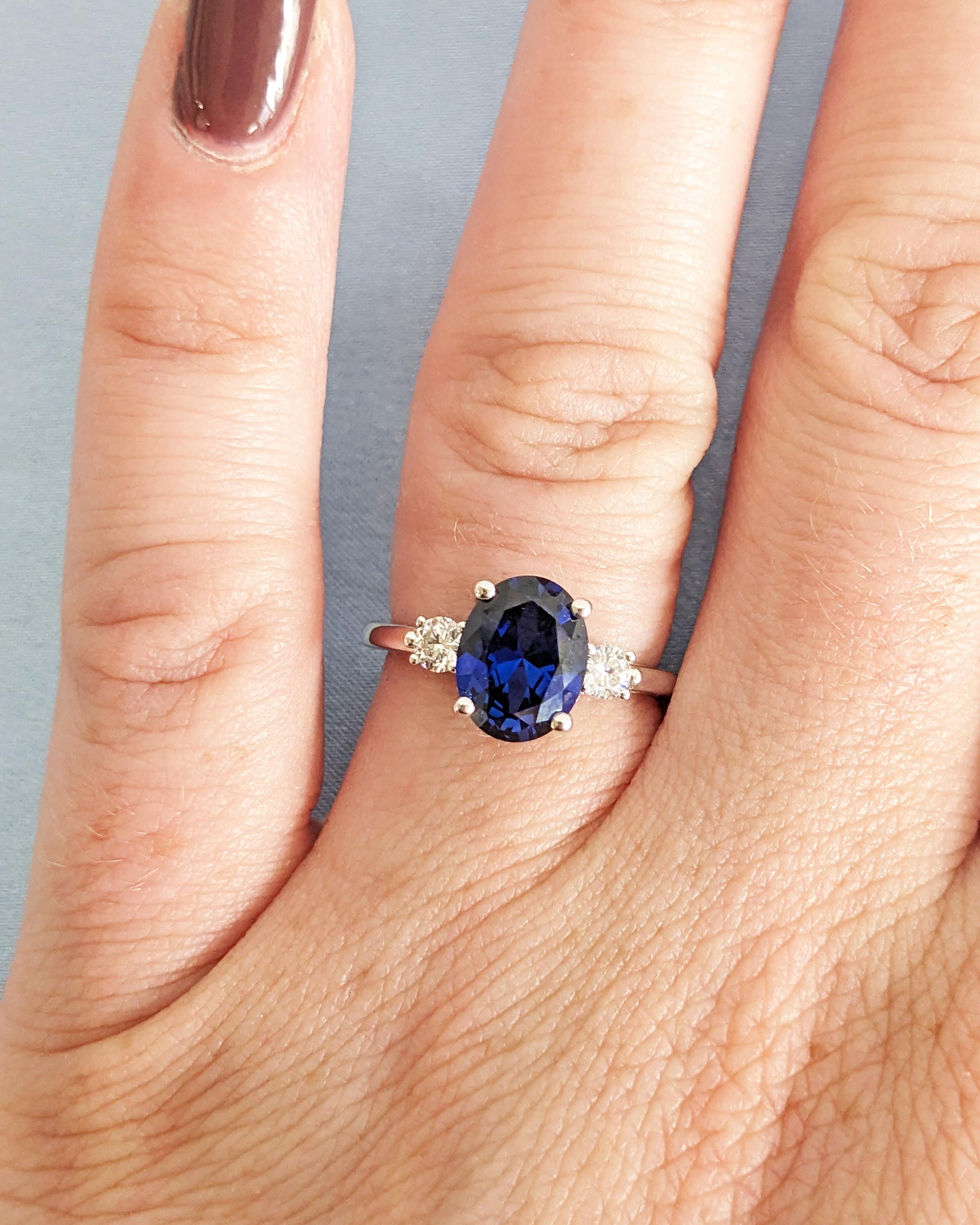 This elegant engagement ring features a captivating oval cut Lab Sapphire at its center. On each side, a single round cut stone, available in Natural Diamond, Lab Grown Diamond, or Moissanite, adds a touch of brilliance and balance. A refined yet striking design, perfect for celebrating love that’s as unique as it is enduring.