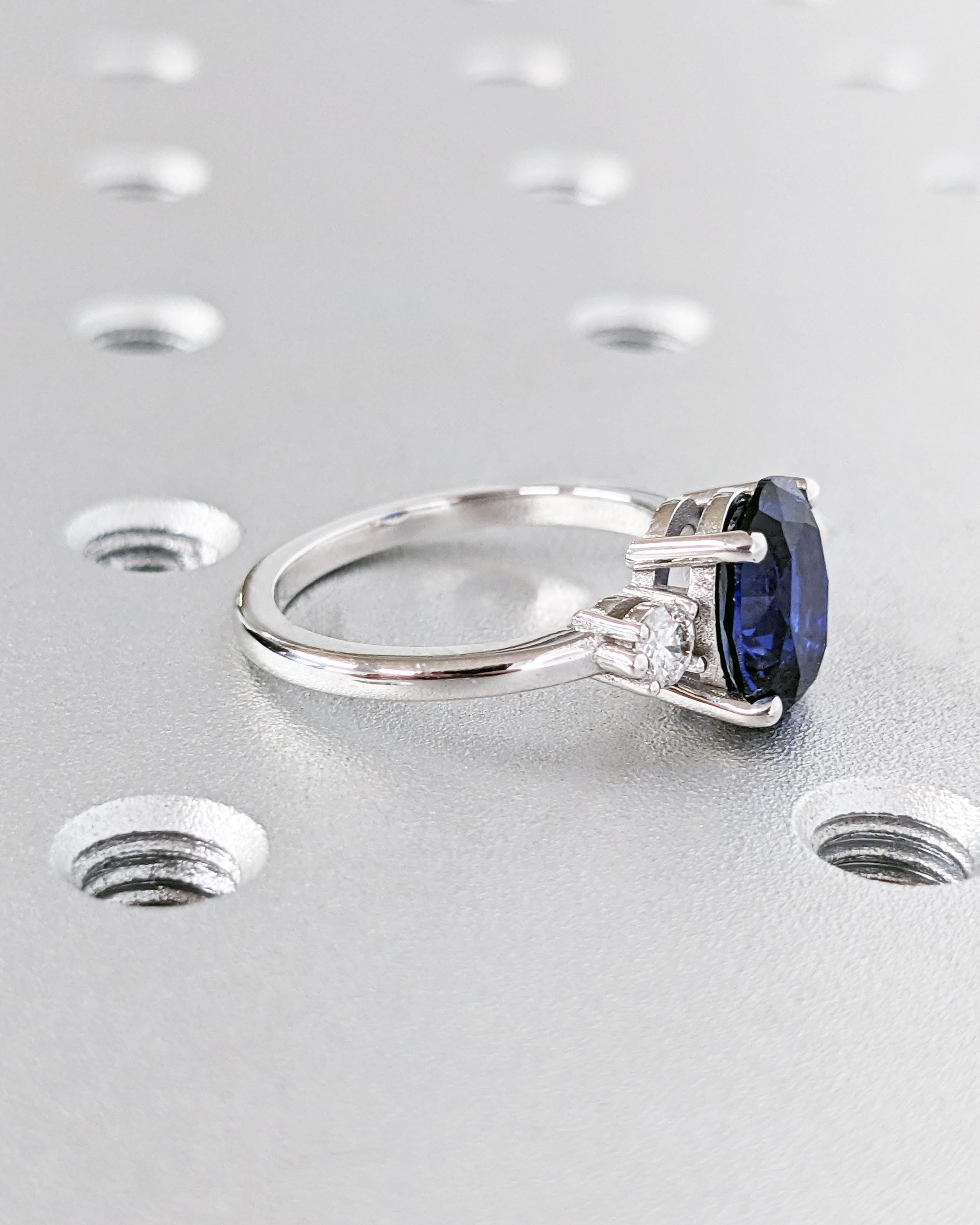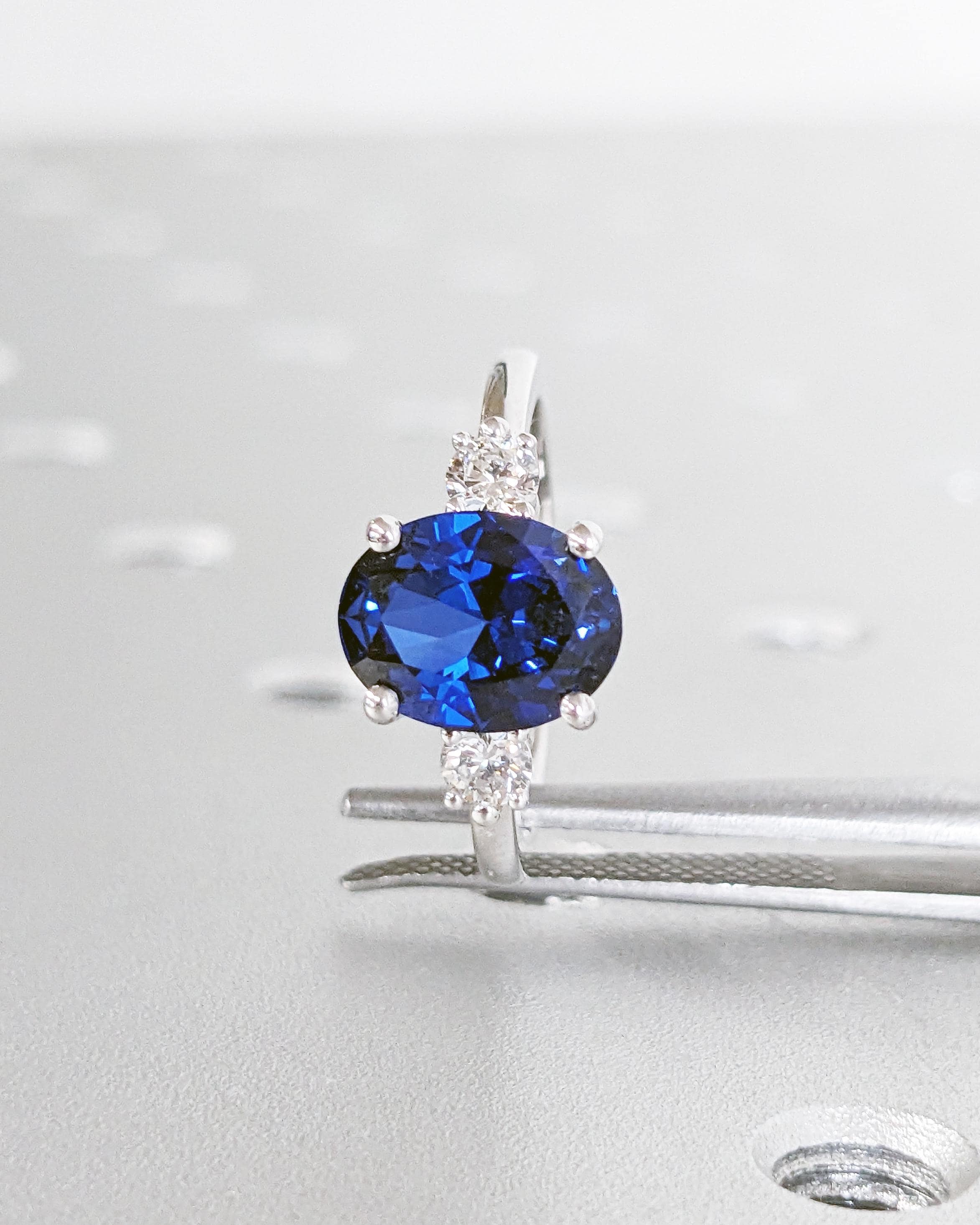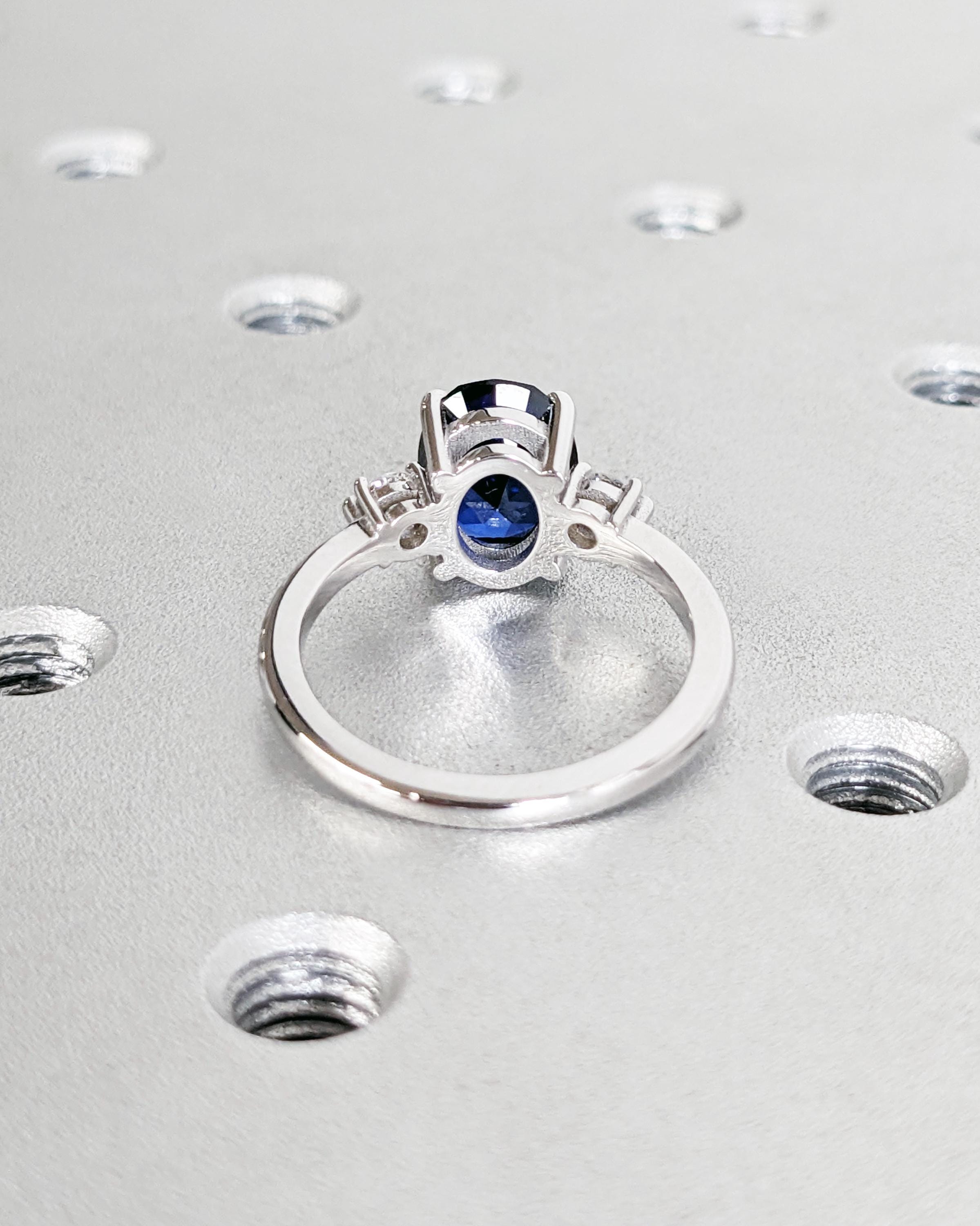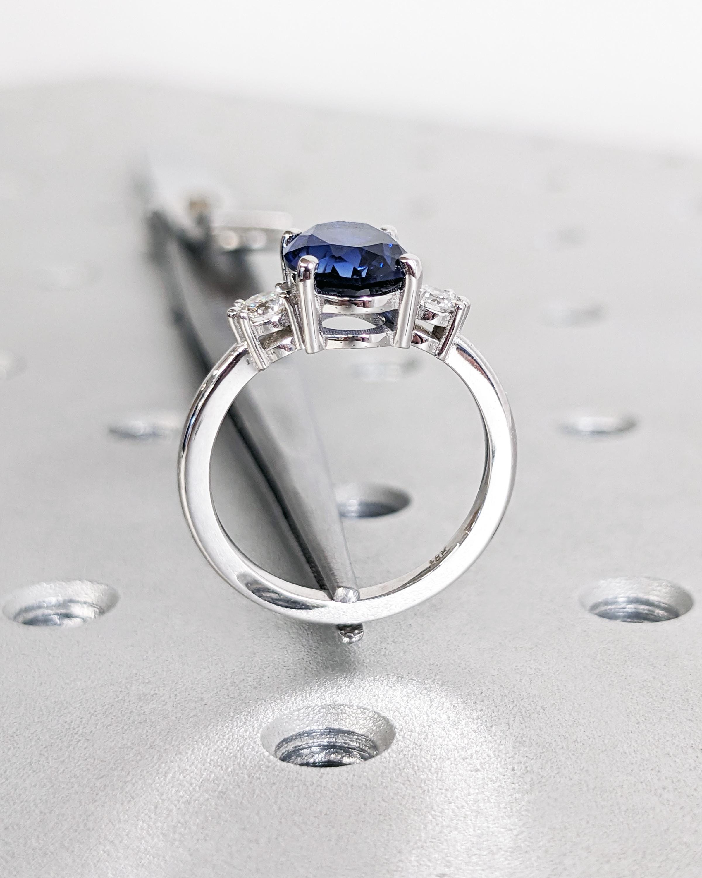 This elegant engagement ring features a captivating oval cut Lab Sapphire at its center. On each side, a single round cut stone, available in Natural Diamond, Lab Grown Diamond, or Moissanite, adds a touch of brilliance and balance. A refined yet striking design, perfect for celebrating love that’s as unique as it is enduring.