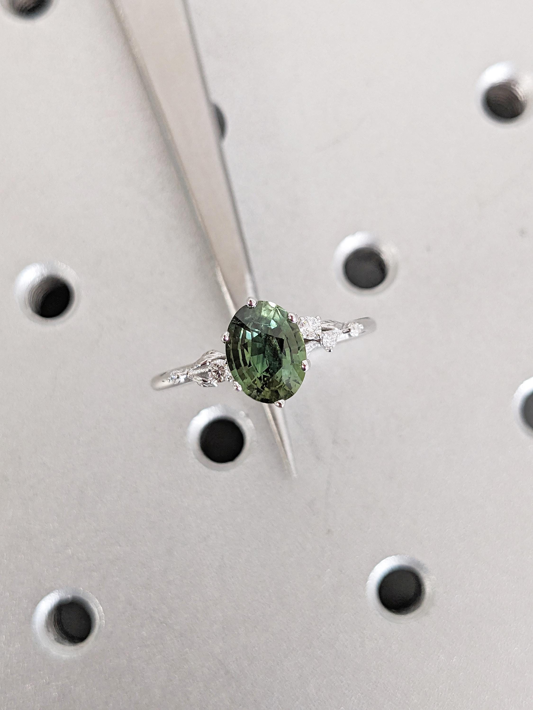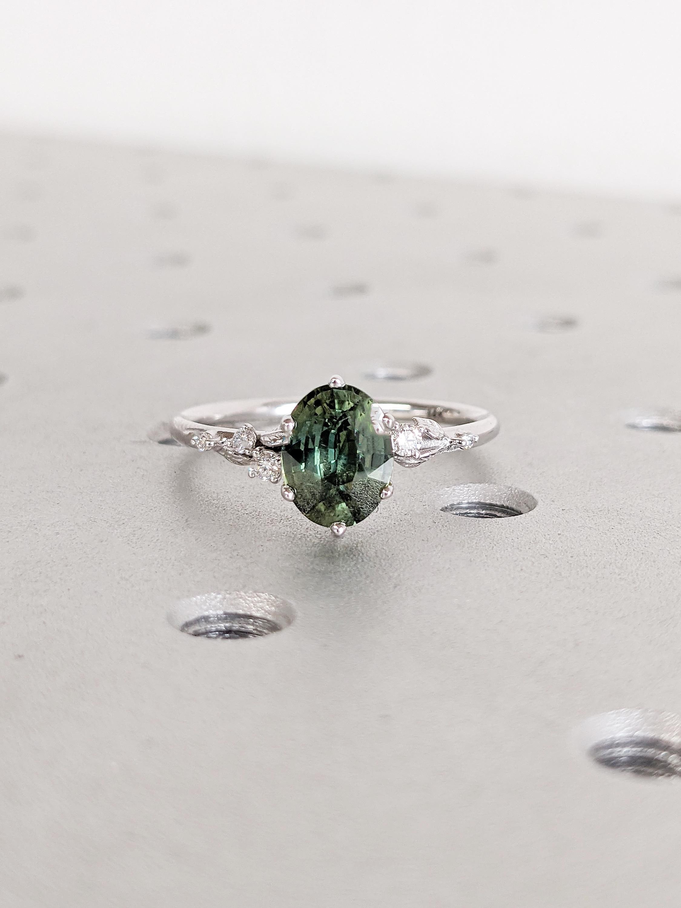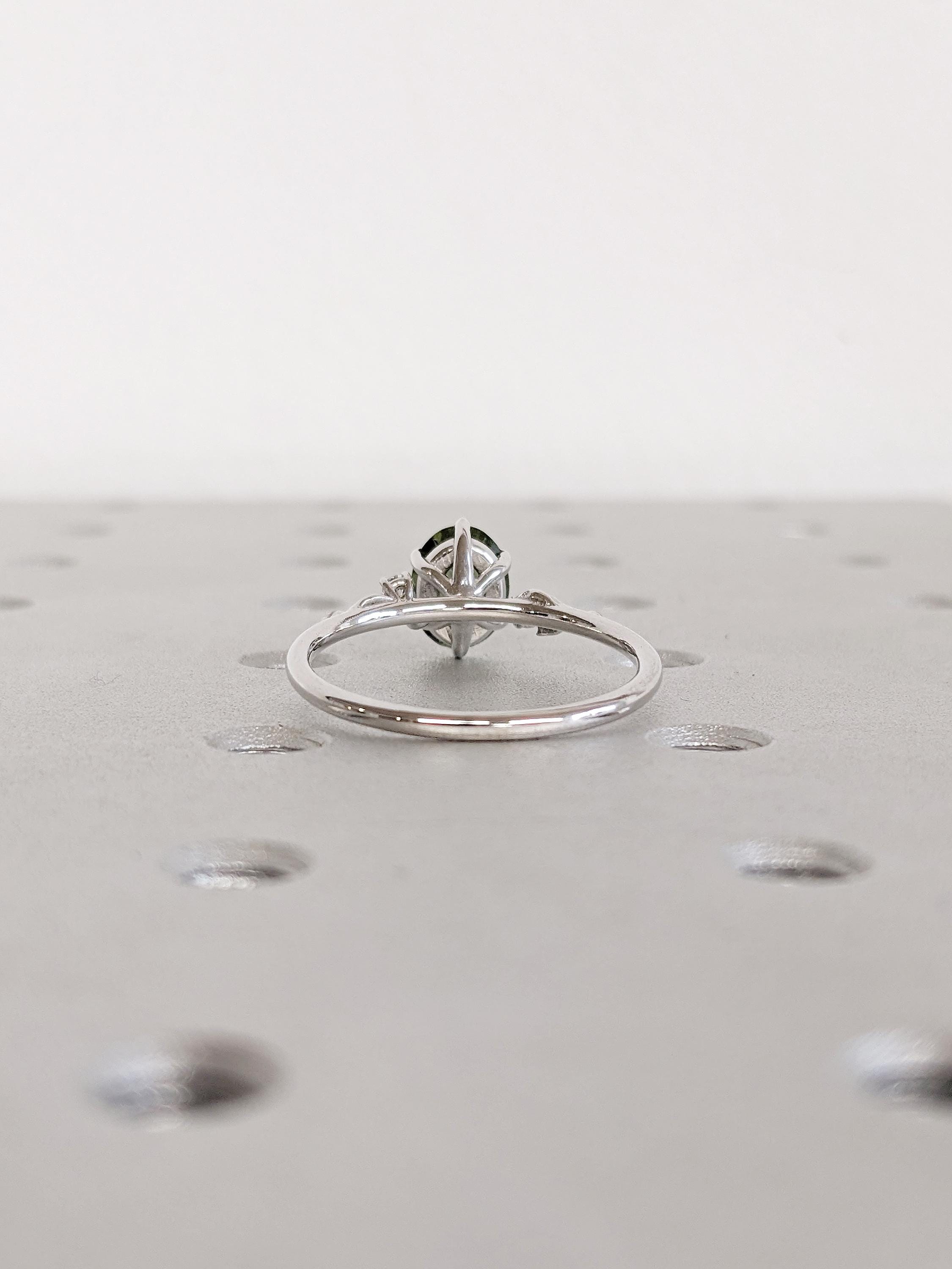 This engagement ring showcases an oval green Peacock Sapphire center stone. The center stone is accented by sparkling side stones, framed with delicate leaf-inspired detailing for a touch of natural elegance. Available with Natural Diamonds, Lab Grown Diamonds, or Moissanite, this design is a timeless yet unique symbol of love.