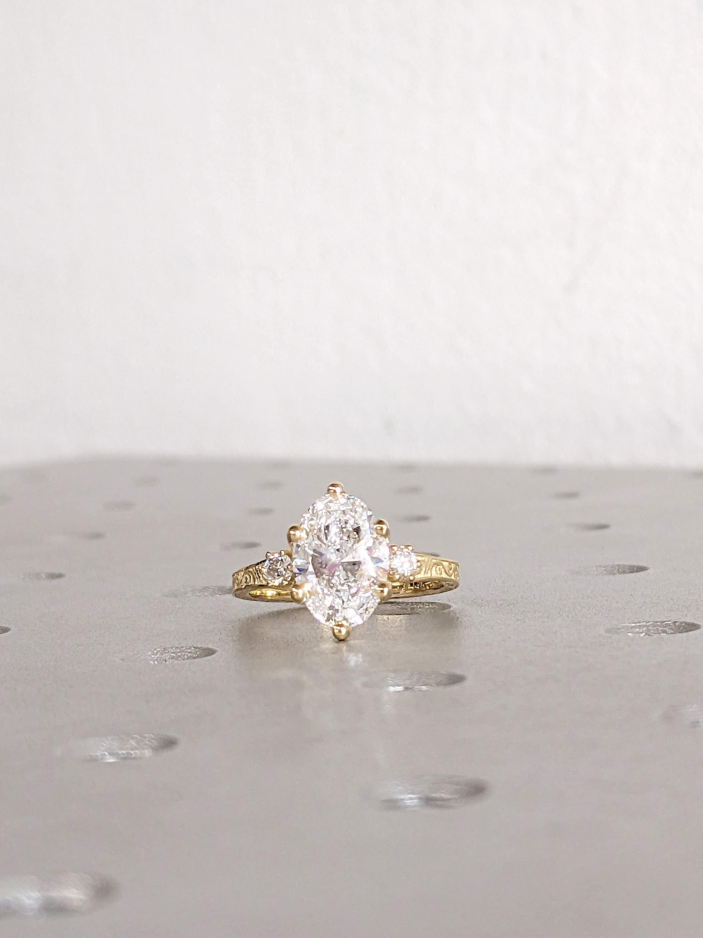 This Oval Lab Diamond engagement ring has a brilliant Lab Diamond center stone in a prong setting, accented by round side stones in Natural Diamond, Lab Grown Diamond, or Moissanite. The elegant sparkle and timeless design make it ideal for engagement, bridal, anniversary, or everyday wear, symbolizing pure love and lasting beauty.