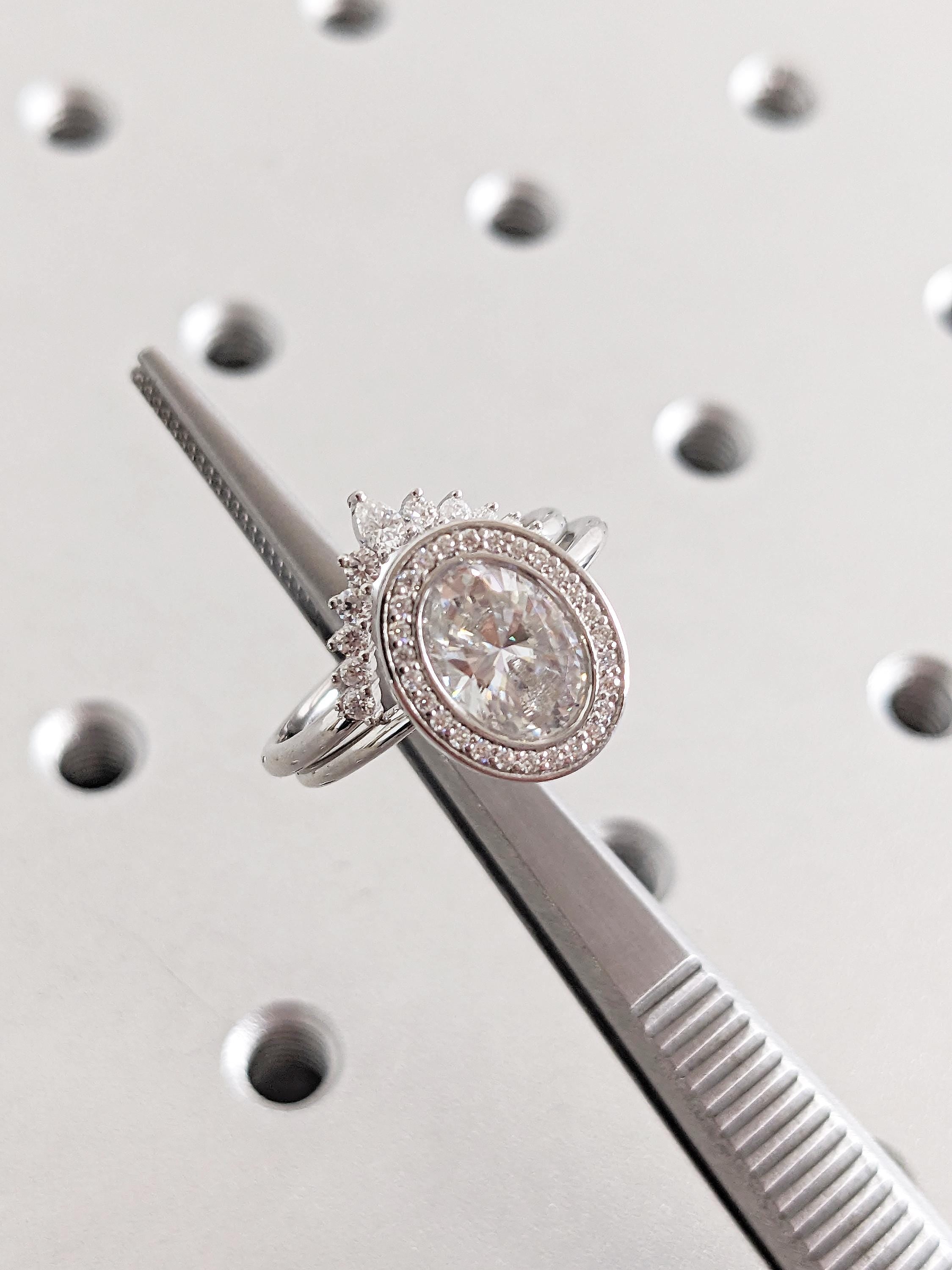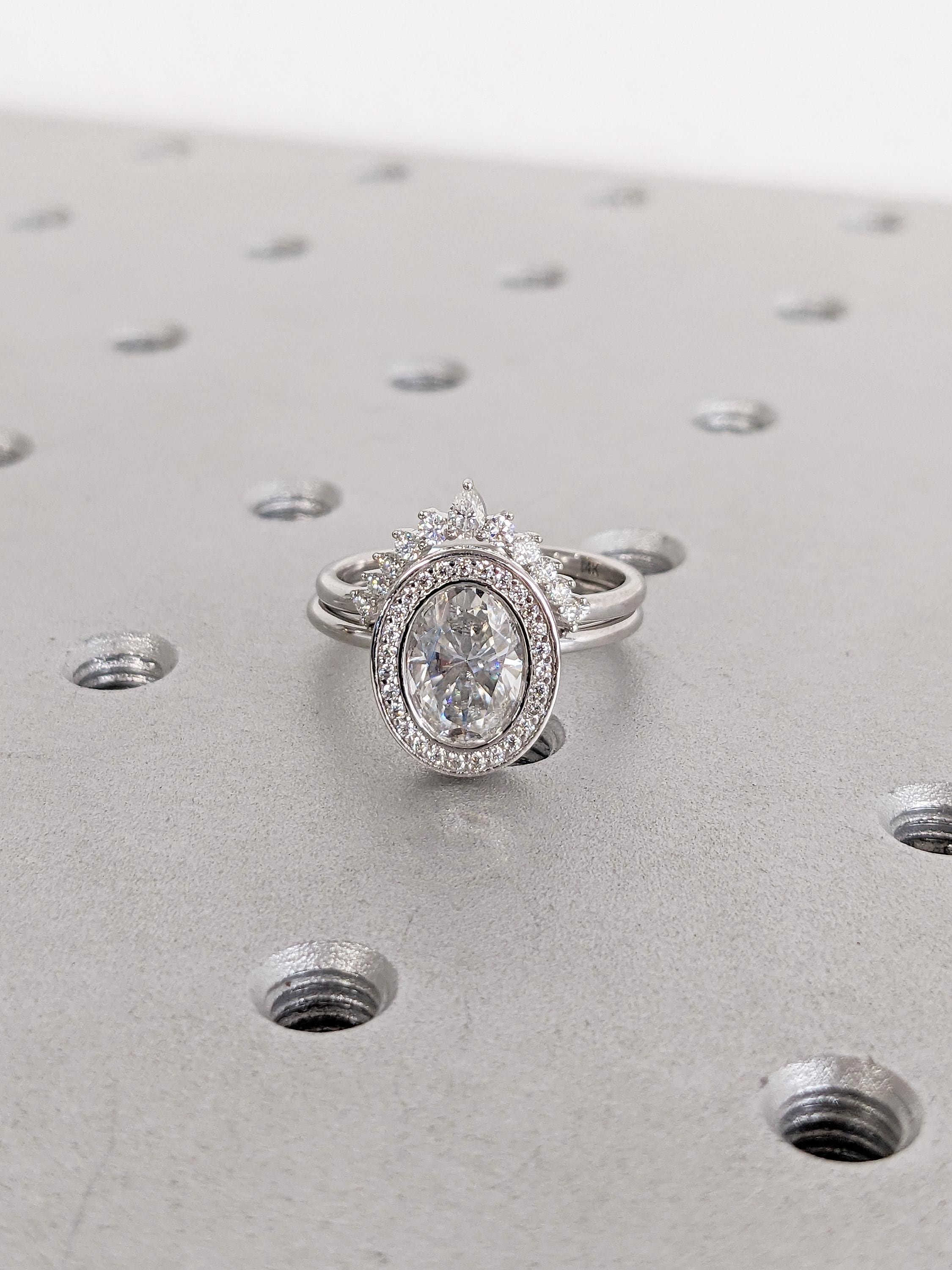 This timeless bridal set features a stunning oval cut Lab Grown Diamond engagement ring, elegantly set in a sleek bezel setting and surrounded by a radiant halo of Lab Grown Diamonds for added brilliance. Designed for lasting beauty and sophistication, the ring blends modern refinement with classic charm. Paired with a minimalist curved crown wedding band adorned with pear and round cut Lab Grown Diamonds, it perfectly complements the engagement ring. Together, this exquisite set symbolizes effortless elegance and a love that shines forever.
