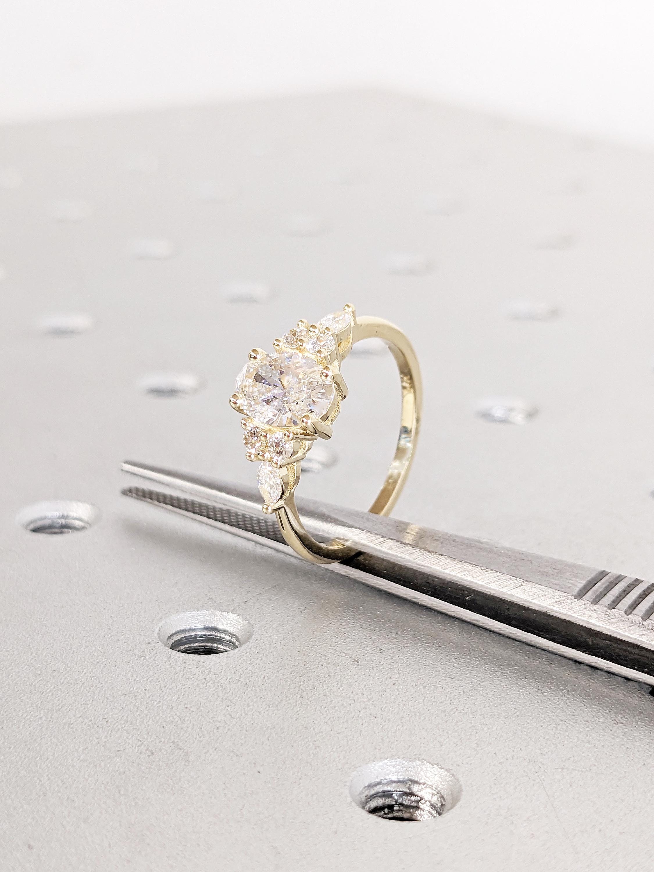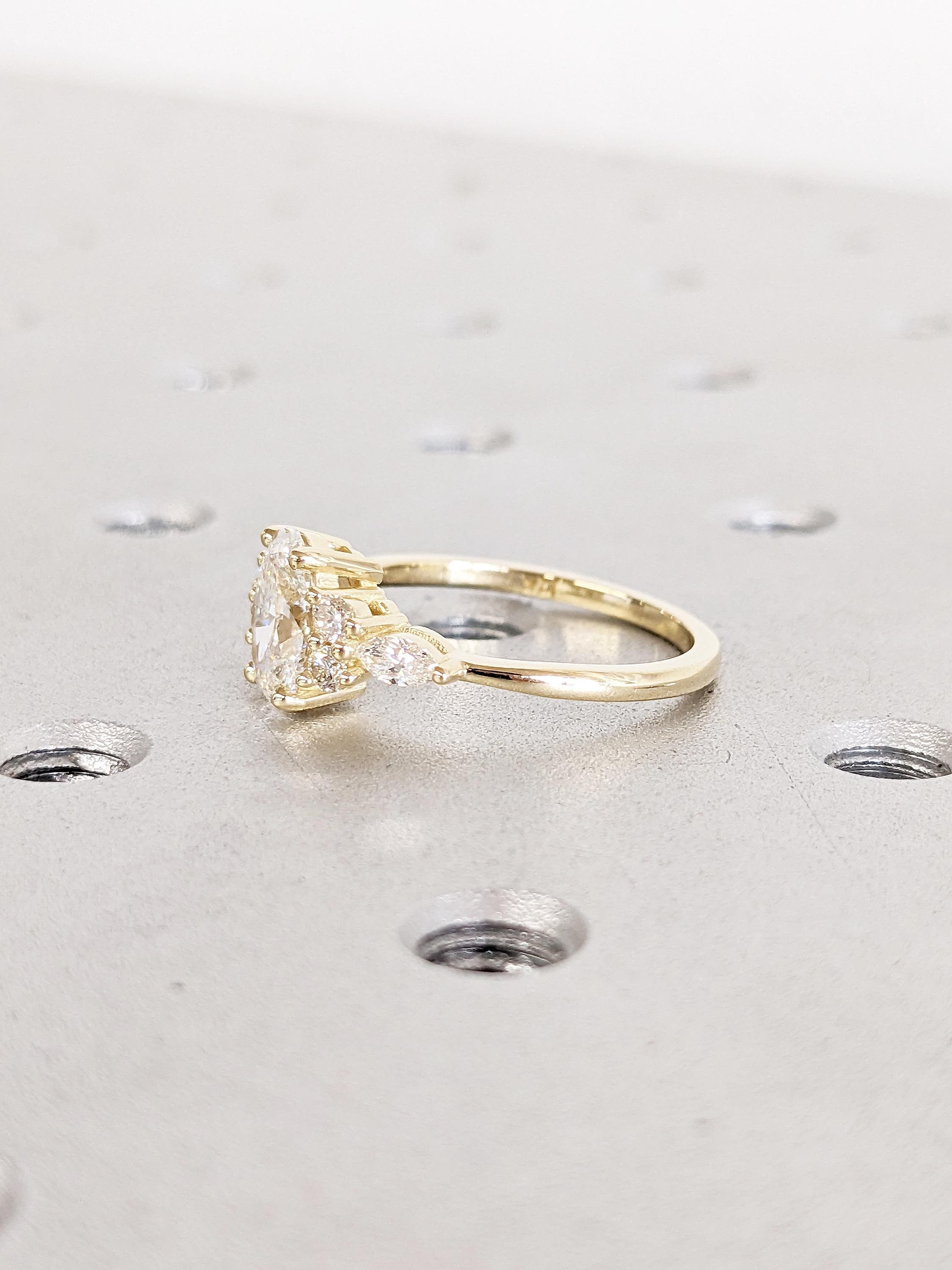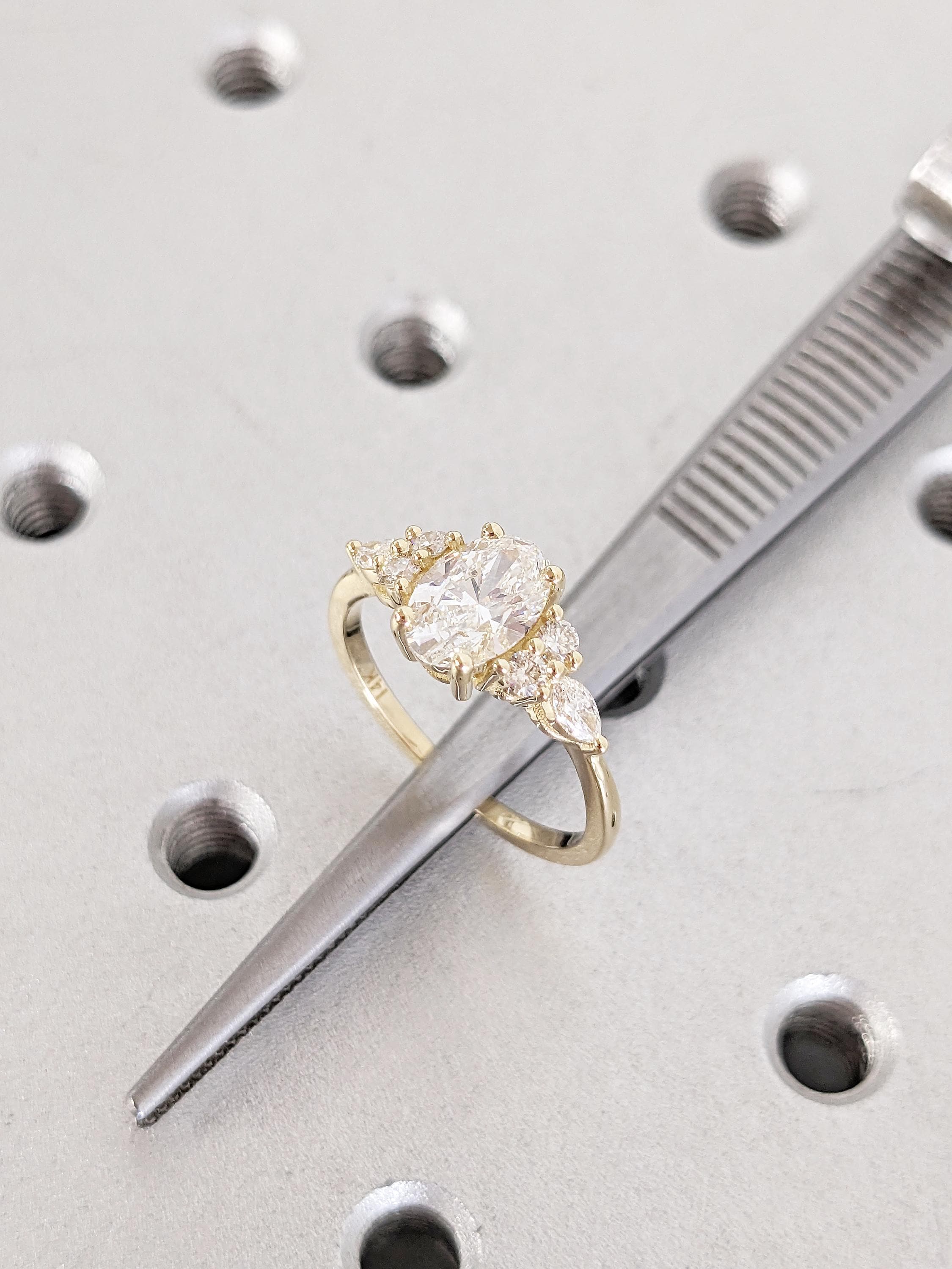 Elevate your collection with our breathtaking oval cut Moissanite ring, beautifully accented by delicate clusters of marquise and round side stones. Choose between the radiant brilliance of Natural Diamonds or the refined sparkle of Moissanite to suit your style.