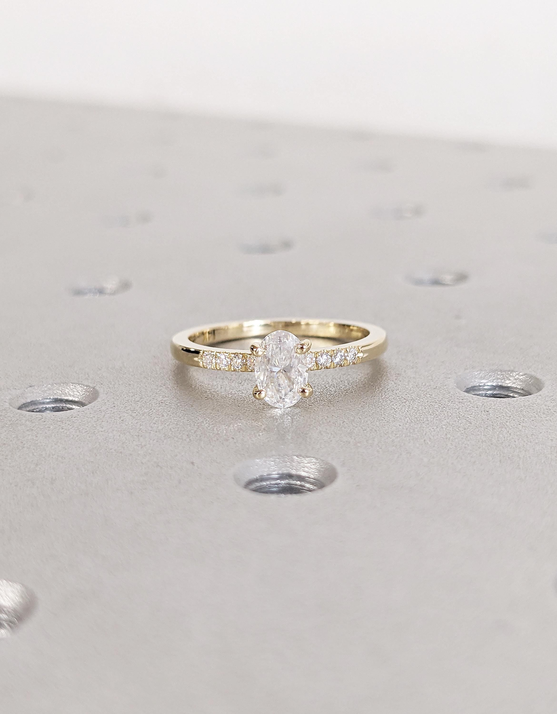 This stunning engagement ring showcases an oval cut Moissanite center stone with four pave accents on each side for added sparkle. It is set in a sleek gold band and offers a timeless and elegant look. The side stones are available in Natural Diamonds, Lab Grown Diamonds, or Moissanite to suit your perfect proposal.