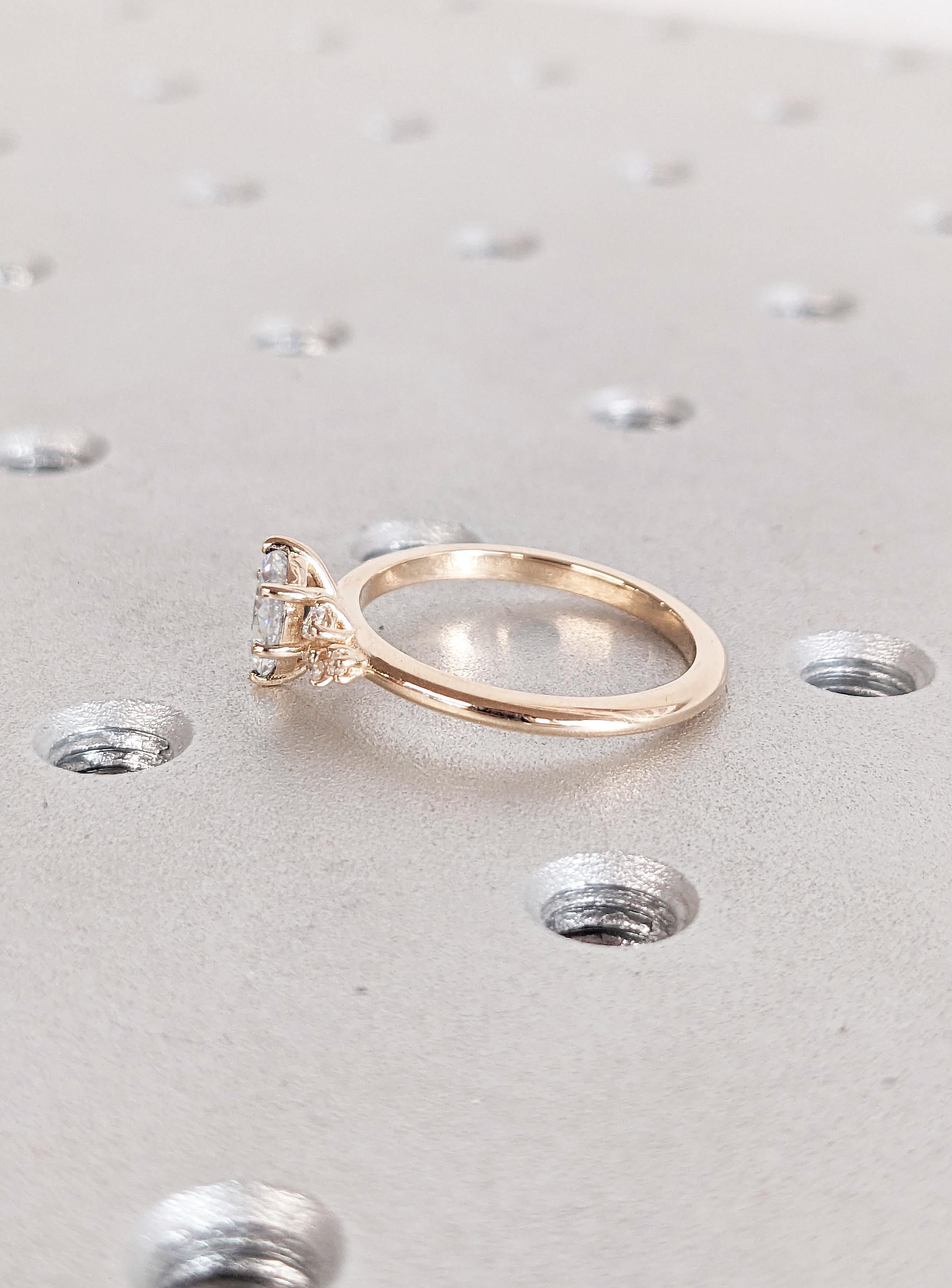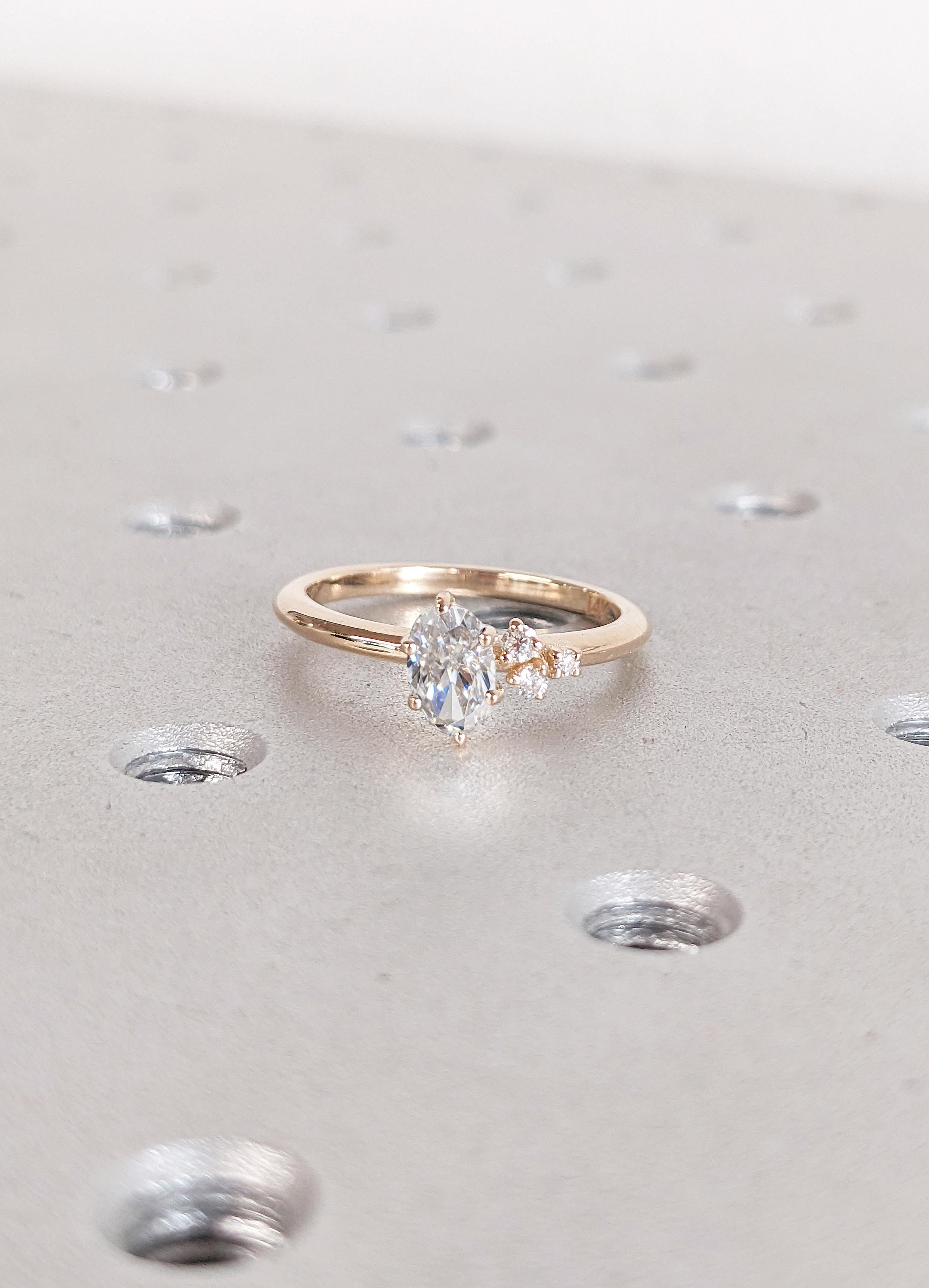Elegant and enchanting, this ring features an oval cut Moissanite in a delicate six-prong setting. The center stone is complemented by a unique cluster of Natural Diamonds, Lab-Grown Diamonds, or Moissanite of your choice, gracefully adorning one side of the band. This exquisite piece is a timeless statement of beauty and a perfect blend of sophistication and individuality.