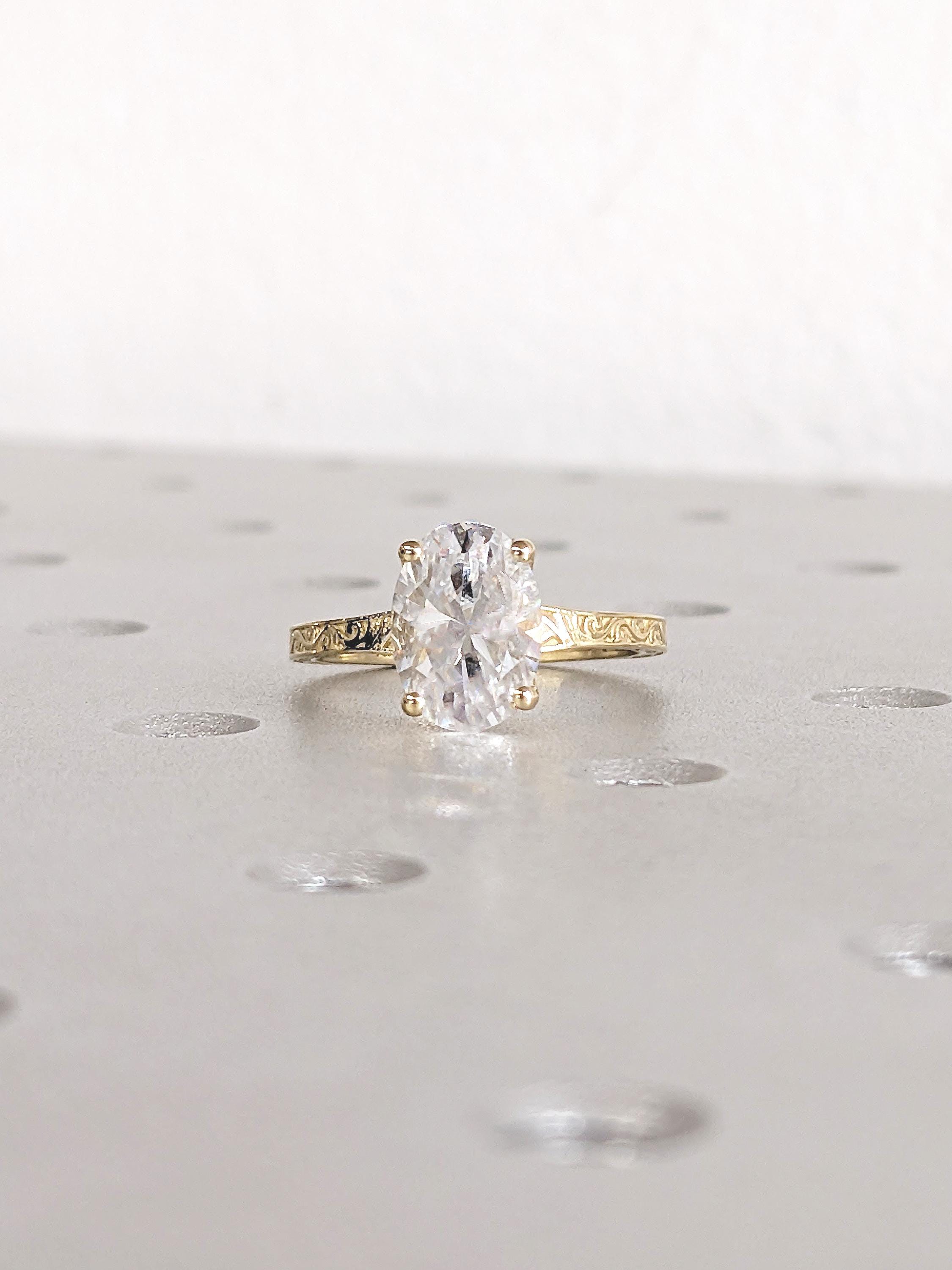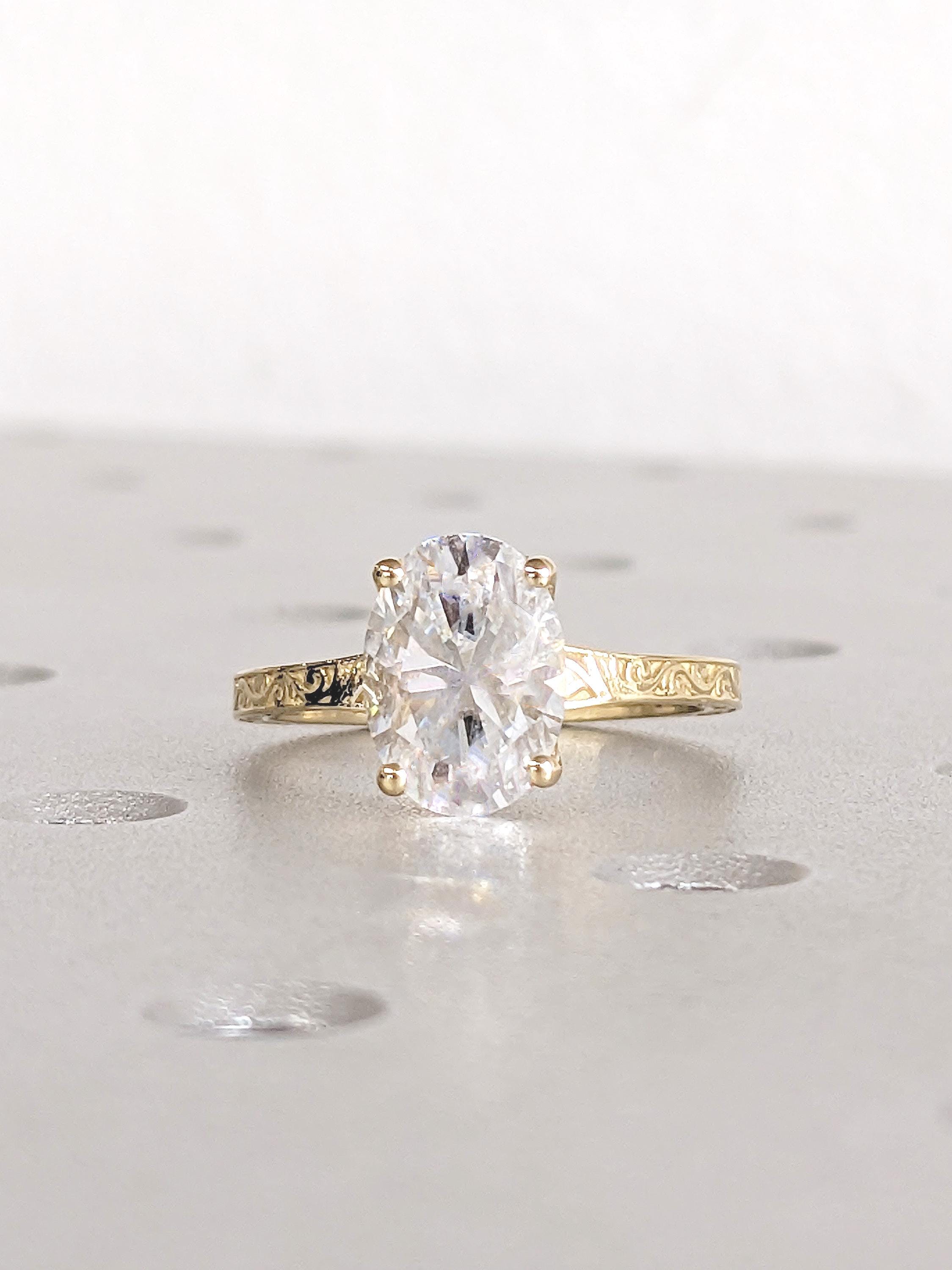 This elegant engagement ring features an oval cut Moissanite set in a timeless solitaire design. Crafted in gold, the band is adorned with intricate filigree detailing that adds vintage charm and delicate sophistication. A perfect blend of classic beauty and artisan craftsmanship.