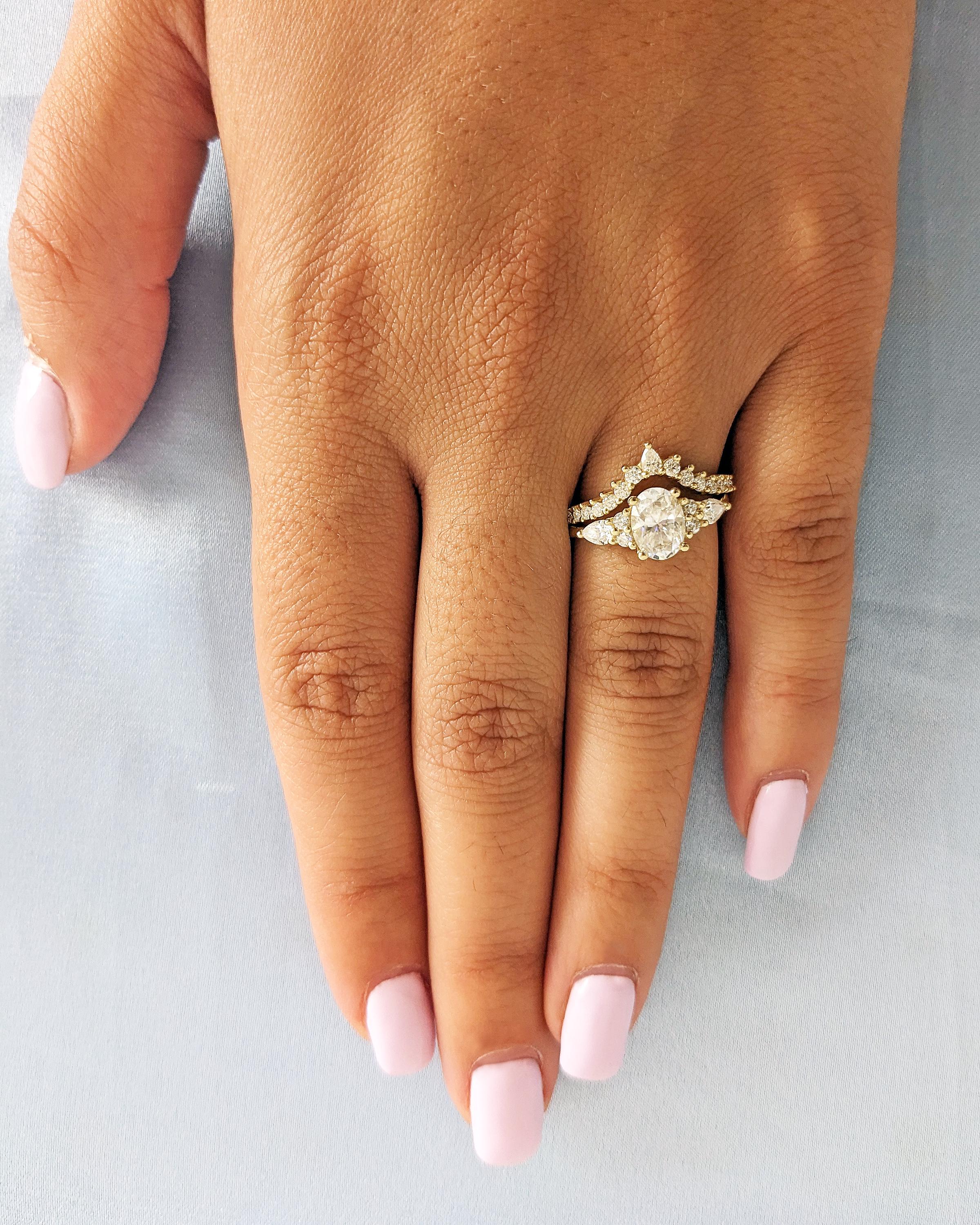 This ornate, vintage-inspired luxury ring features a prong center setting with oval shaped Moissanite, highlighted by prong set Moissanites on a delicate gold band. Can match with a unique curved Moissanite band.