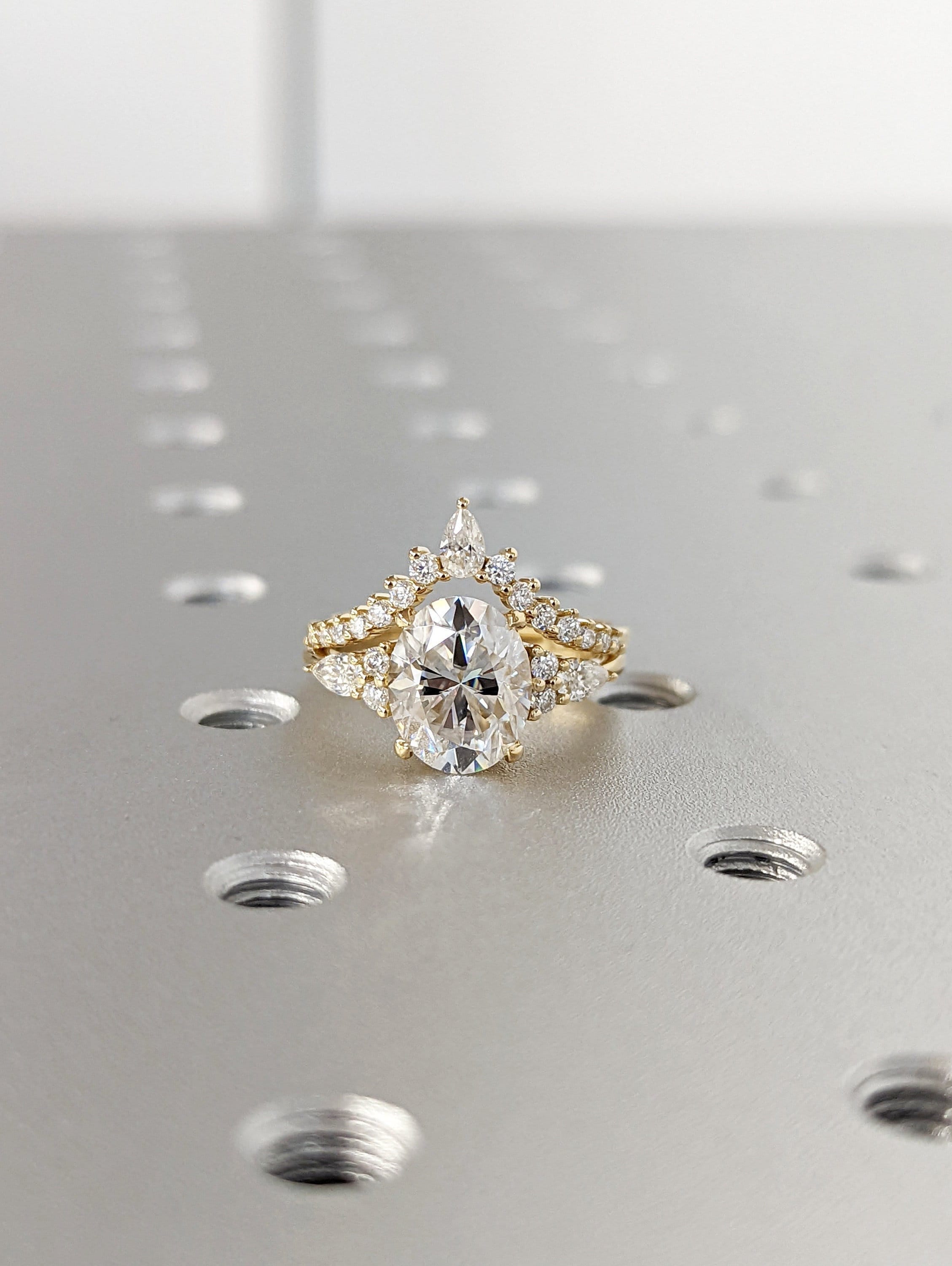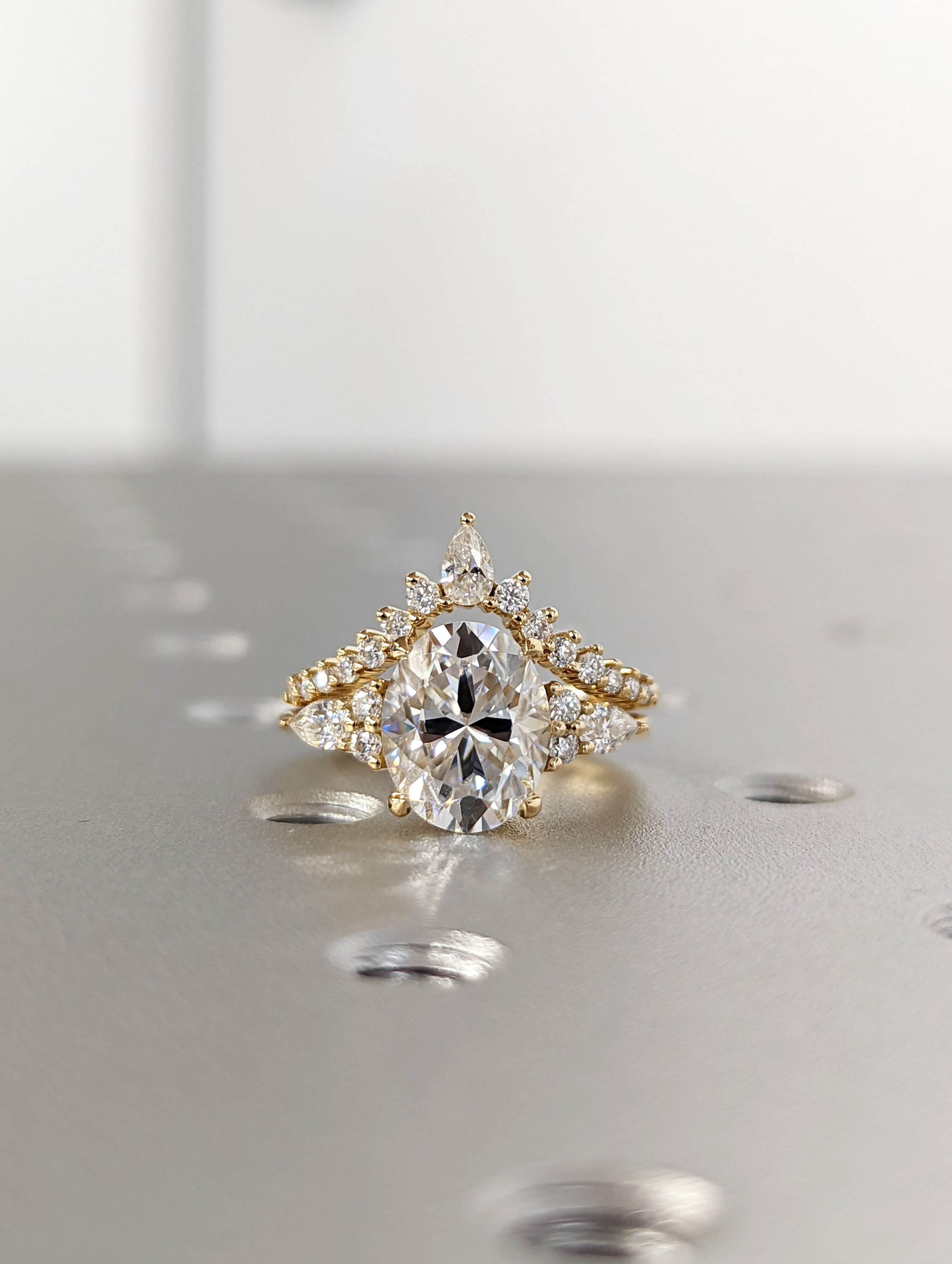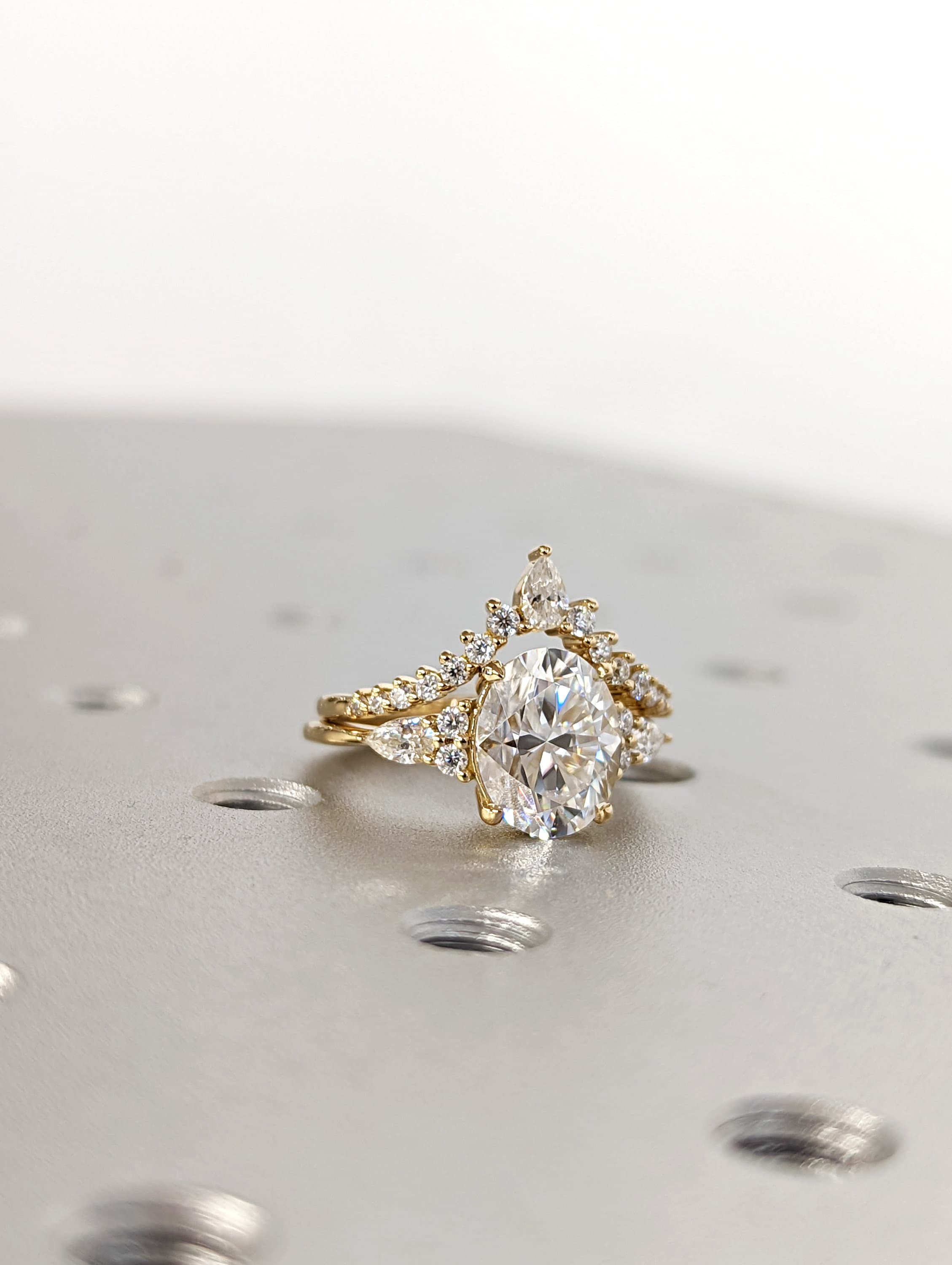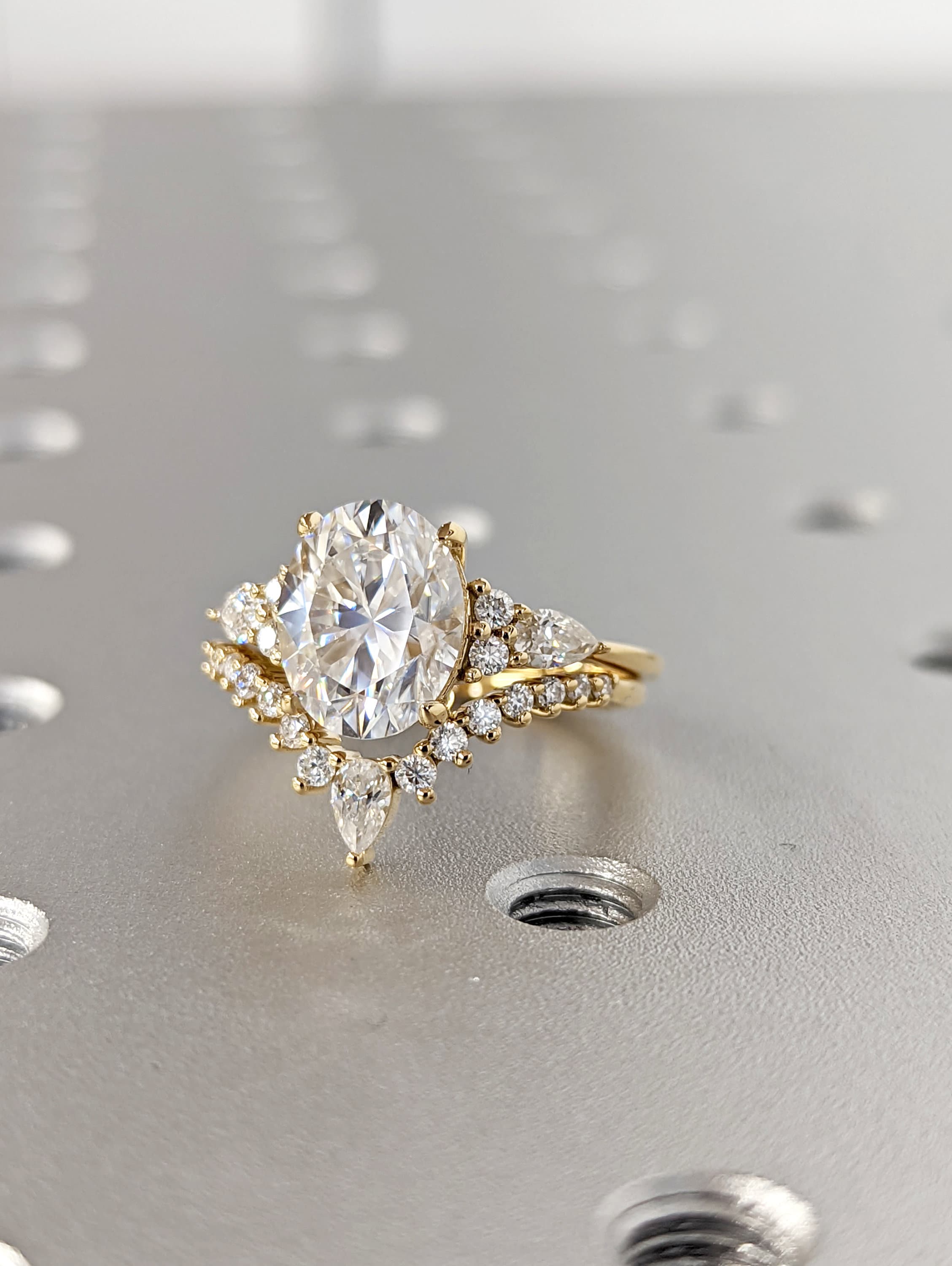 Oval cut Moissanite Engagement Ring set, Stacking ring, 14K/18K Rose Gold, vintage Unique pear moissanite Cluster ring women, Bridal set