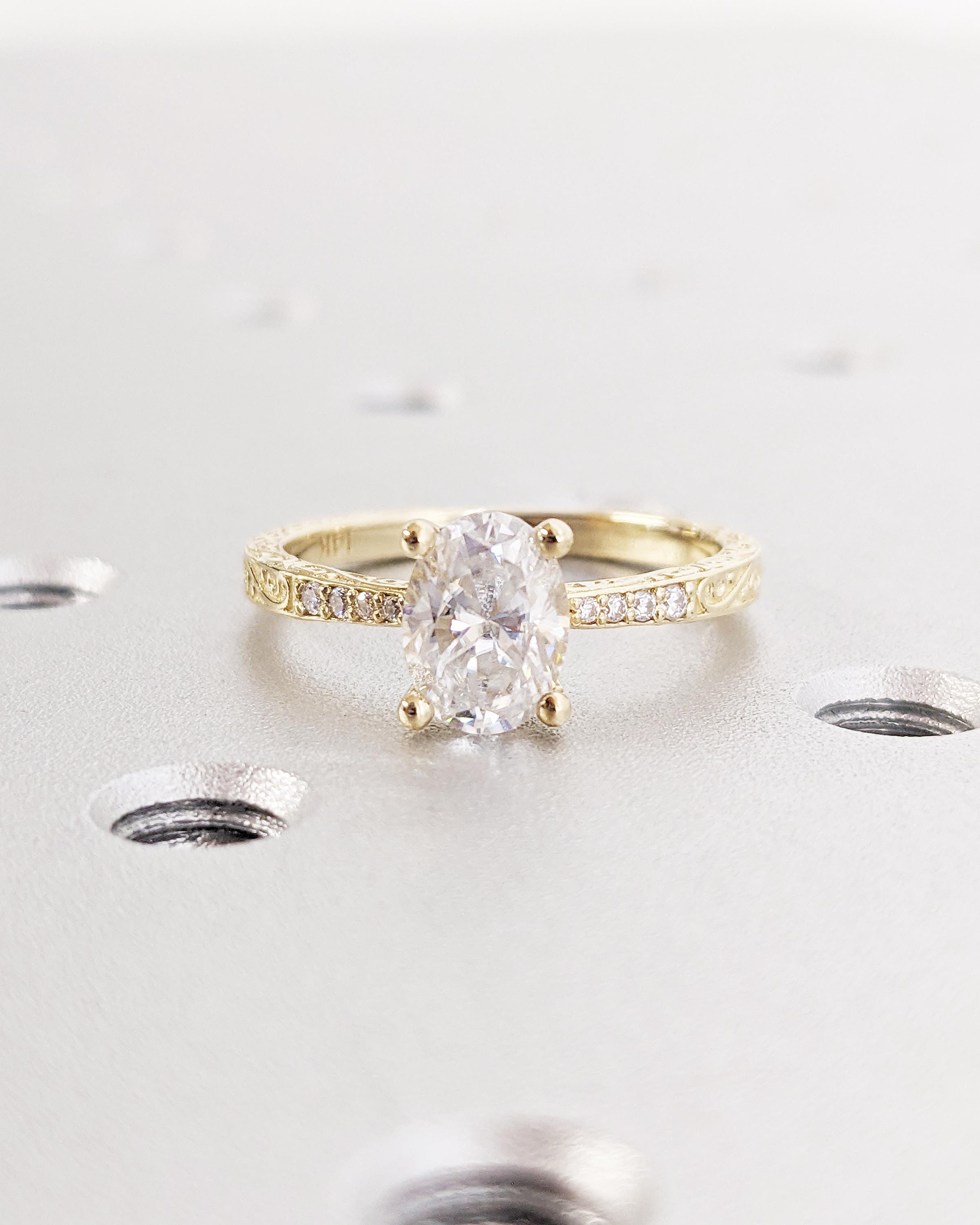 This exquisite handcrafted engagement ring combines vintage charm with modern sophistication, featuring a tapered band that gracefully leads to a solitaire oval cut moissanite in a basket prong setting. The band is adorned with intricate filigree details and your choice of natural diamond, lab diamond or moissanite side stones.