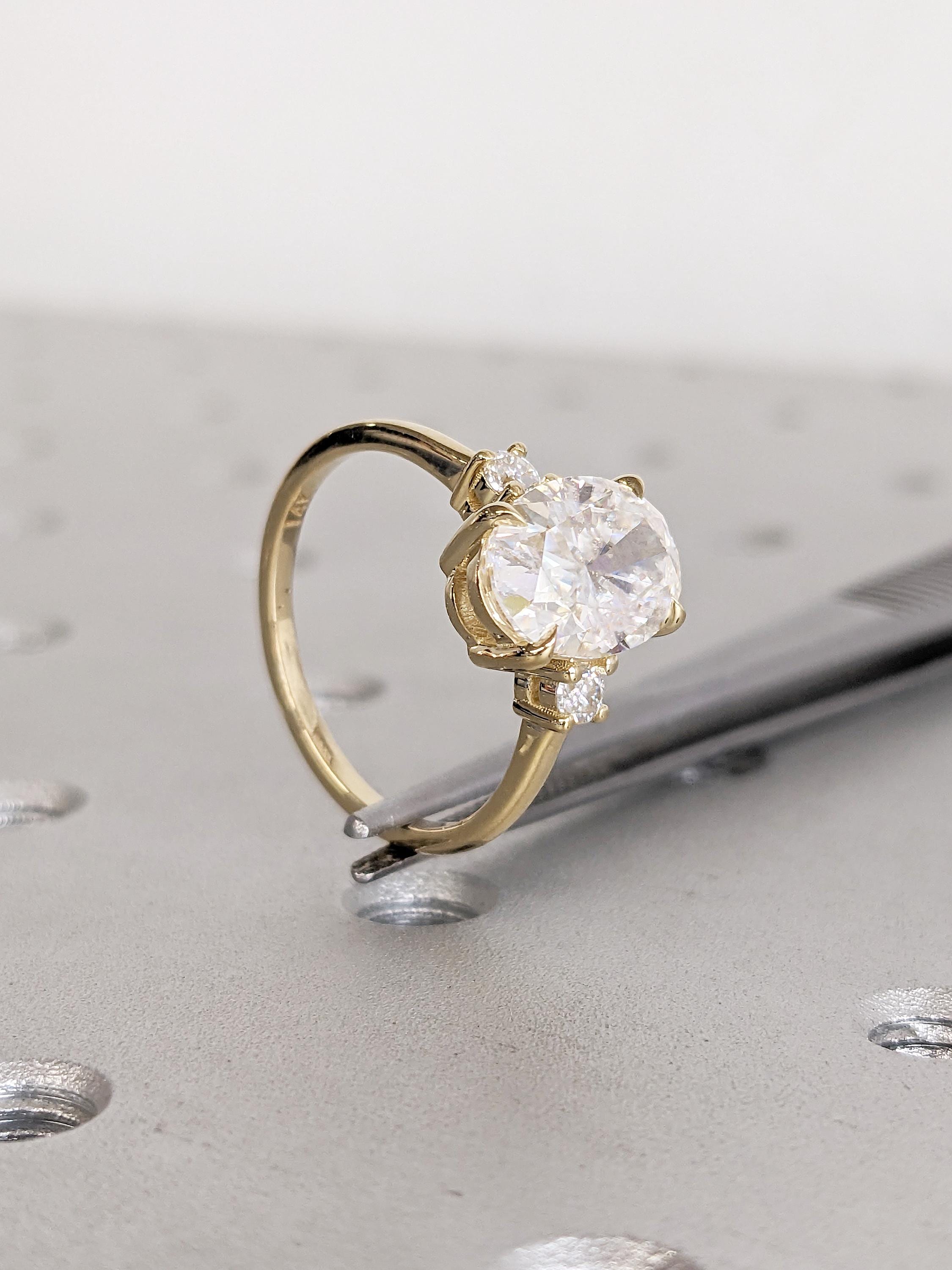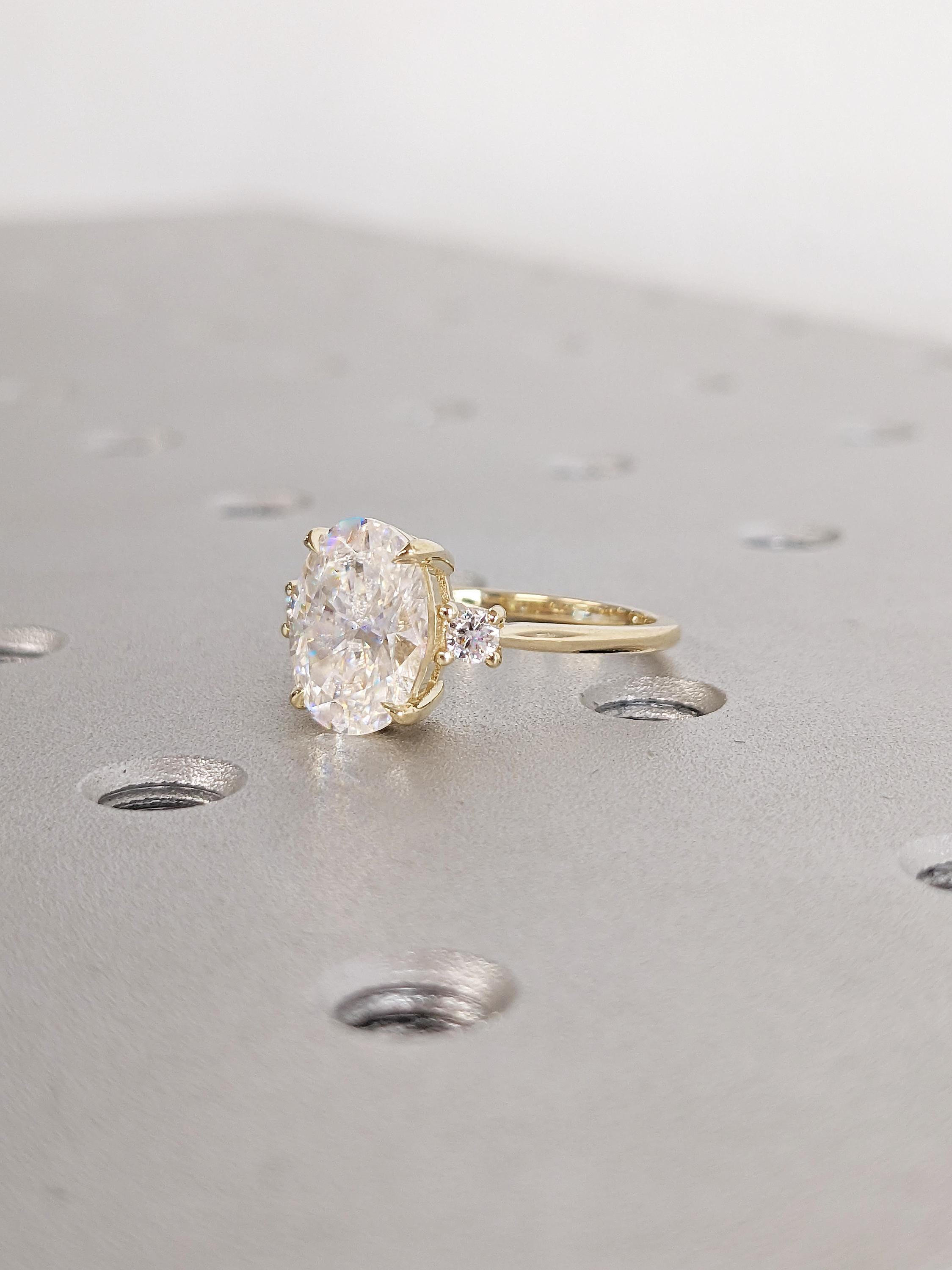 This stunning engagement ring features an oval cut Moissanite center stone, elegantly secured in a talon prong setting for a sleek and modern look. Flanking the center stone are two round accent gems, available in your choice of Natural Diamonds, Lab Grown Diamonds, or Moissanites, adding extra brilliance and depth. The thoughtfully crafted design balances timeless sophistication with contemporary elegance, making it a perfect symbol of your enduring love.