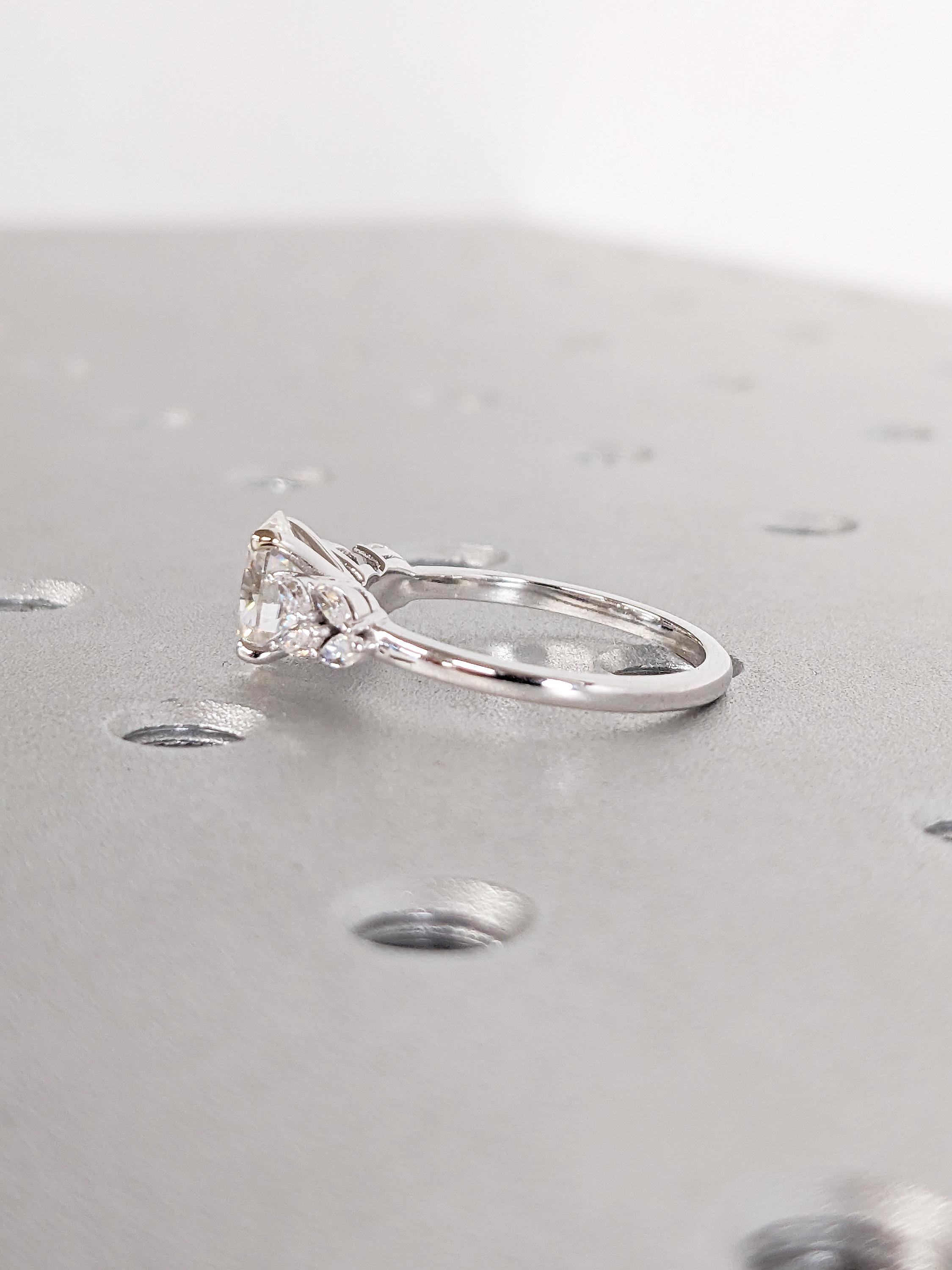 This elegant ring features a sparkling oval cut Moissanite as its centerpiece, held by four prongs. Flanking the center stone are marquise cut gems available in Natural Diamonds, Lab Grown Diamonds, or Moissanites arranged in a leaf-like cluster design, adding a graceful, nature-inspired touch. Its timeless yet whimsical aesthetic makes it perfect for someone who loves a romantic and refined look.