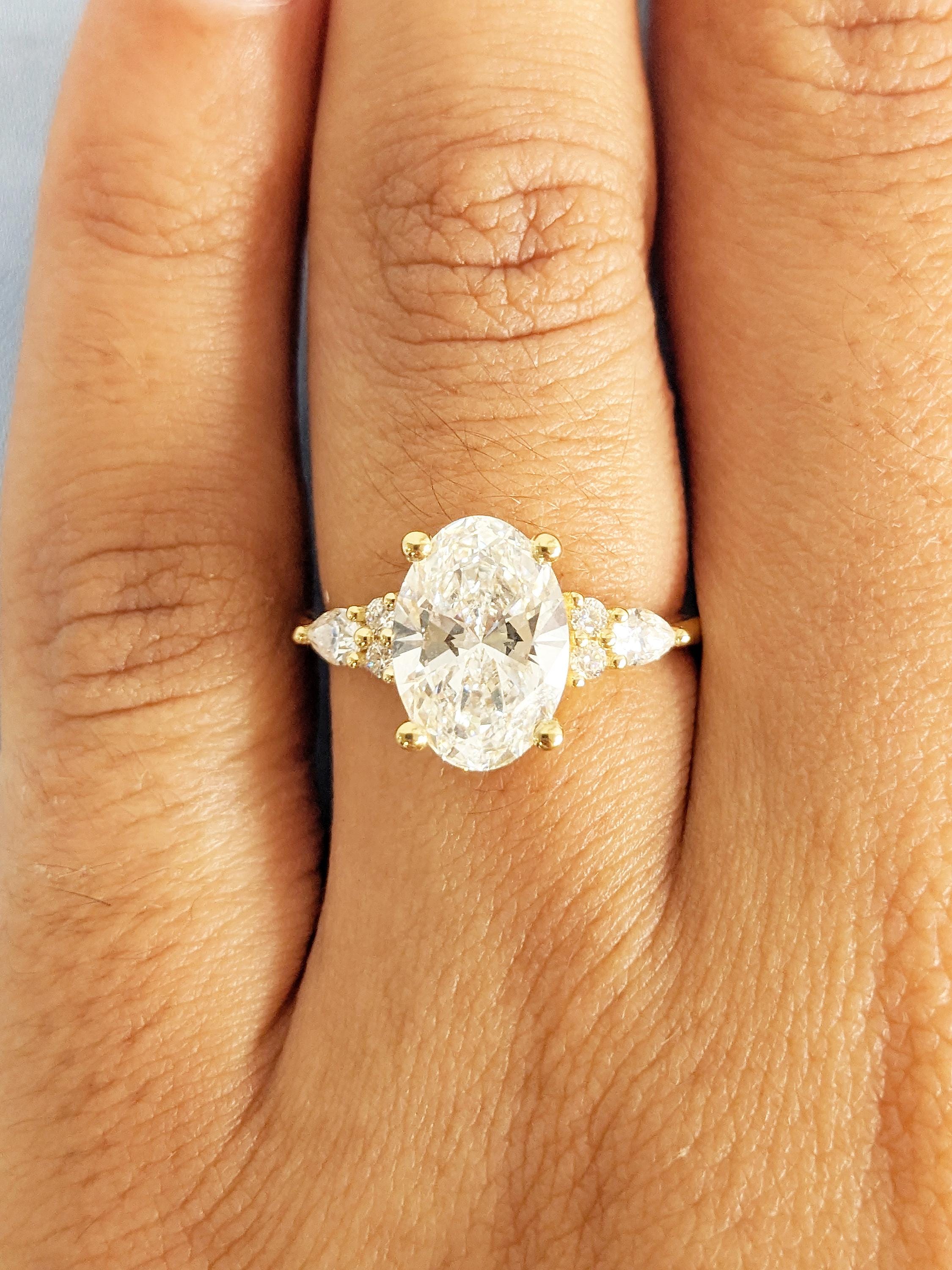 Oval Moissanite Ring, Art Deco 18k Solid Gold Engagement Ring, Unique Moissanite Cluster Personalized Statement Ring for Her, Bridal Jewelry