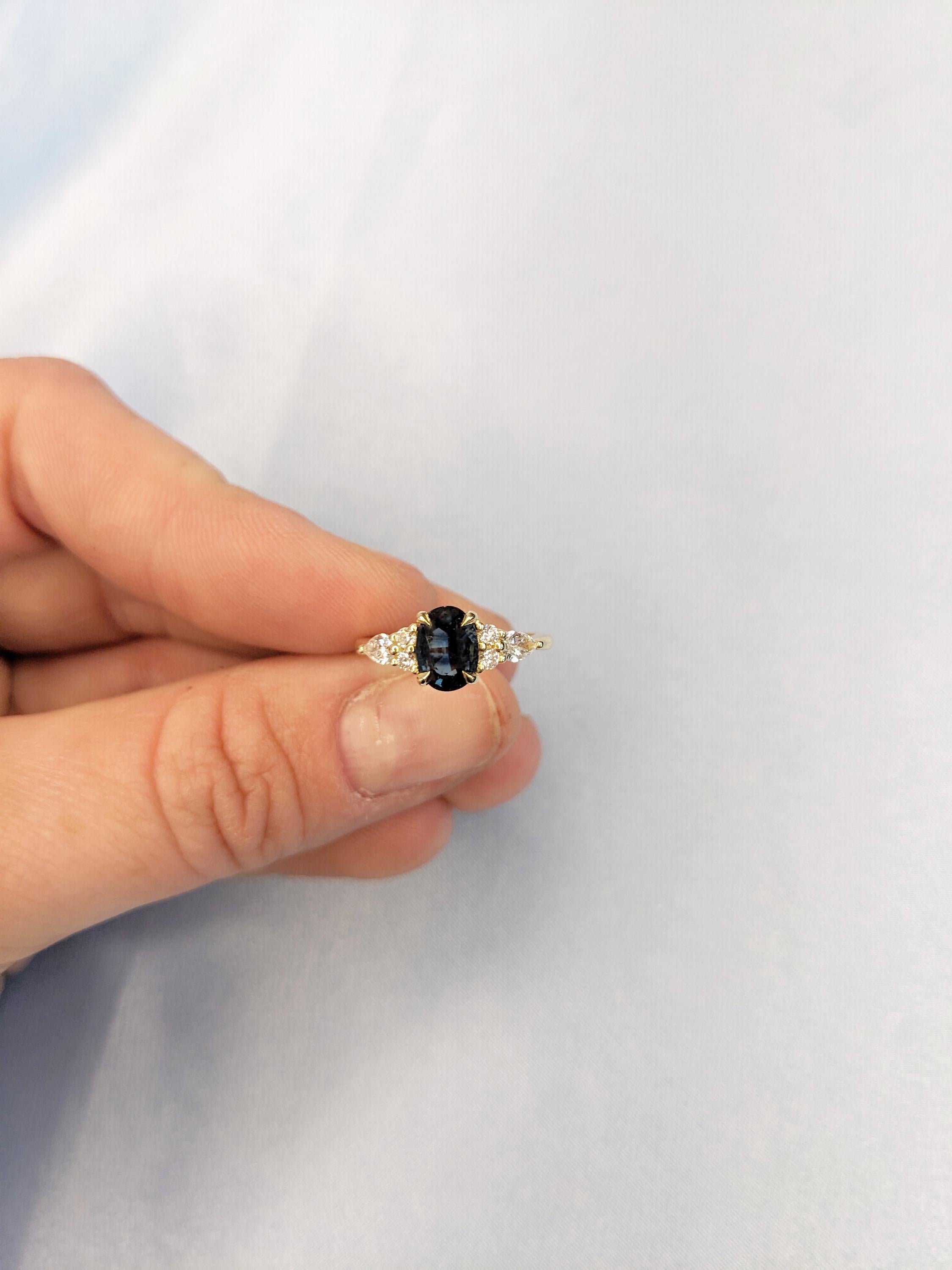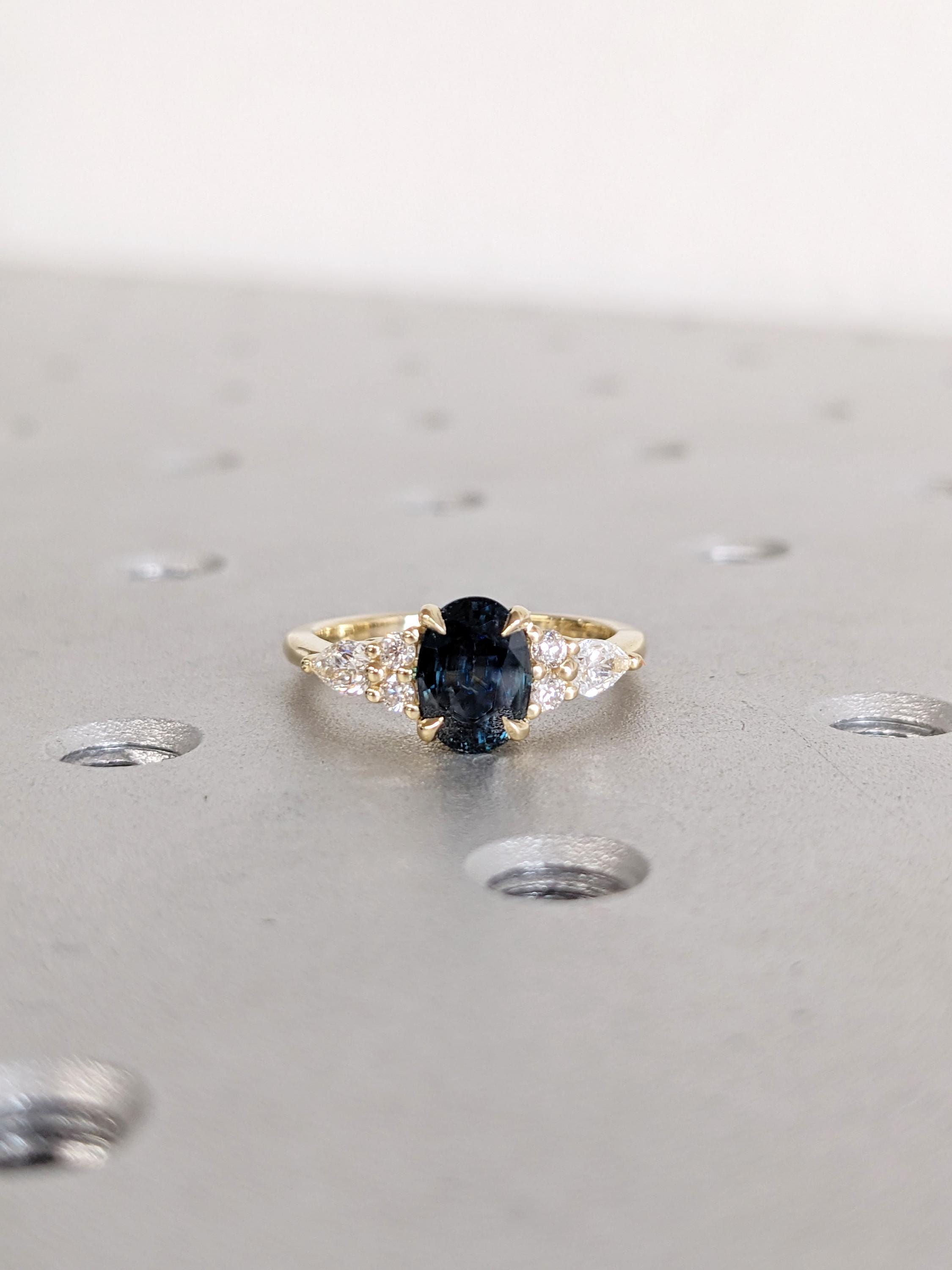 This Peacock Sapphire Engagement Ring brings a Natural Sapphire center stone in an oval cut with a talon prong setting, paired with pear and round side stones available in Natural Diamond, Lab Grown Diamond or Moissanite that add soft sparkle. The rich green-blue peacock tone creates a romantic and elegant style, perfect for an engagement ring, bridal gift, anniversary moment, or meaningful everyday wear.