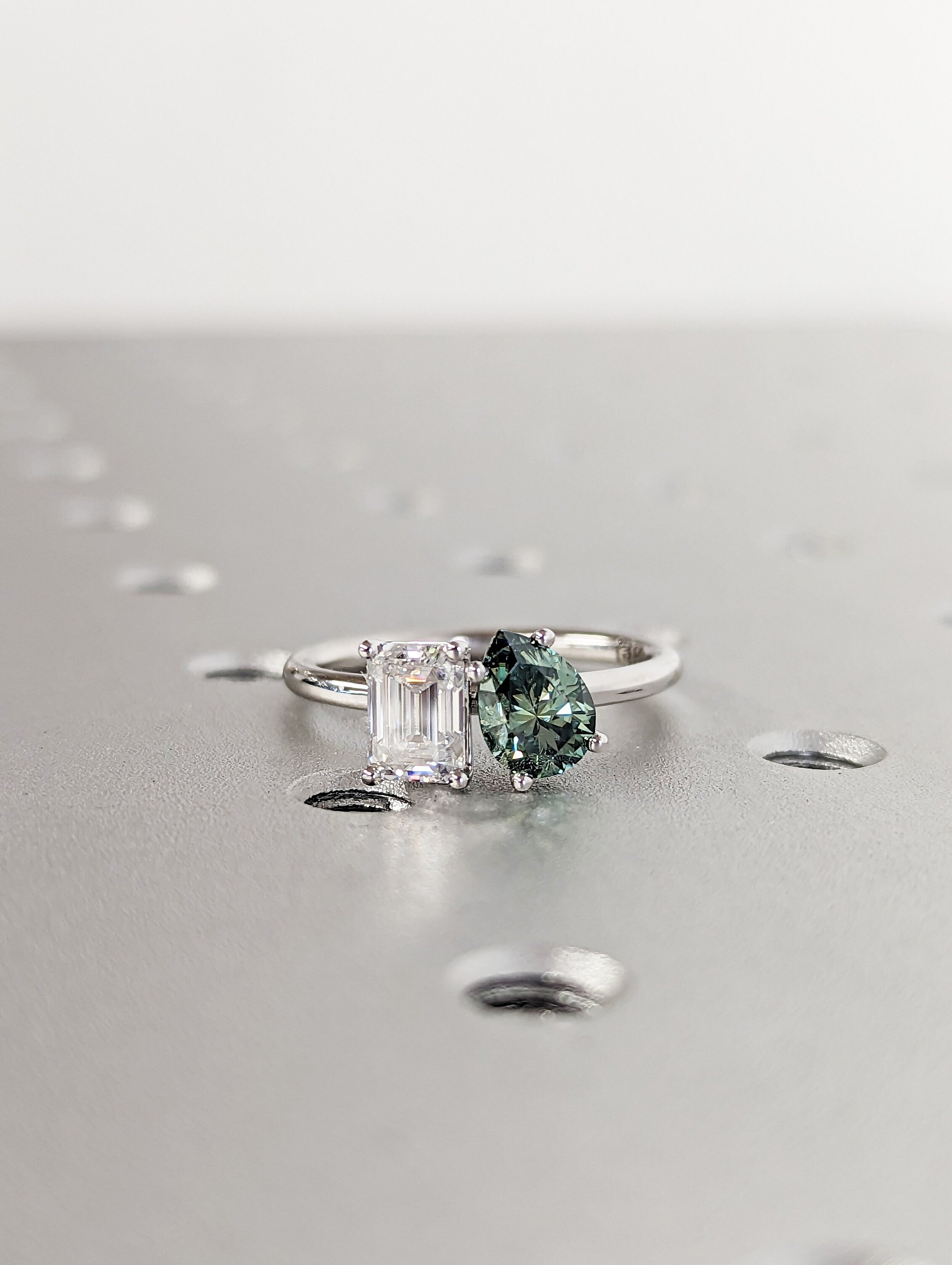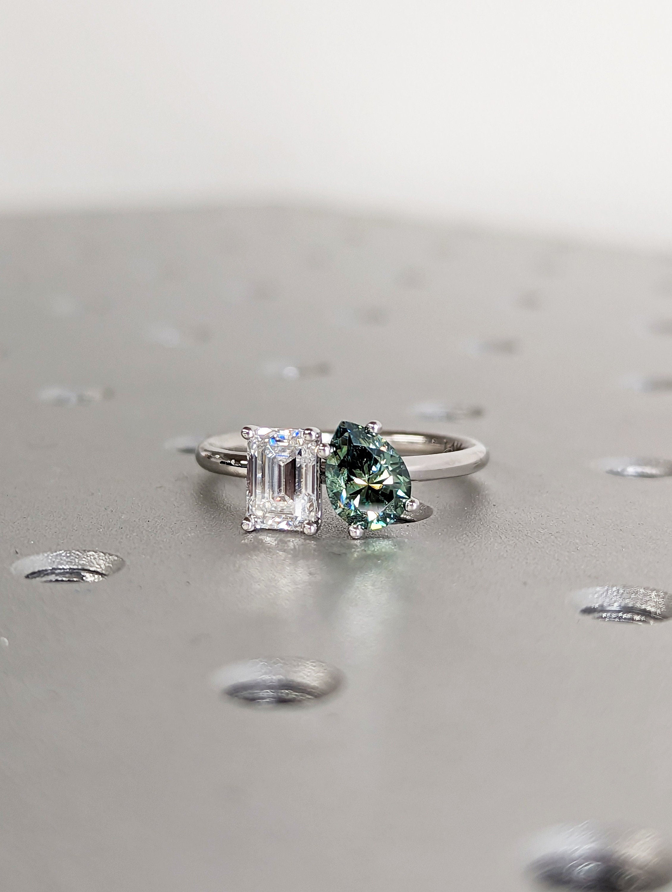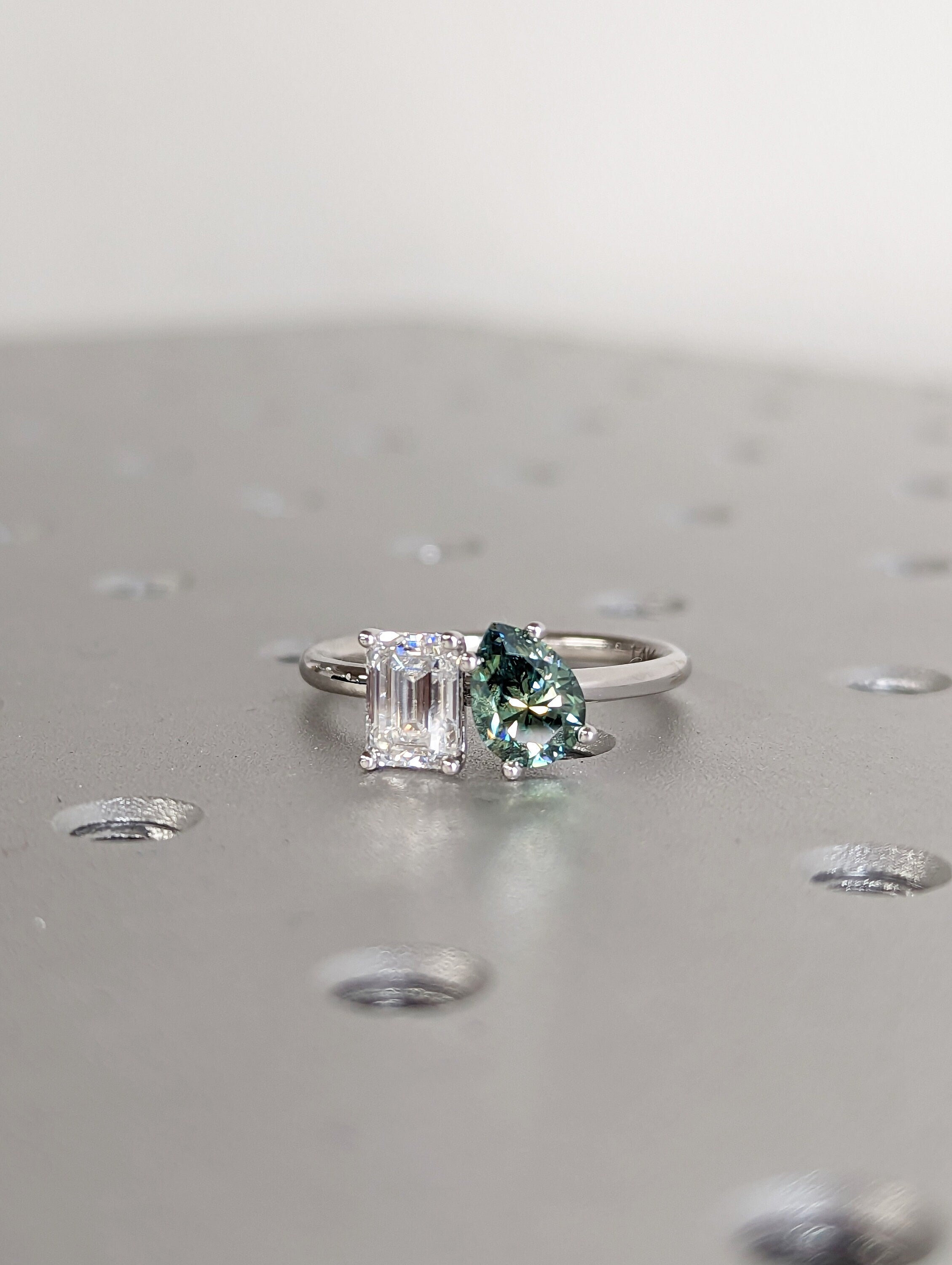 A beautiful dual emerald and pear shaped moissanites, set with a super delicate and thin setting the unique and delicate