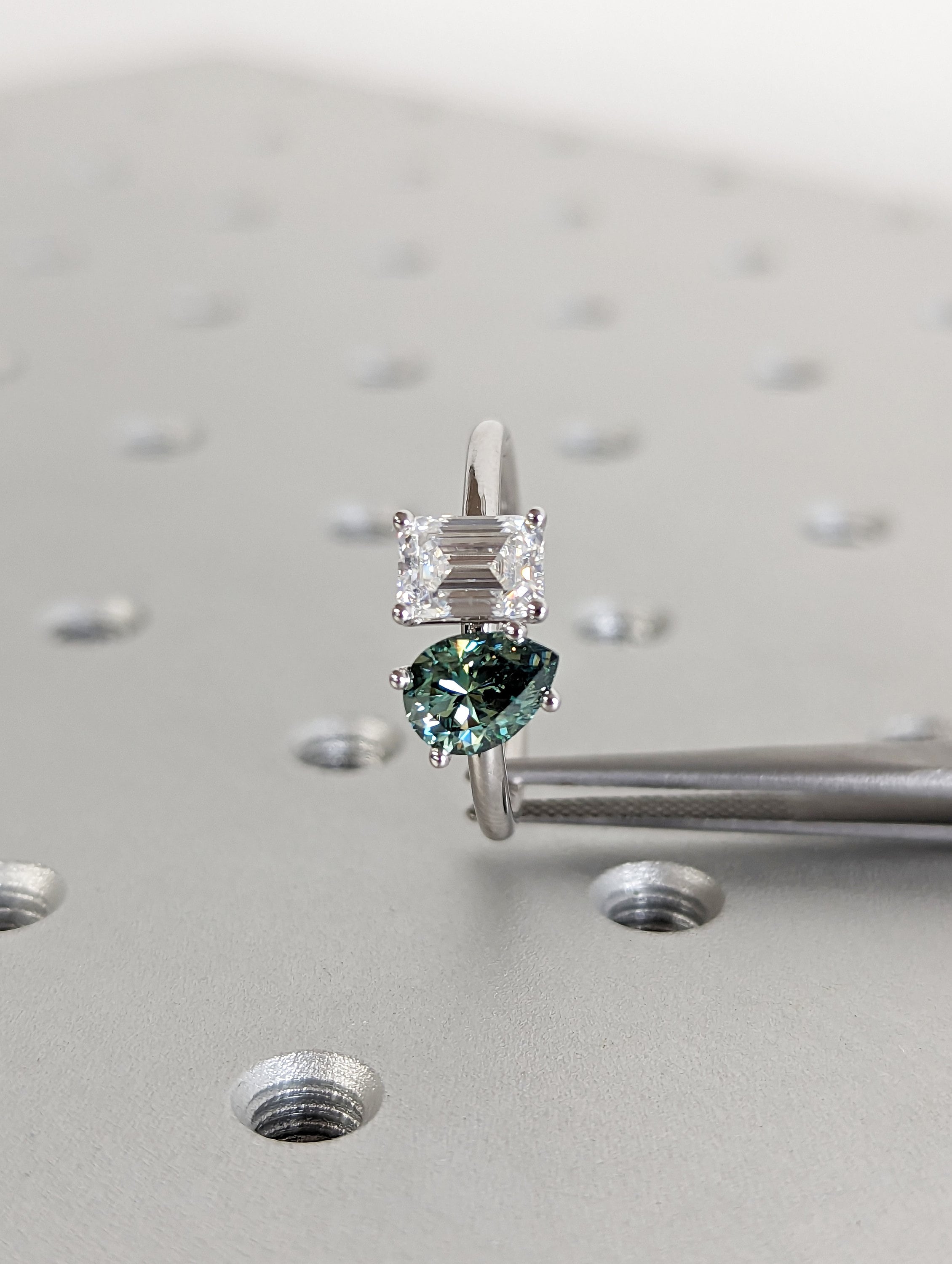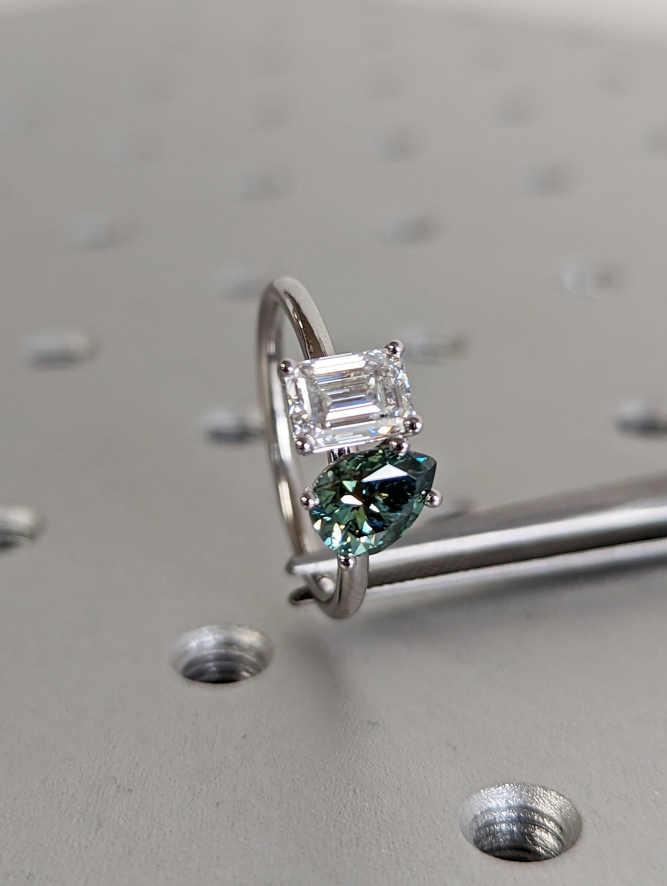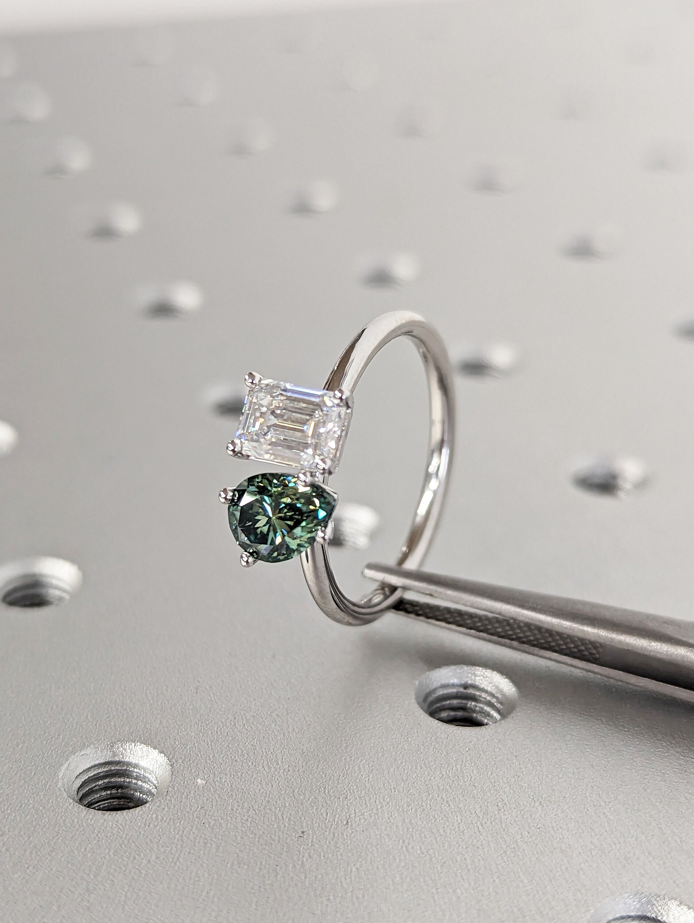 A beautiful dual emerald and pear shaped moissanites, set with a super delicate and thin setting the unique and delicate