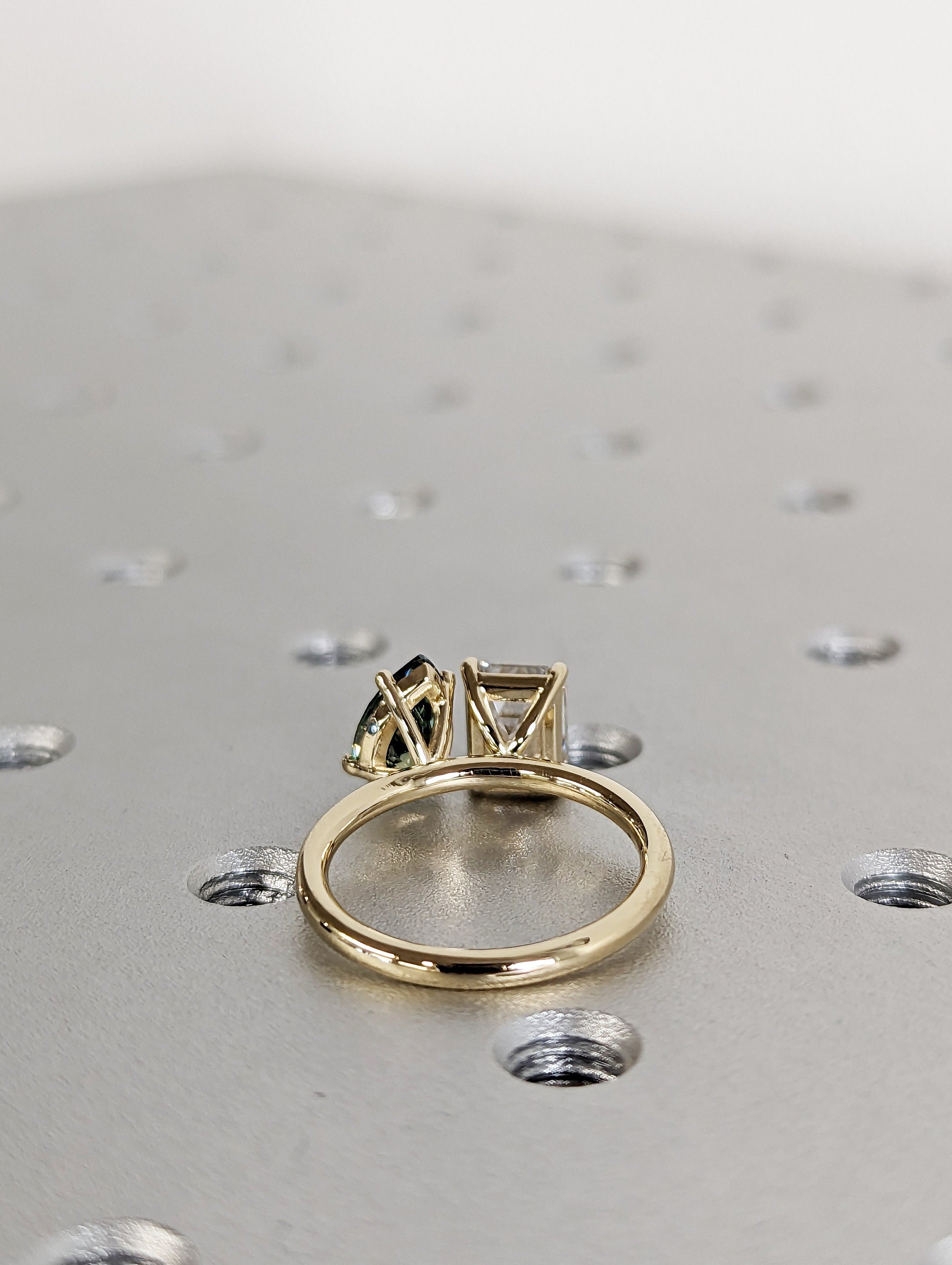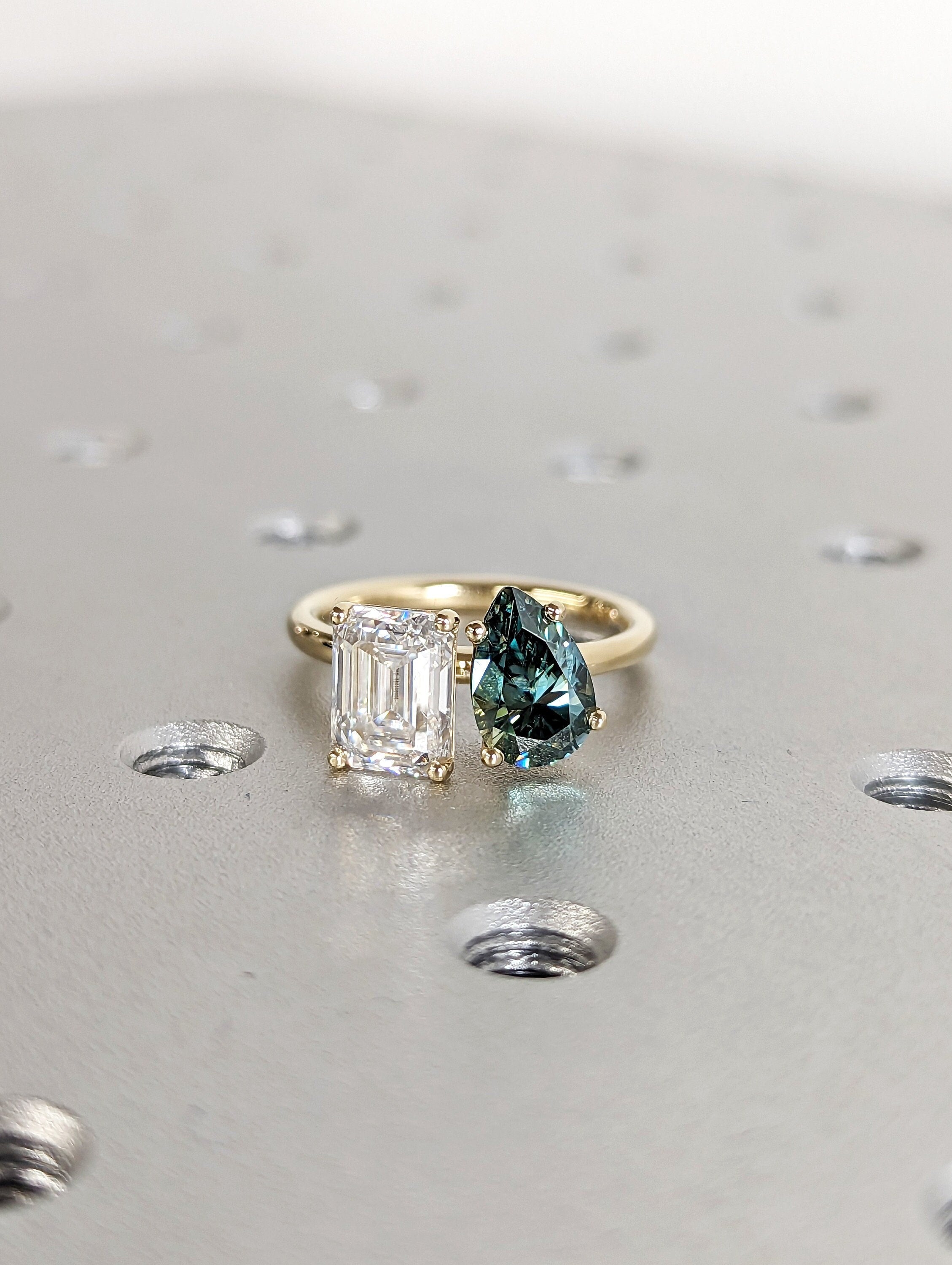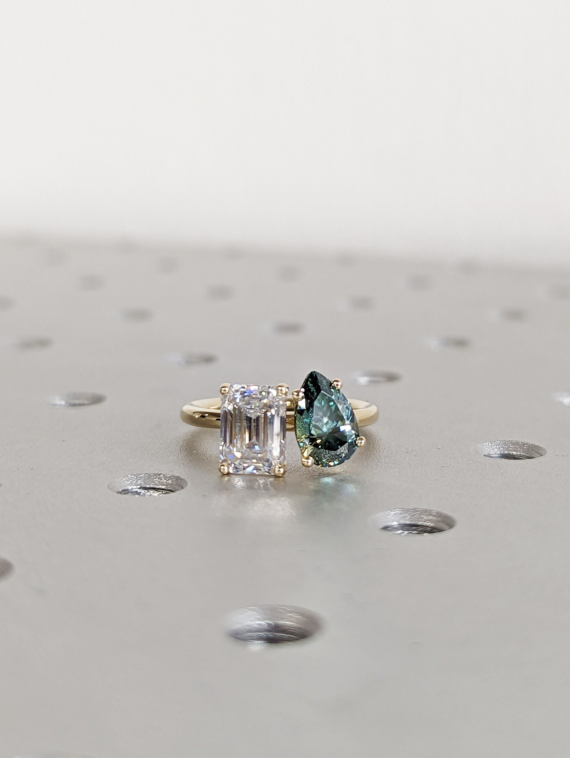 Pear And Emerald Cut Toi Et Moi Moissanite Ring / Green Pear Moissanite Engagement Ring / Yellow Gold Anniversary Ring / Two Stone Ring
