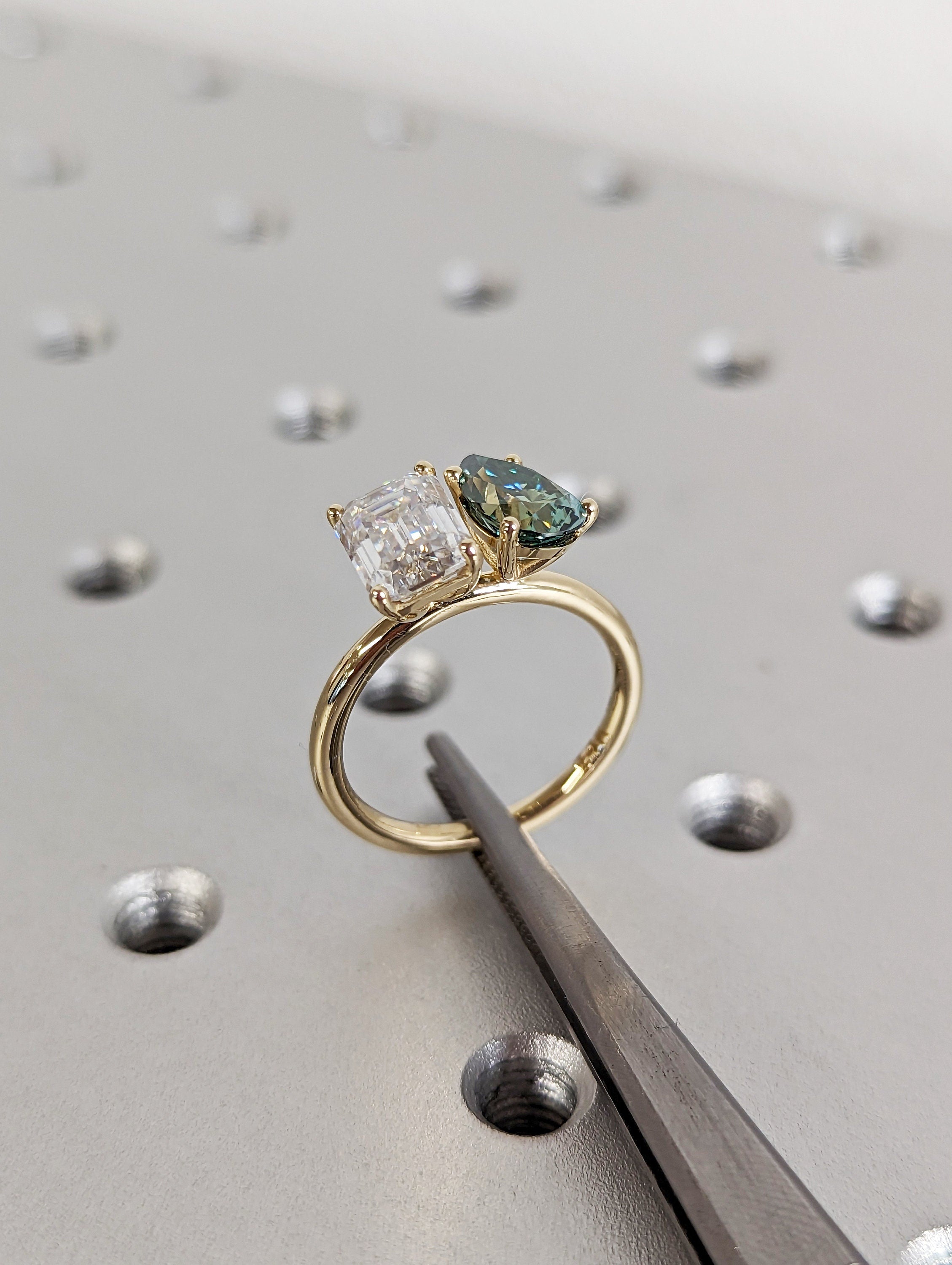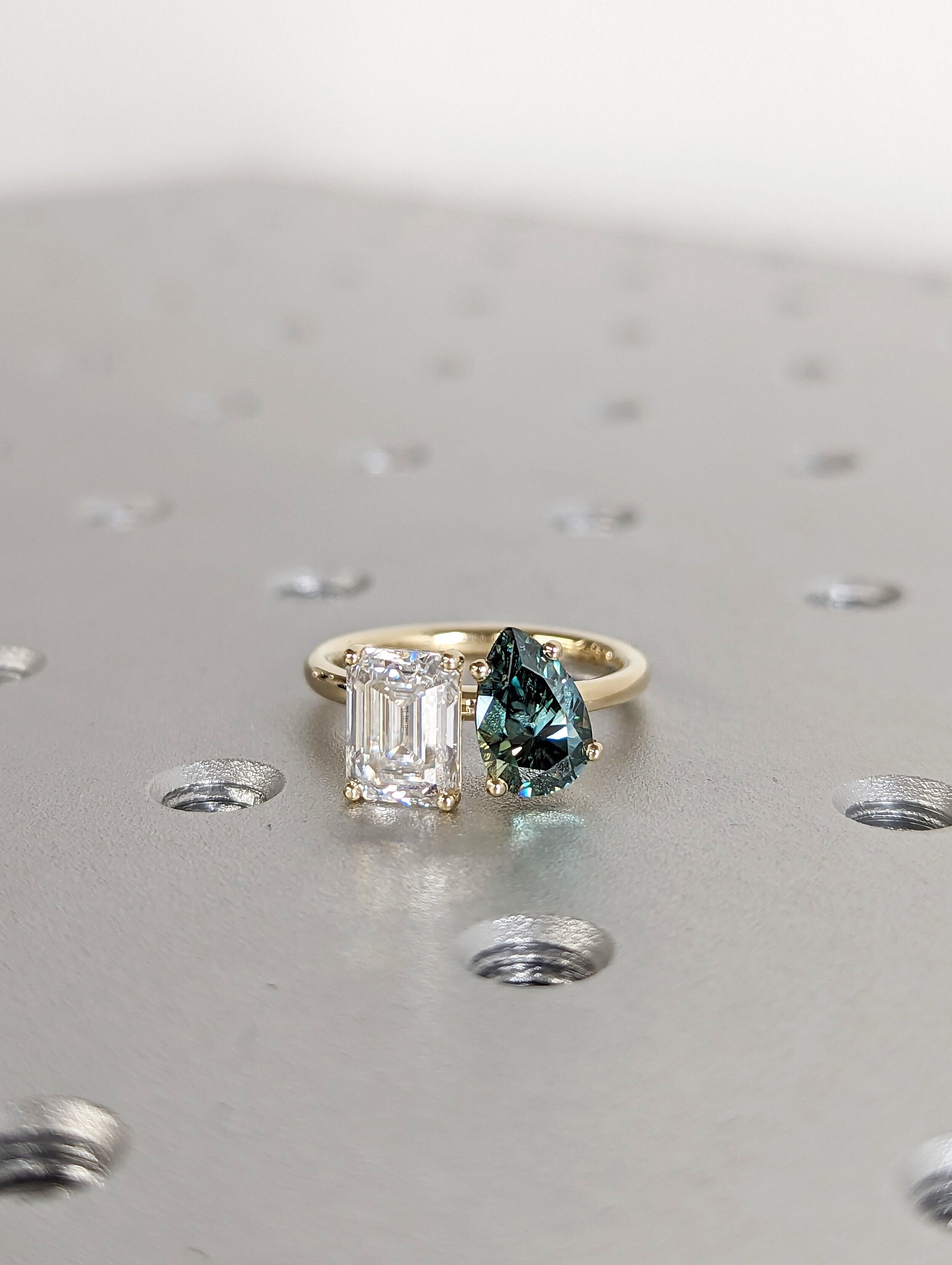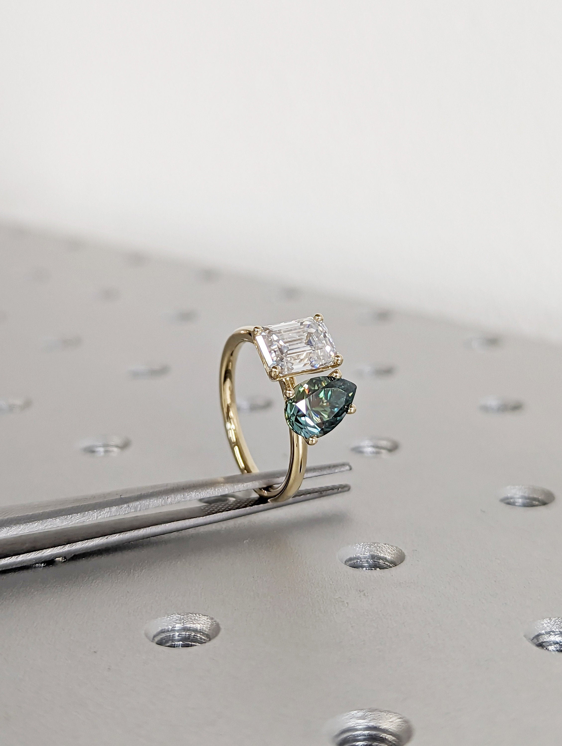A beautiful dual emerald and pear shaped moissanites, set with a super delicate and thin setting the unique and delicate