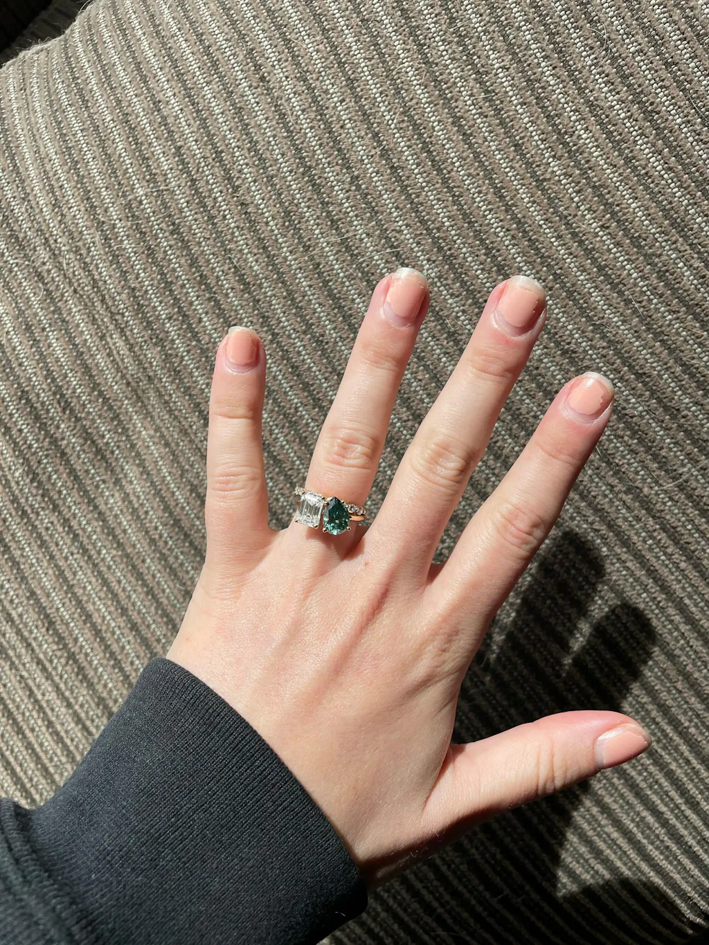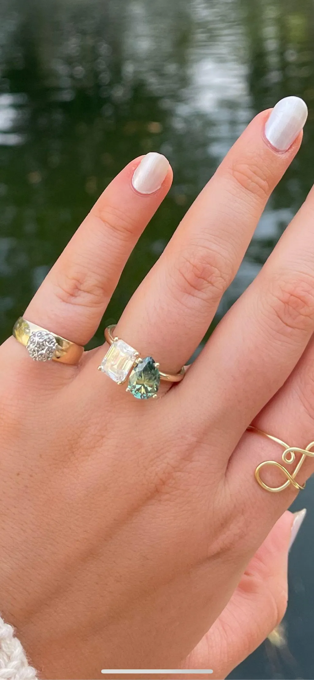 A beautiful dual emerald and pear shaped moissanites, set with a super delicate and thin setting the unique and delicate