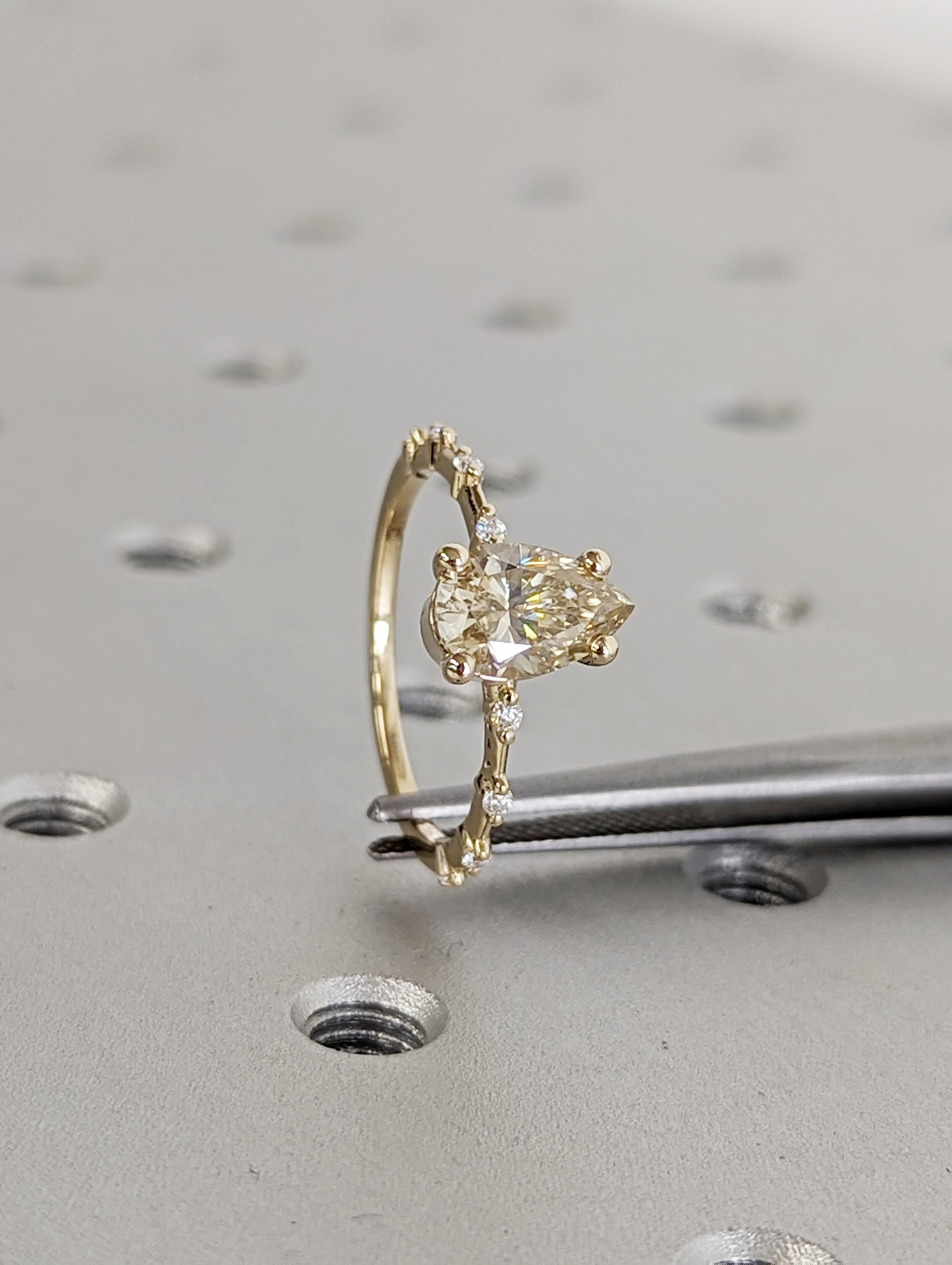 This ornate, vintage-inspired ring features a prong center setting with pear shaped moissanite, highlighted by prong set moissanites on a delicate gold band.