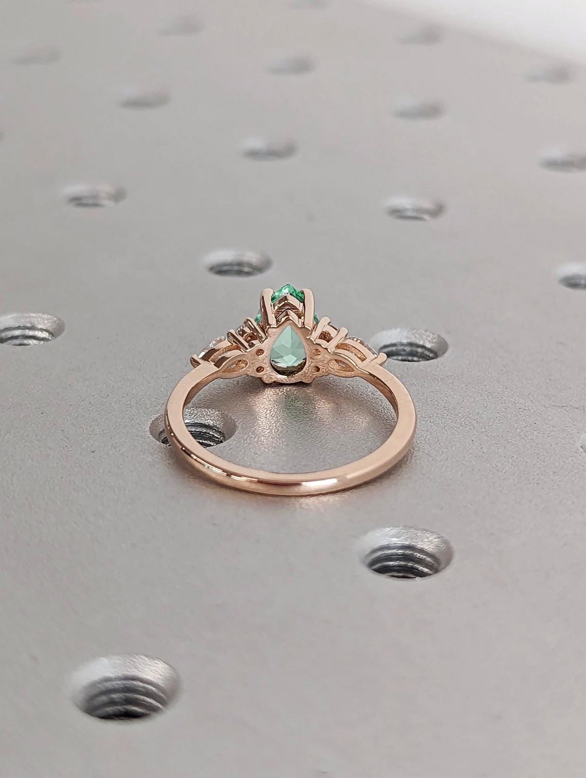 Pear Cut Green Sapphire Ring, Vintage 14k Rose Gold Engagement Ring, Art Deco Green Sapphire Wedding Rings for Women, Diamond Cluster Ring