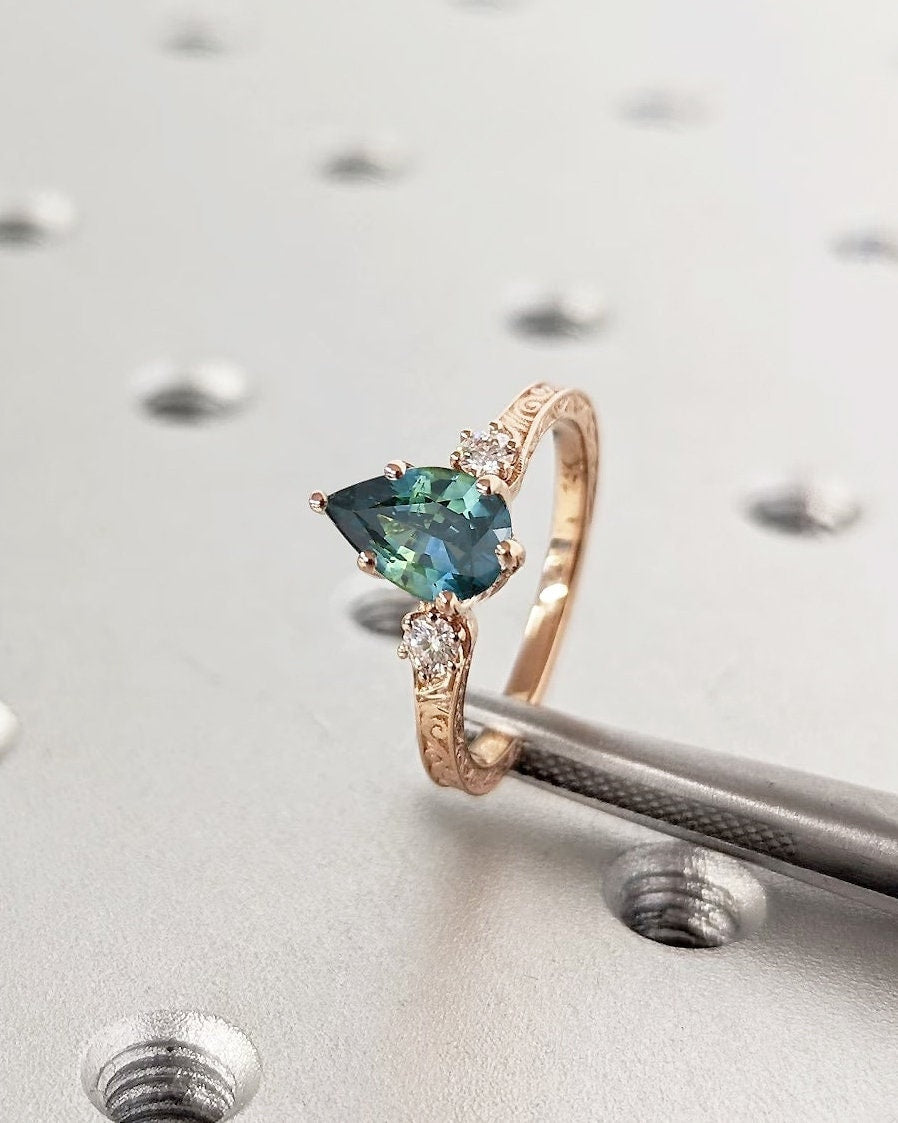 Pear cut Green Sapphire with Diamond Engagement Ring for Her | Vintage Inspired Rose Gold 3 Stone Personalized Alternative Bridal Ring