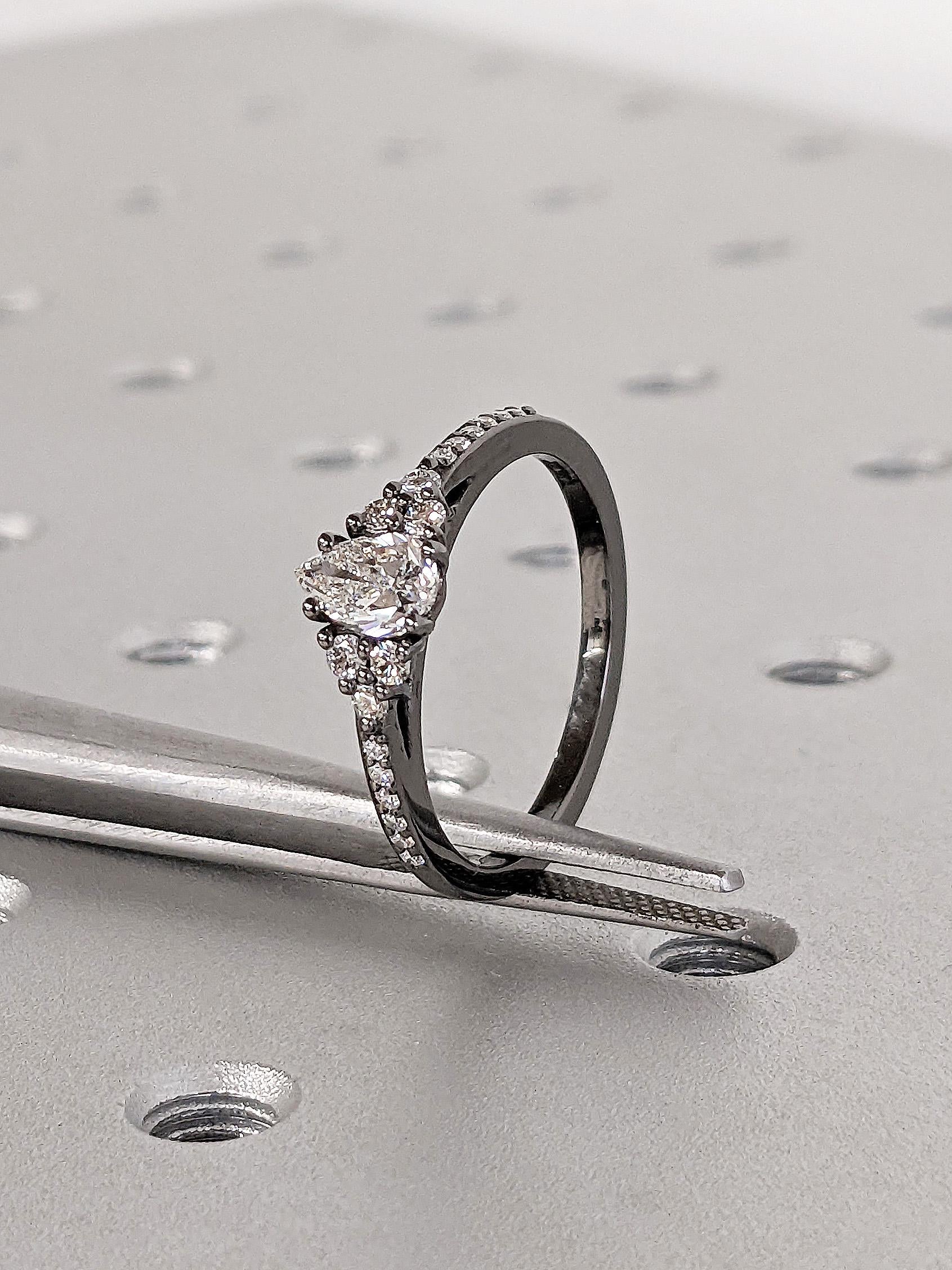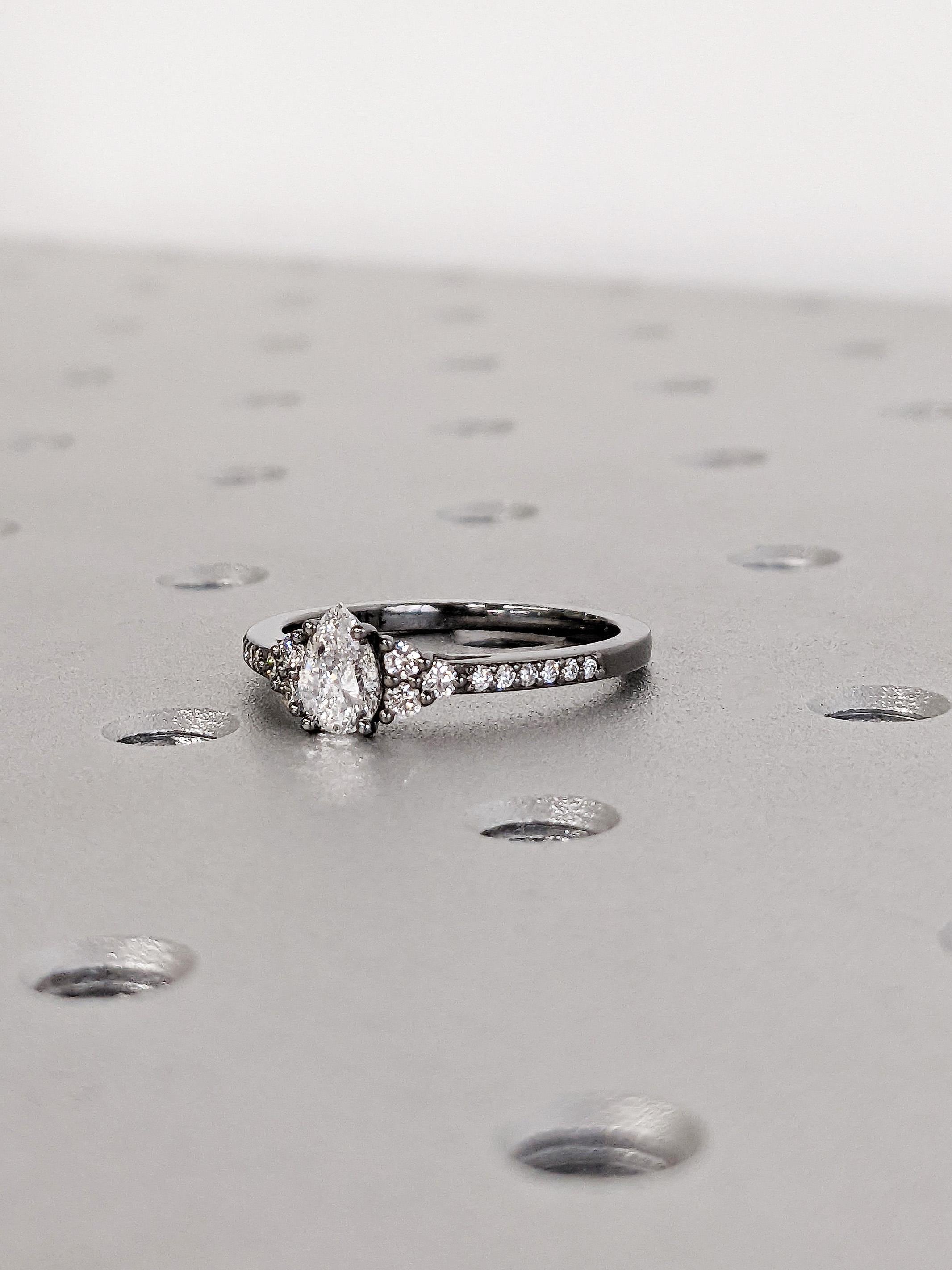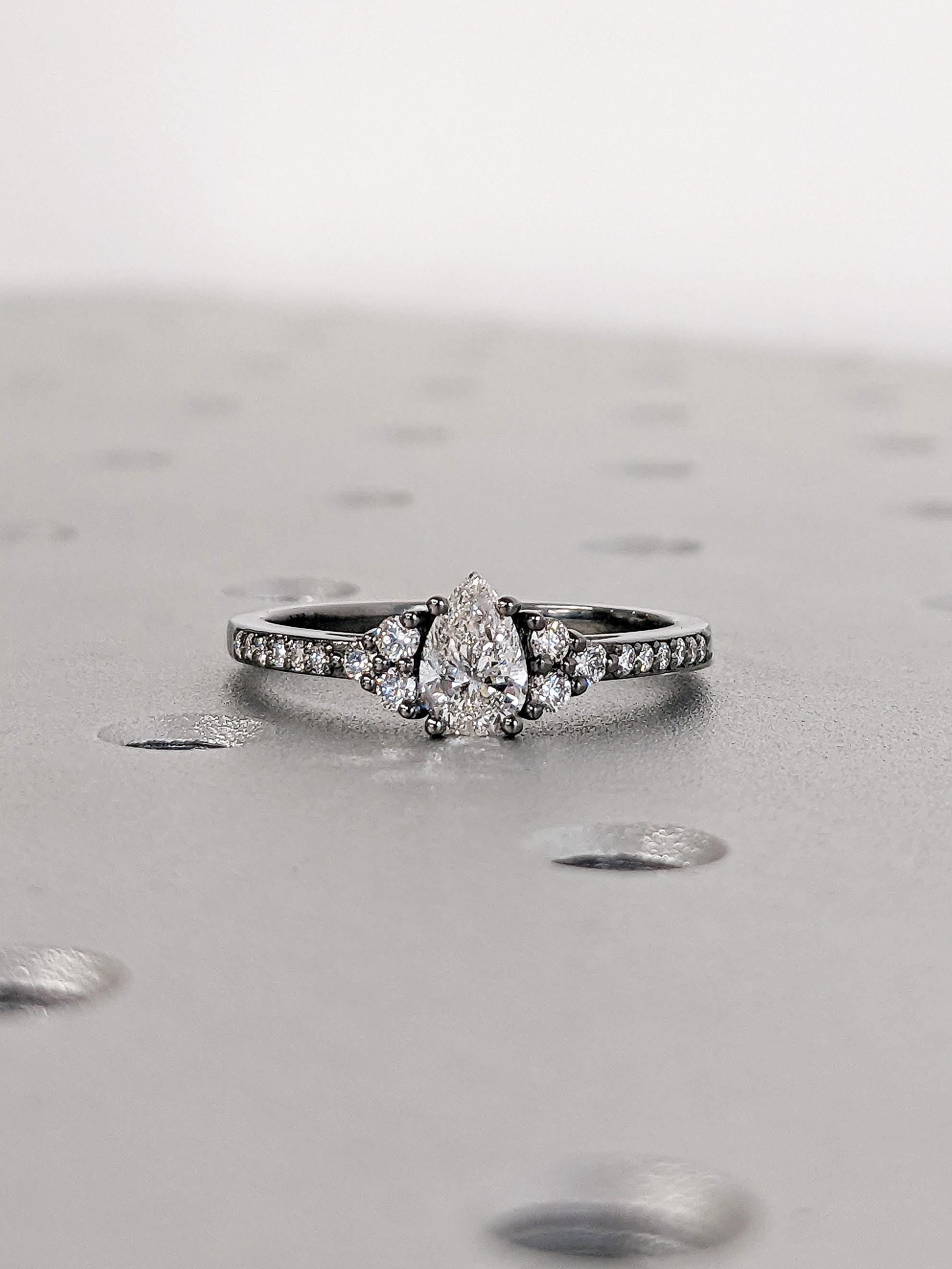 Pear Cut Moissanite Custom Engagement Ring, 14K Black Gold Cluster Round Pavé Diamond Wedding Band, Bridal Jewelry