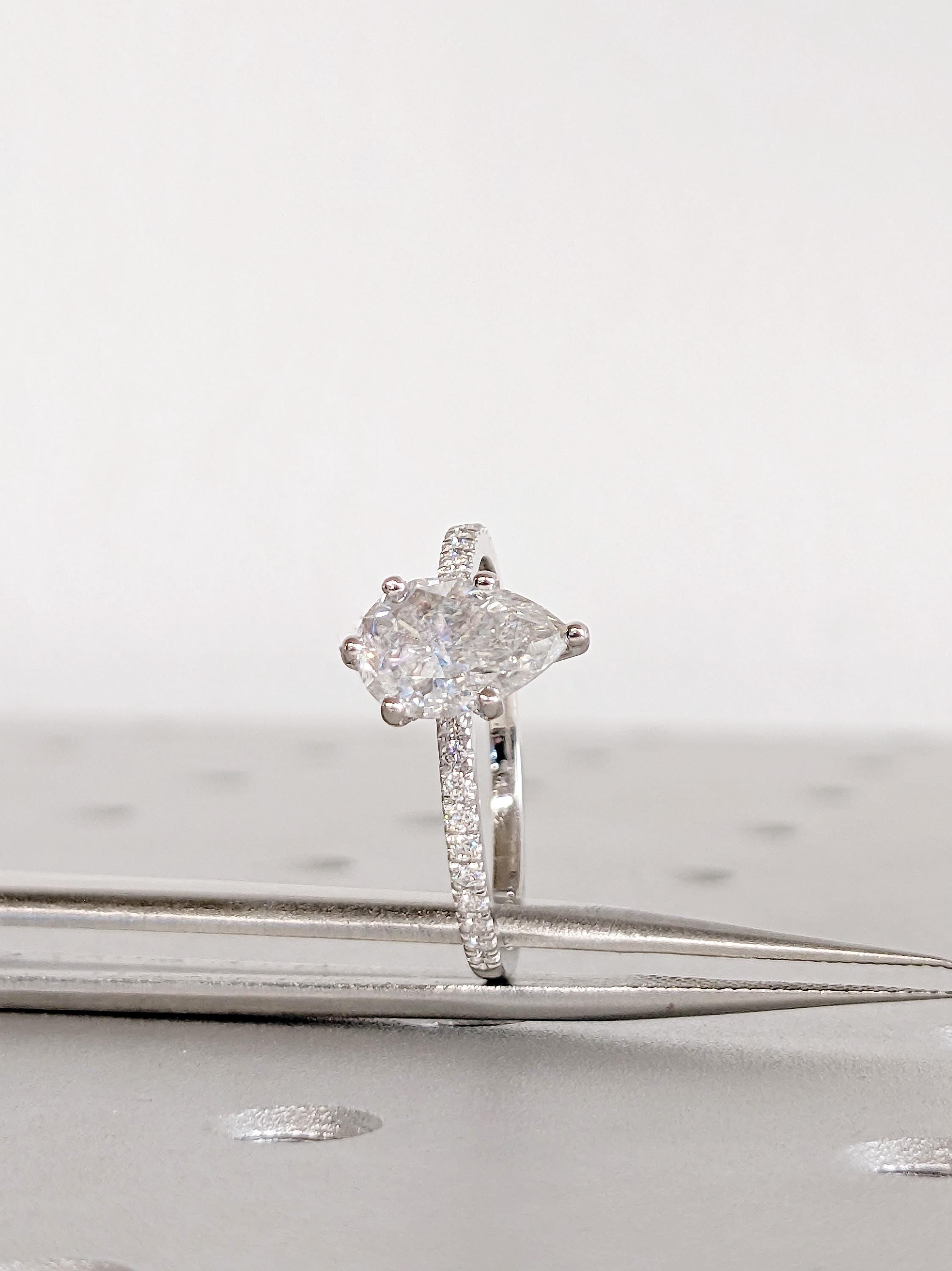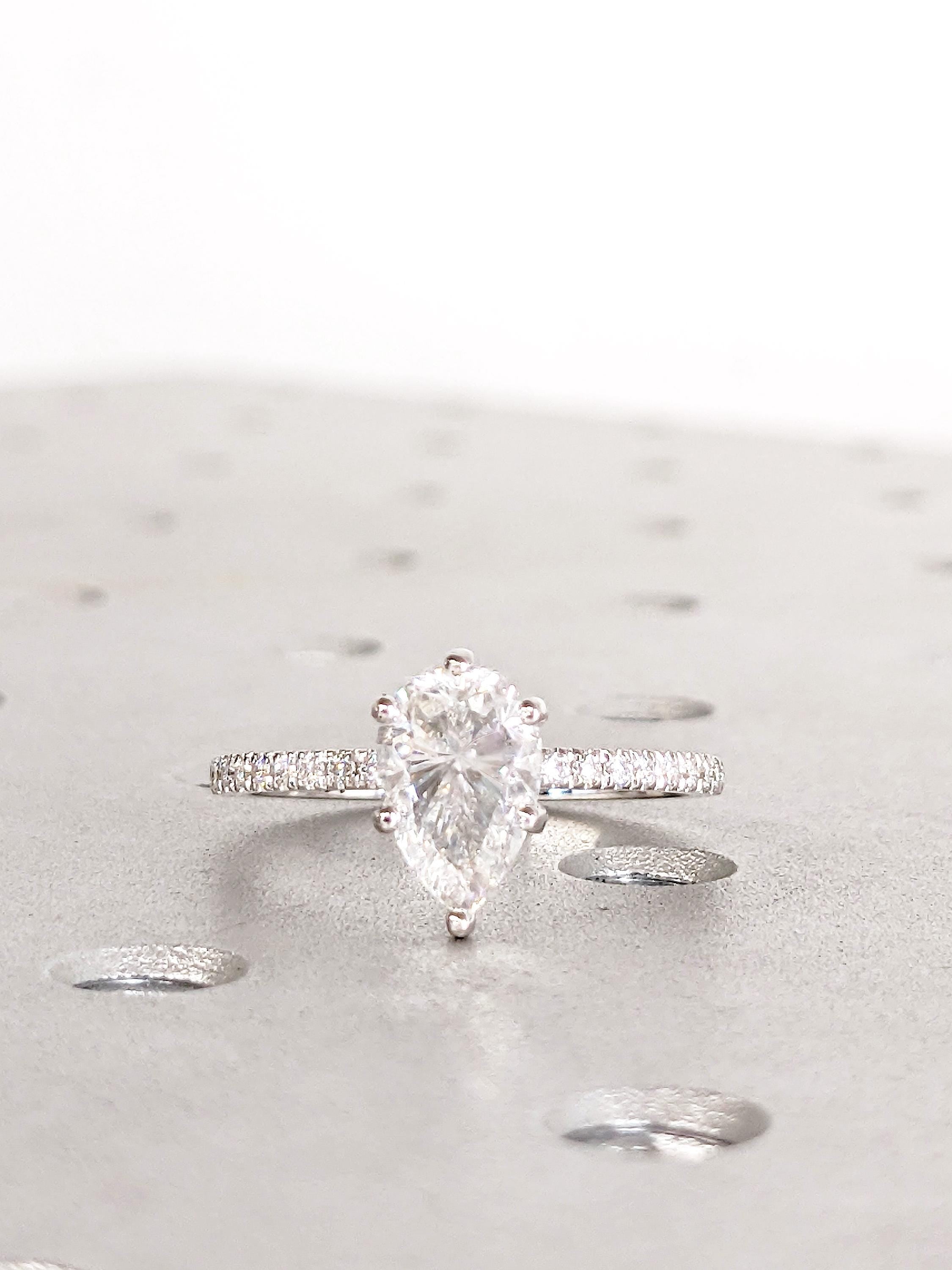 This Pear Moissanite Engagement Ring brings a bright Moissanite main stone in a prong setting, paired with Round side stones in a clean pave row that can be Natural Diamond or Moissanite for soft, even sparkle. Its elegant look makes it ideal for engagement, bridal wear, anniversary, or a loving gift, adding a graceful shine to any moment.