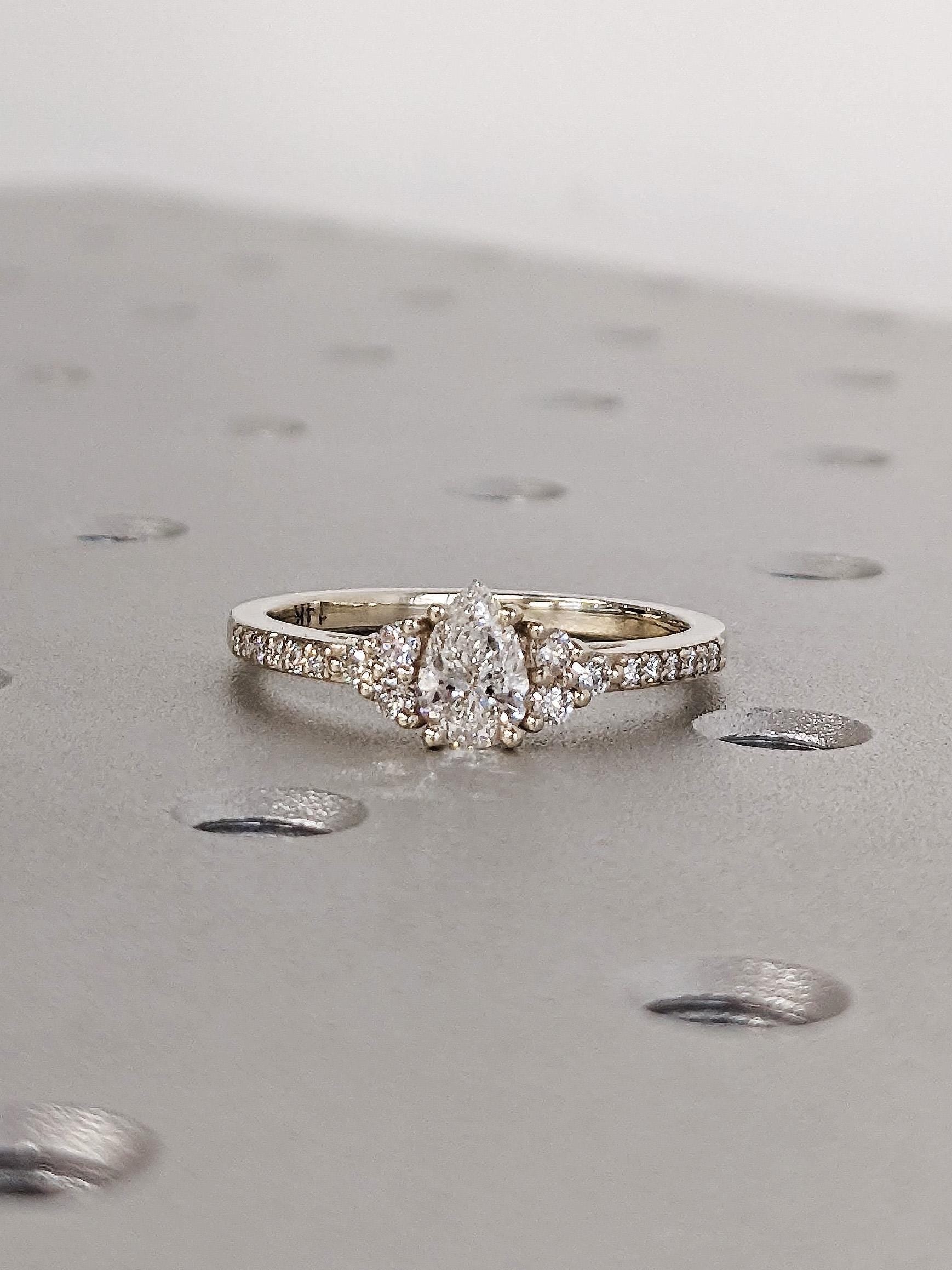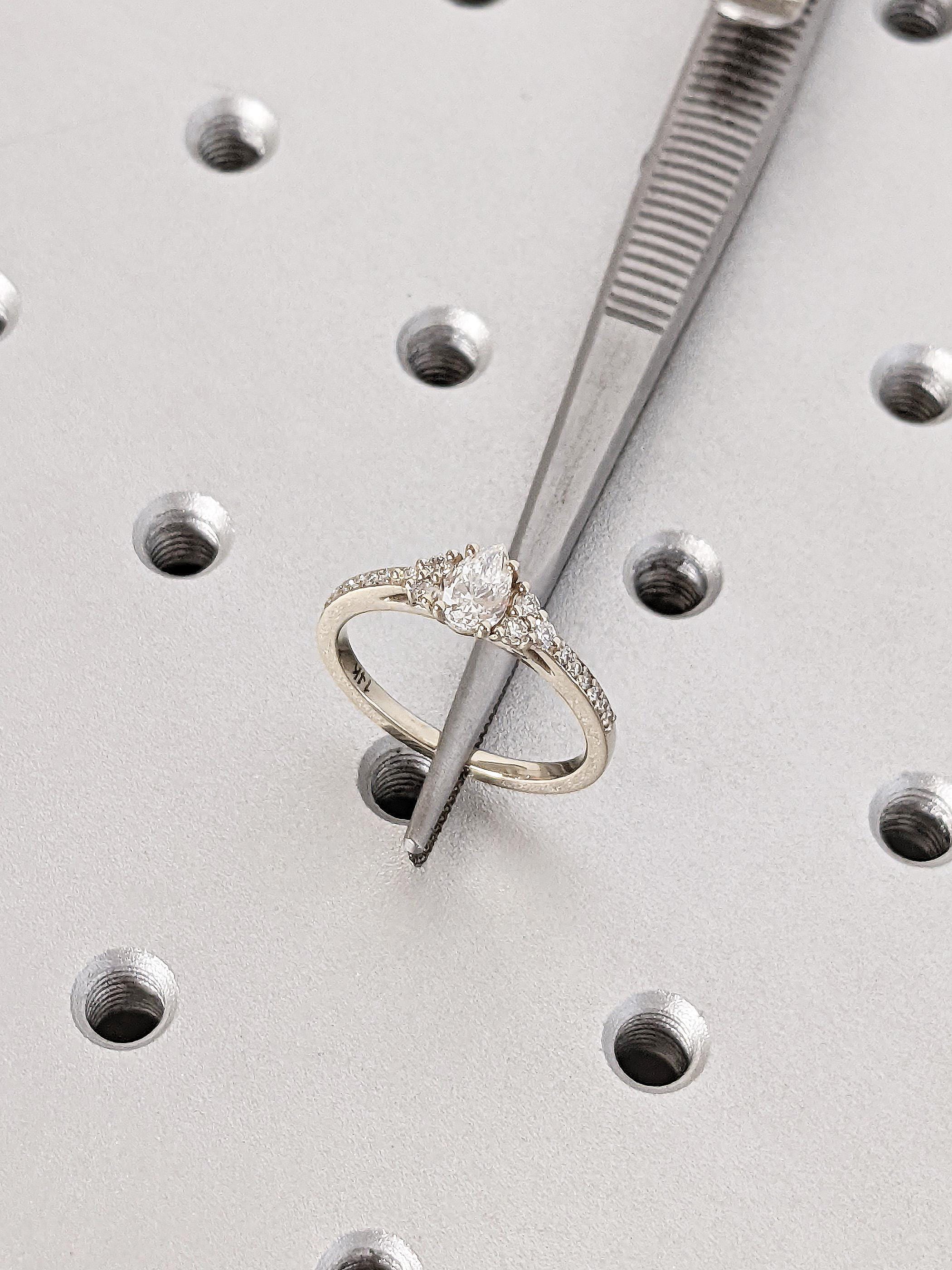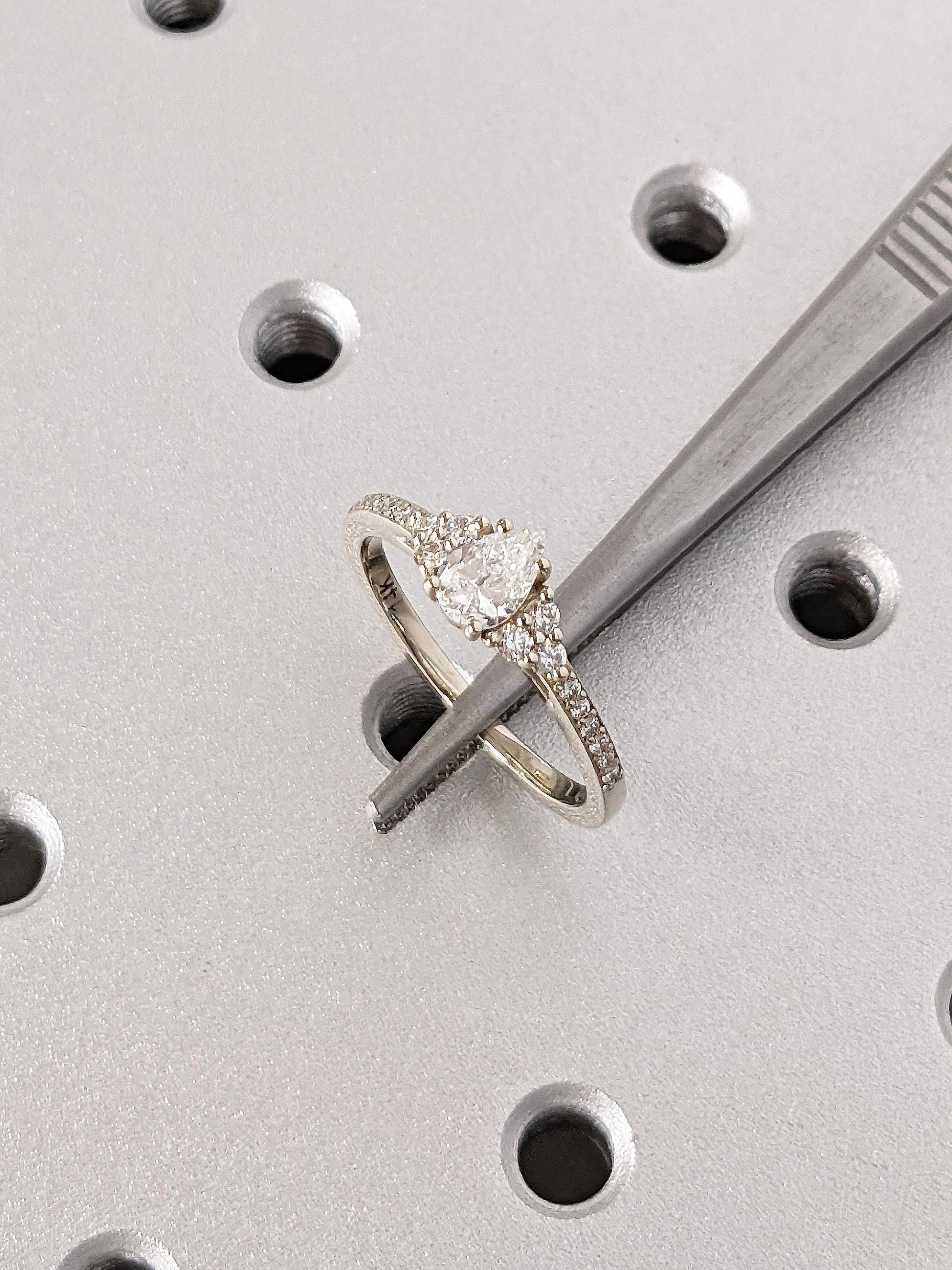 This striking ring features a dazzling pear shaped Moissanite at its center. Set on a thin band paved with tiny round white gemstones of Natural Diamonds, Lab Diamonds or Moissanites. Perfect as an engagement ring or promise ring. This piece makes a unique statement of love and individuality