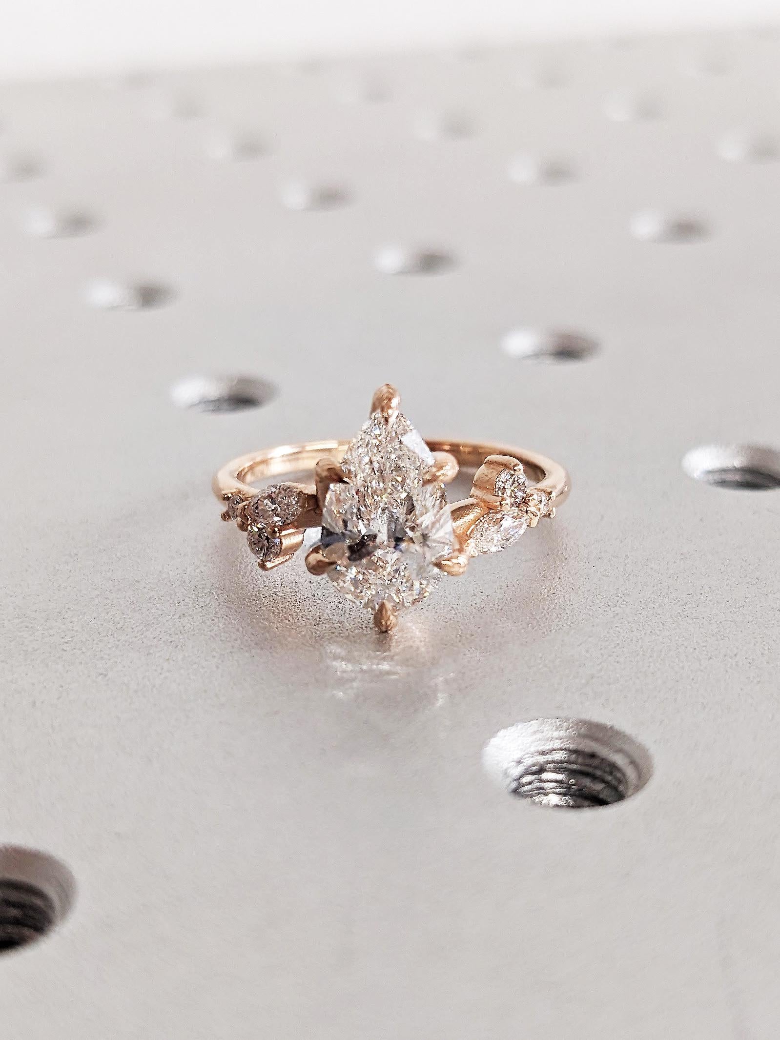 At the heart of this enchanting engagement ring lies a pear cut Moissanite secured by six talon prongs for a classic and durable design. The band features round and marquise accent stones resembling the shape of delicate leaves, blending with natural beauty. Personalize your ring with side stones of Natural Diamonds, Lab Diamonds or Moissanites for a unique touch.