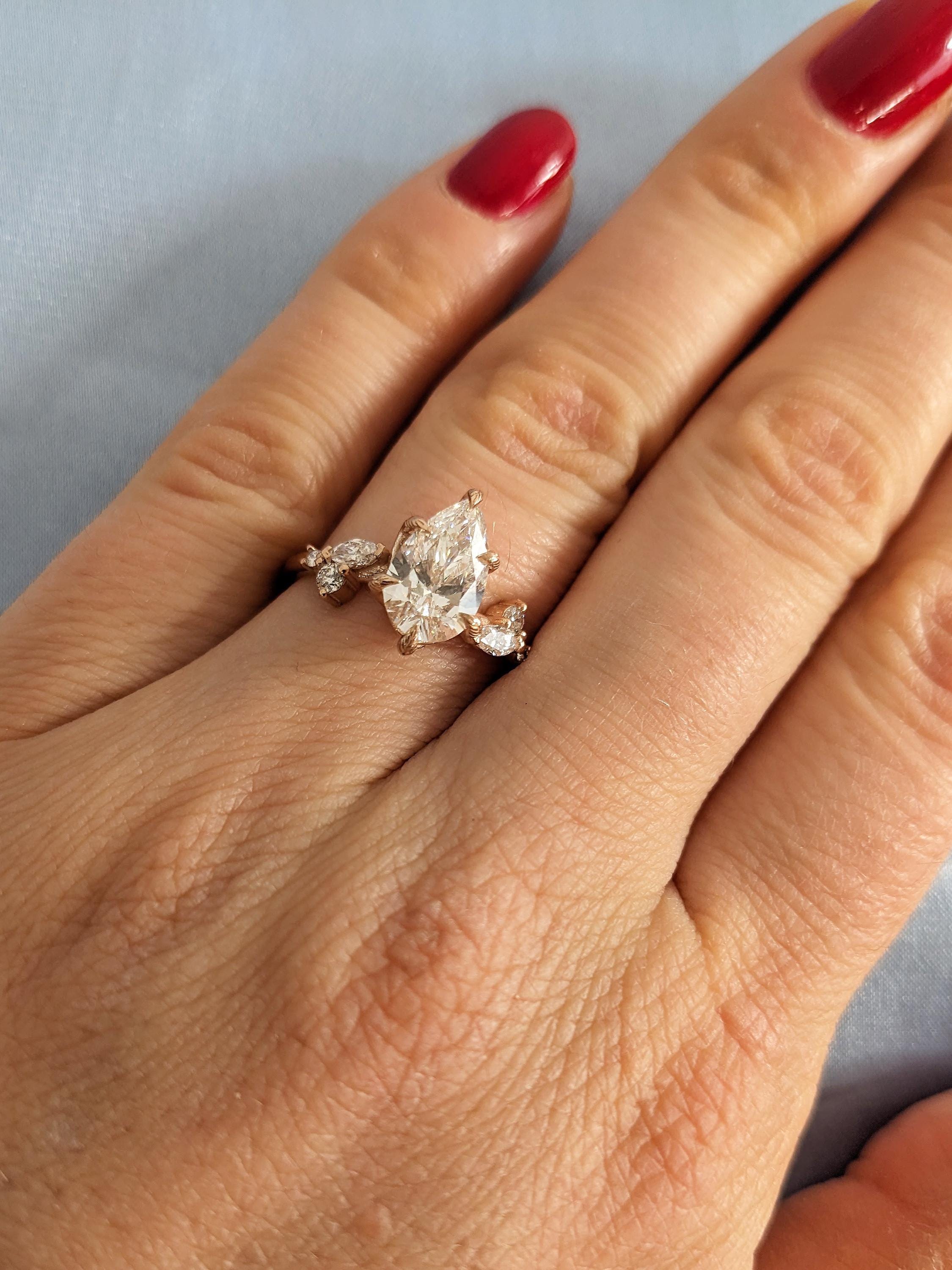 Pear Cut Moissanite Nature Inspired Engagement Ring, 14K Rose Gold Dainty Round Marquise Diamond Wedding Band