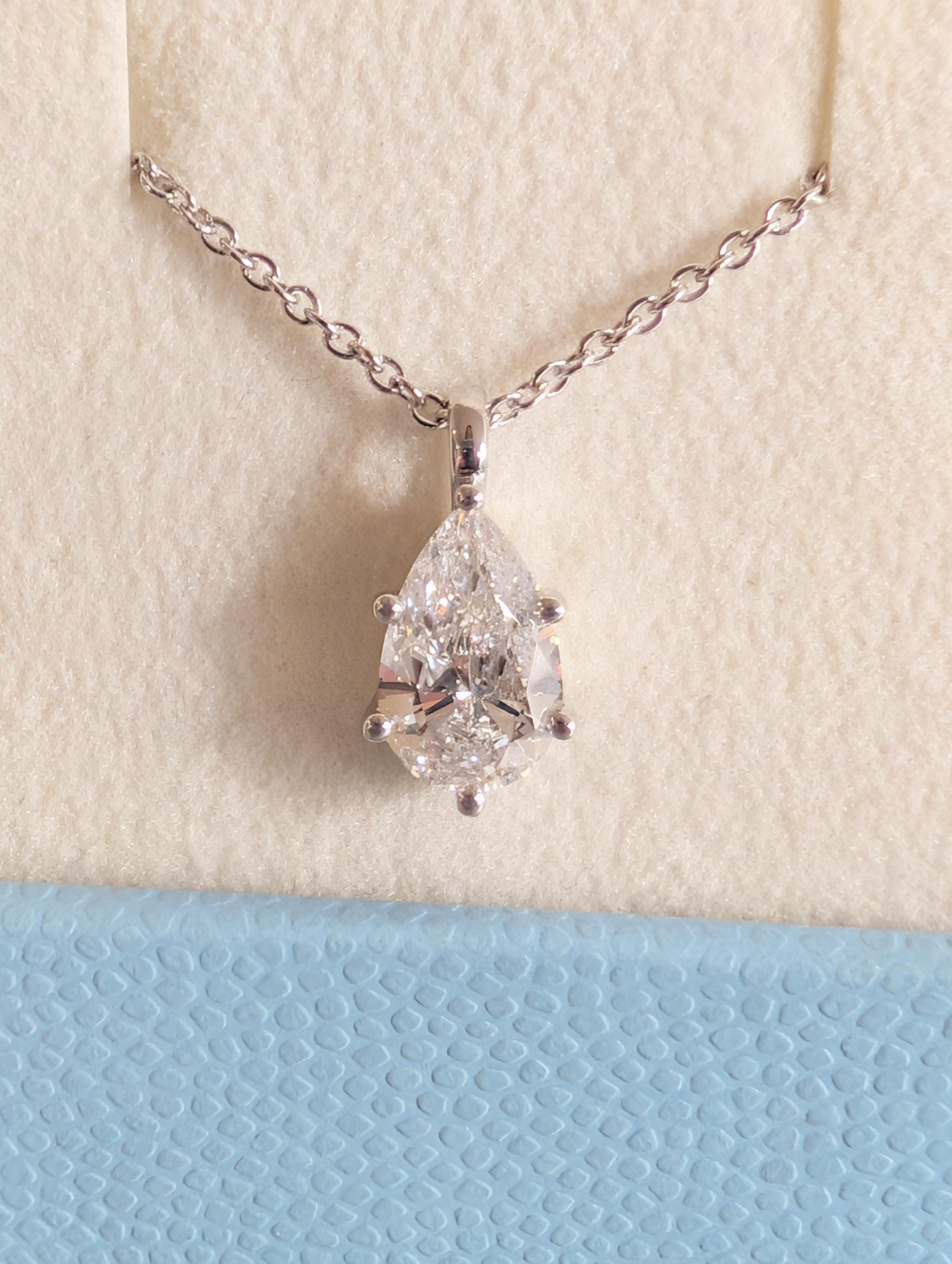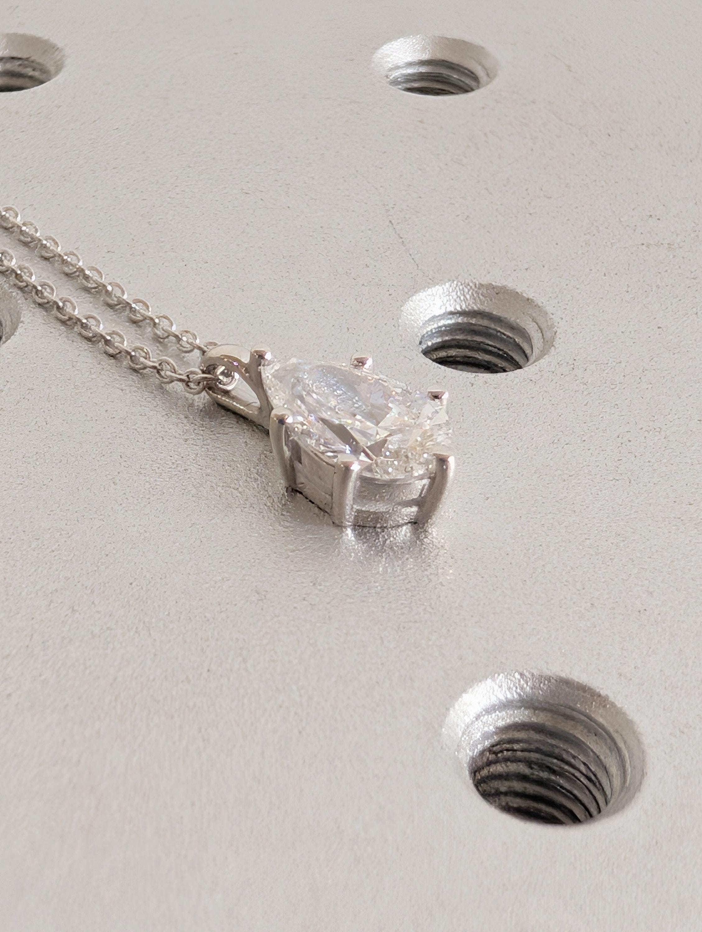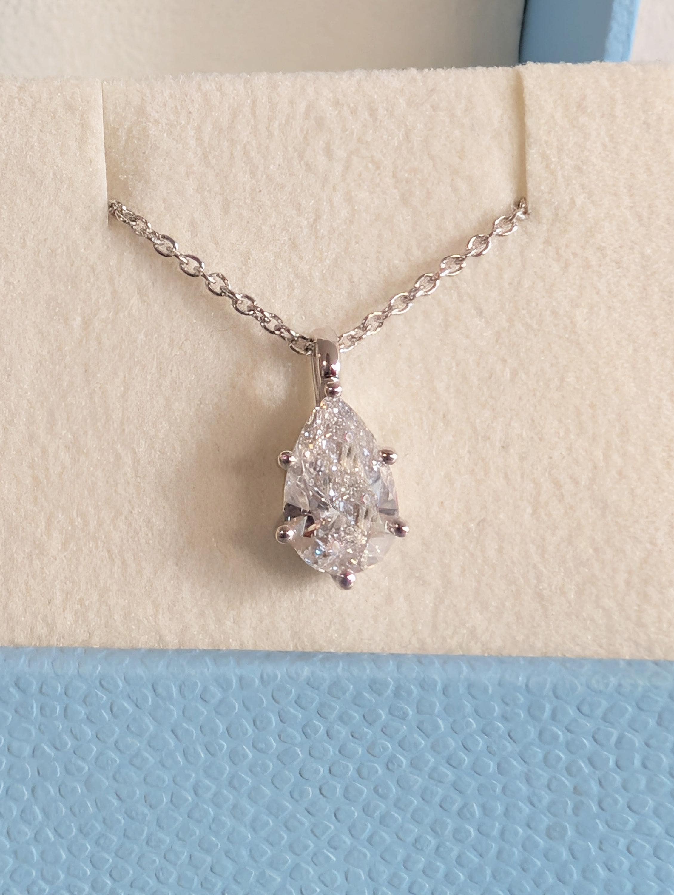 This Moissanite pear cut pendant necklace with a prong setting centers a bright Moissanite stone that reflects light with a soft, lively glow. The drop shape feels light and graceful on the neckline, offering easy elegance without effort. A beautiful option for everyday wear, anniversaries, thoughtful gifts, or a simple necklace meant to shine gently over time.
