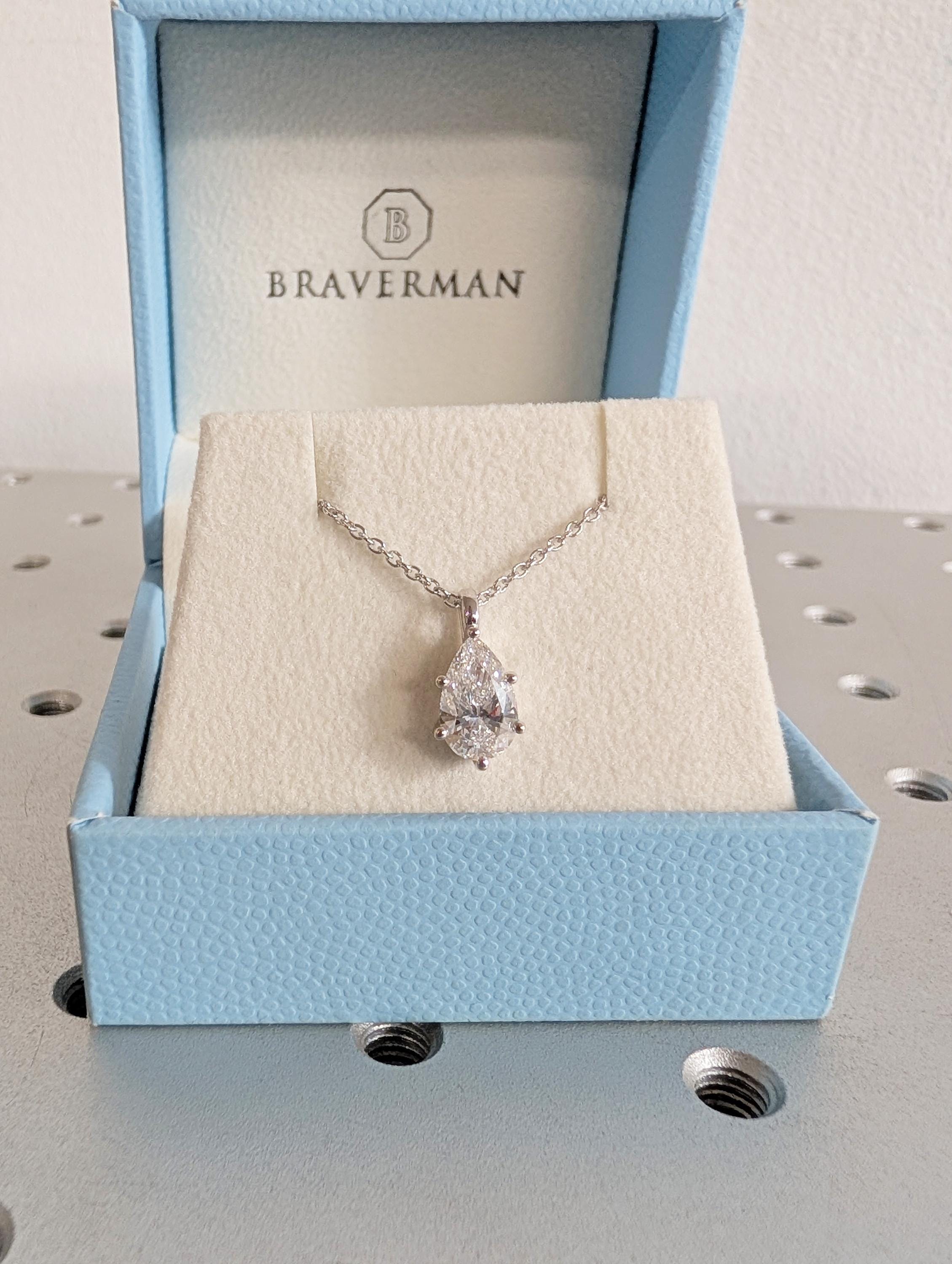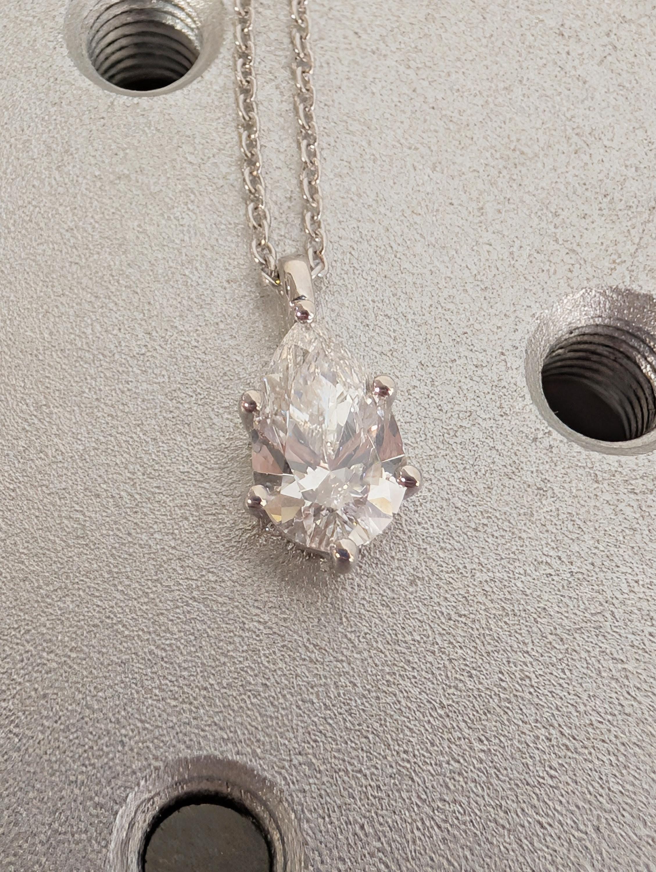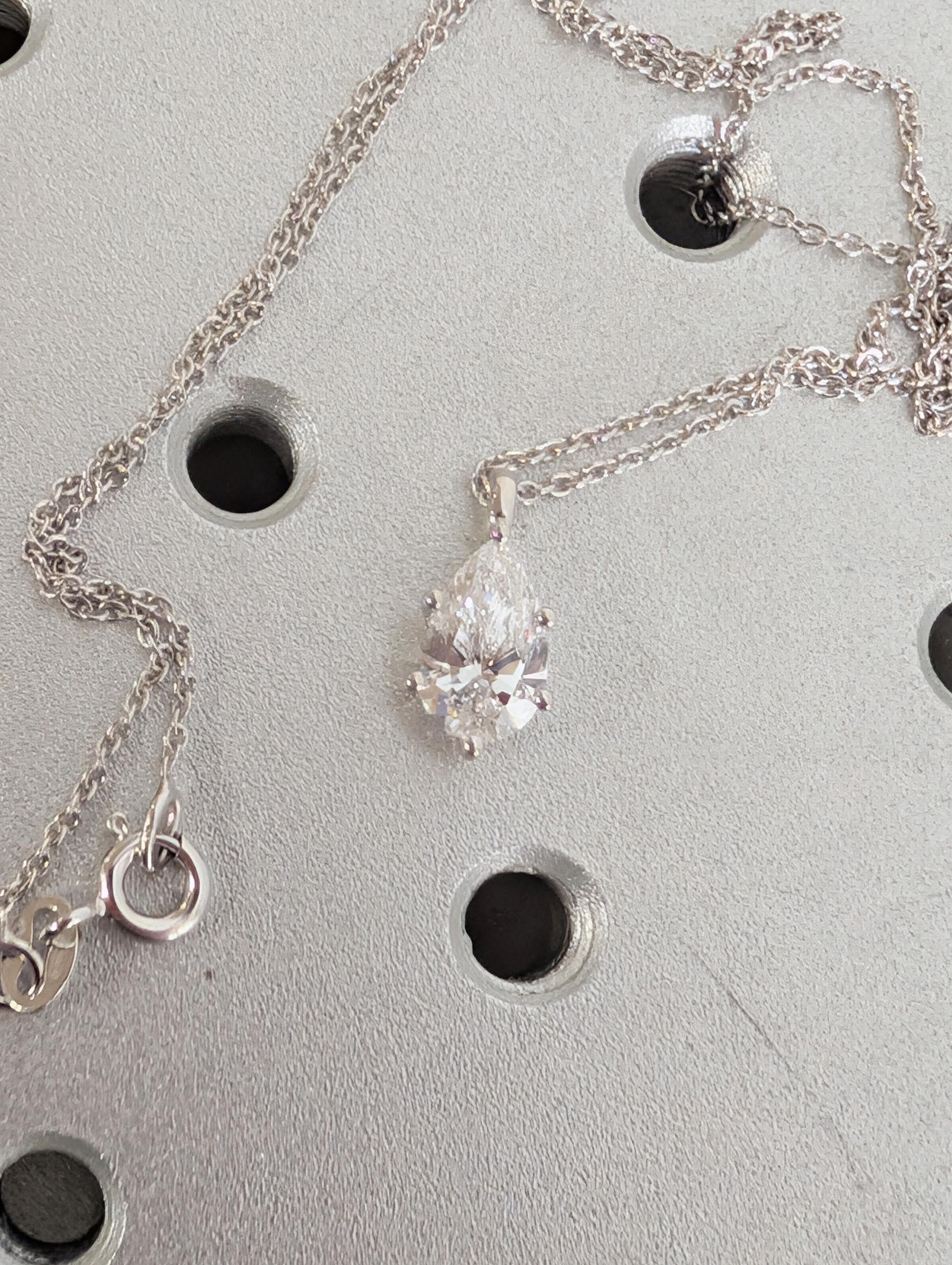 This Moissanite pear cut pendant necklace with a prong setting centers a bright Moissanite stone that reflects light with a soft, lively glow. The drop shape feels light and graceful on the neckline, offering easy elegance without effort. A beautiful option for everyday wear, anniversaries, thoughtful gifts, or a simple necklace meant to shine gently over time.