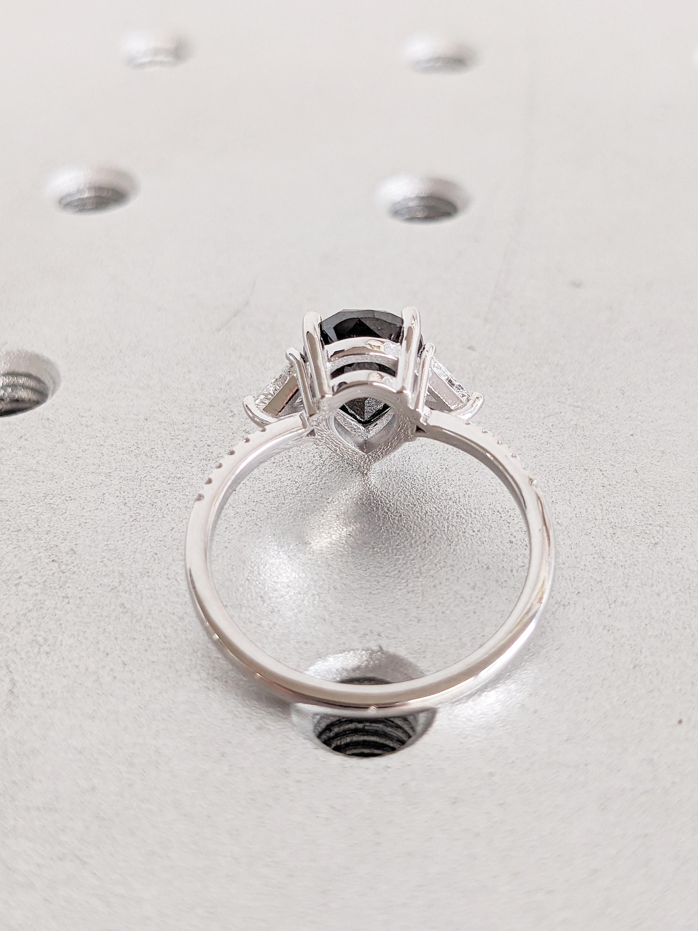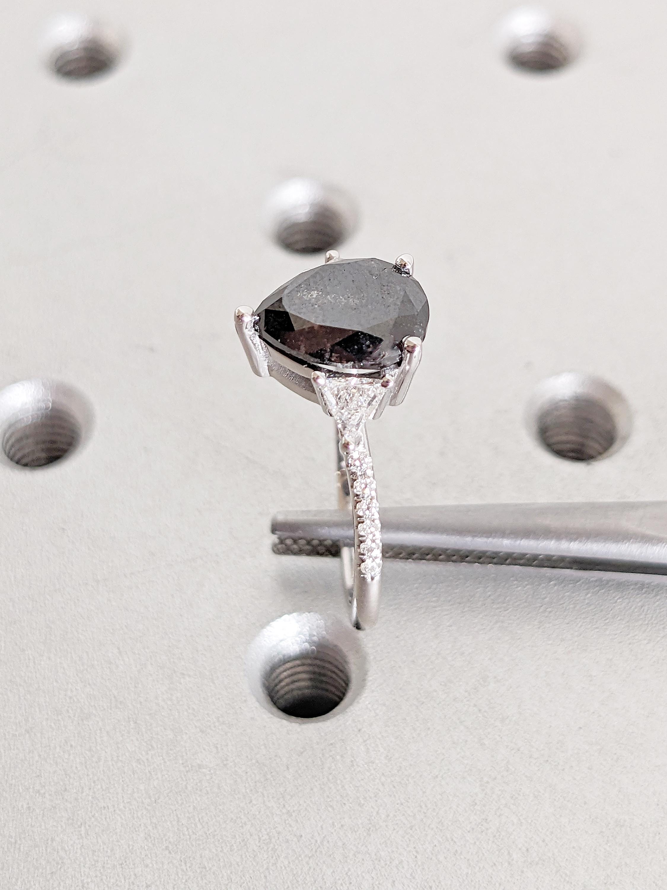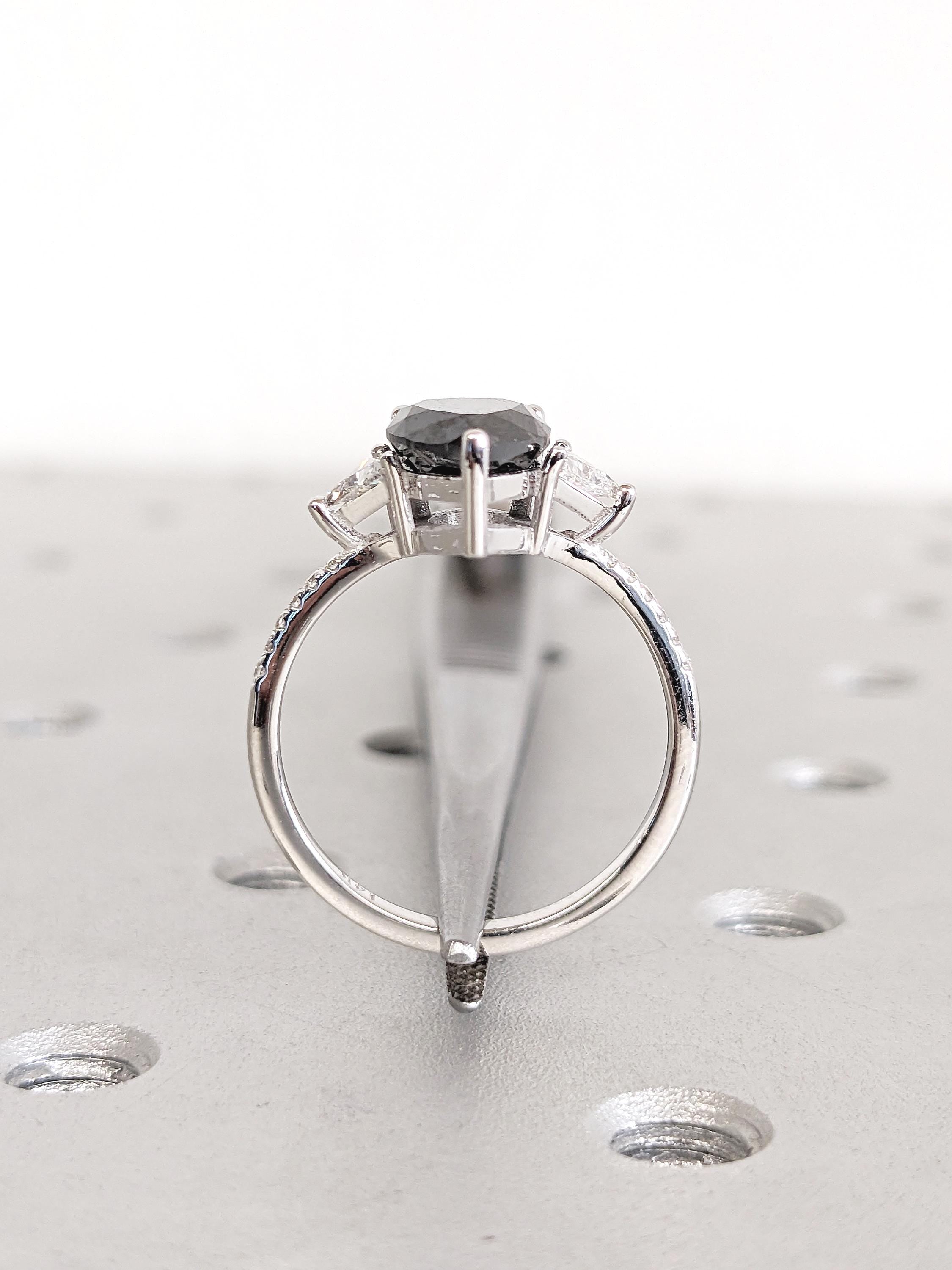 Celebrate your love story with our captivating engagement ring, showcasing a one-of-a-kind pear cut Salt and Pepper Diamond center, complemented by elegant trillion side stones and sparkling round diamonds along the band, available in your choice of Natural Diamonds or Moissanites.