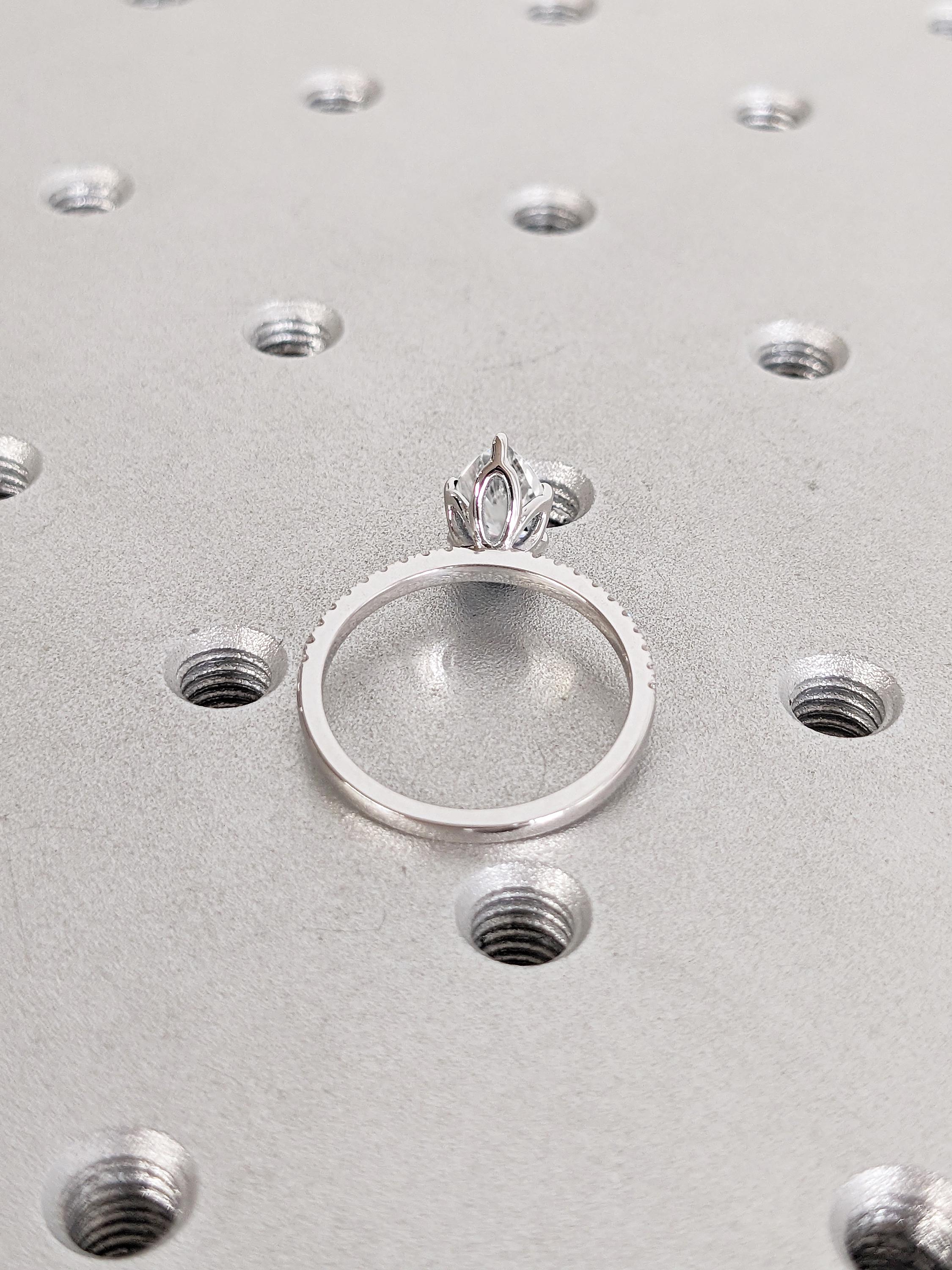 This stunning ring features an pear cut Lab Diamond at its center, set in a delicate gold band. The thin band is accented with sparkling half eternity Lab Diamonds on both sides for added brilliance. A timeless and elegant design perfect for any occasion!