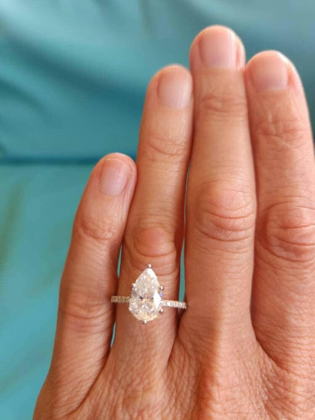 A beautiful pear shaped moissanite, set with a super delicate and thin setting, paved with a row of moissanites from both sides, a thin band of 1.6mm width, make this ring a true stunner!