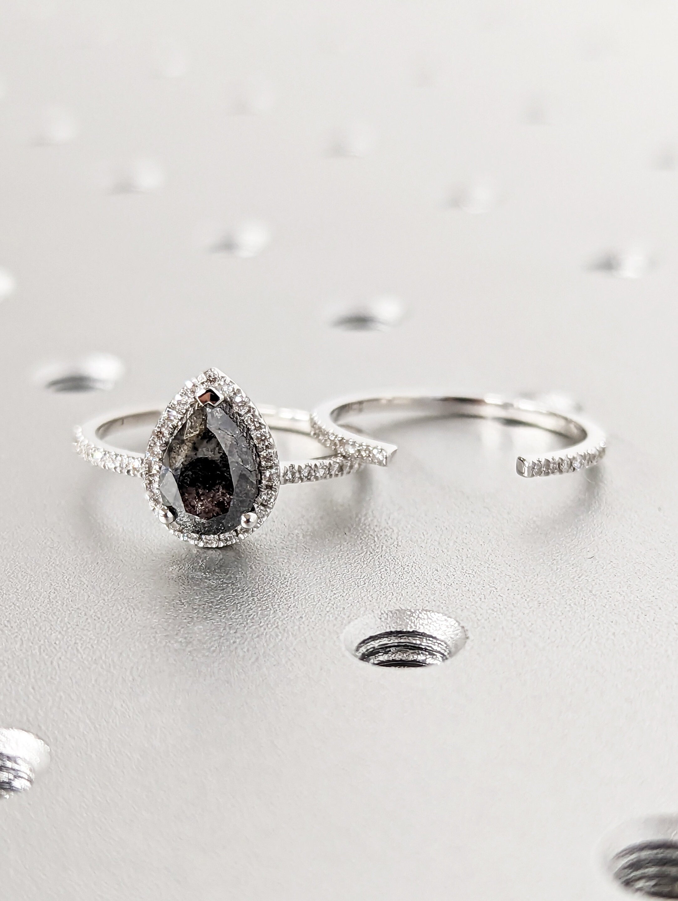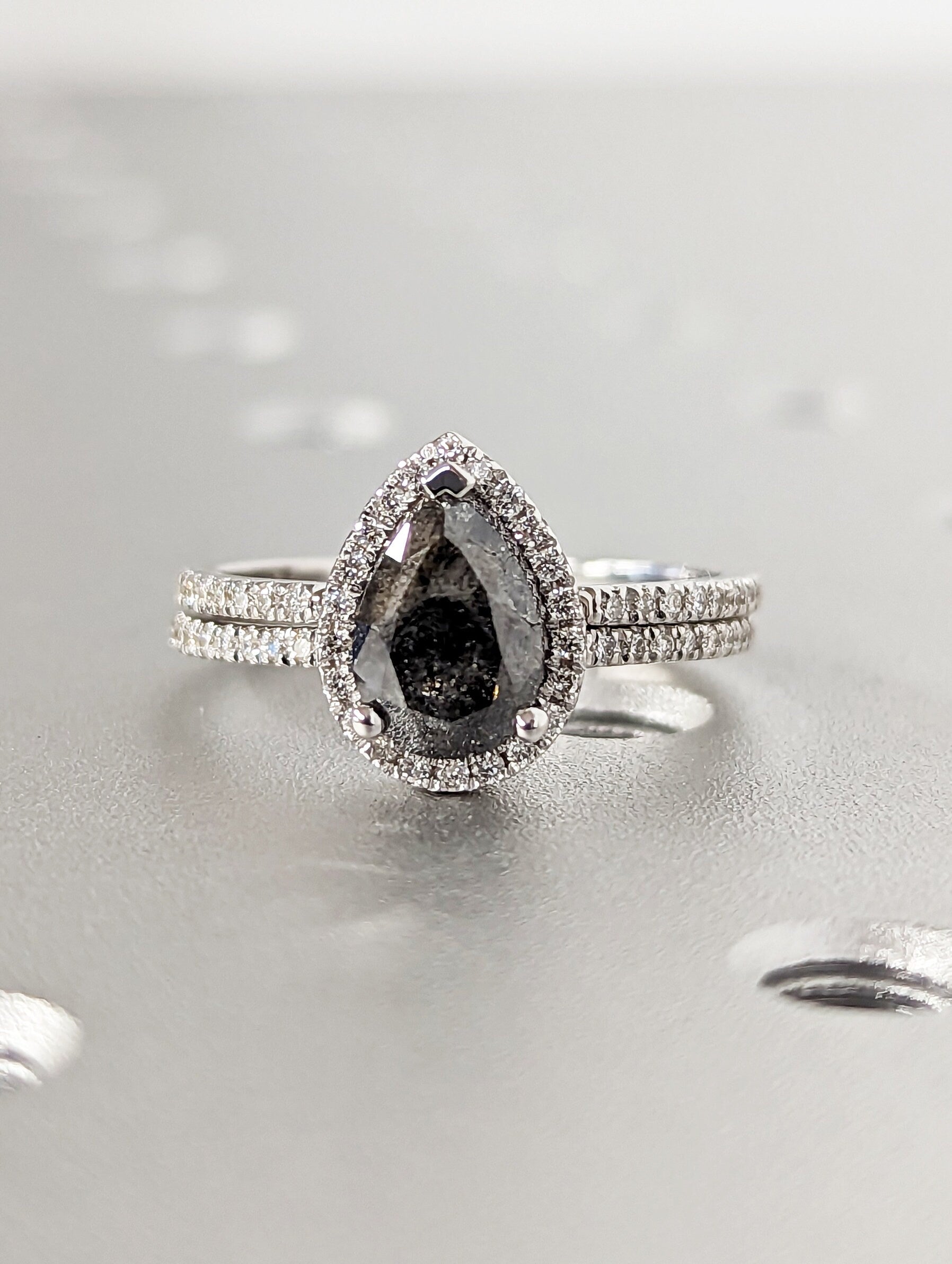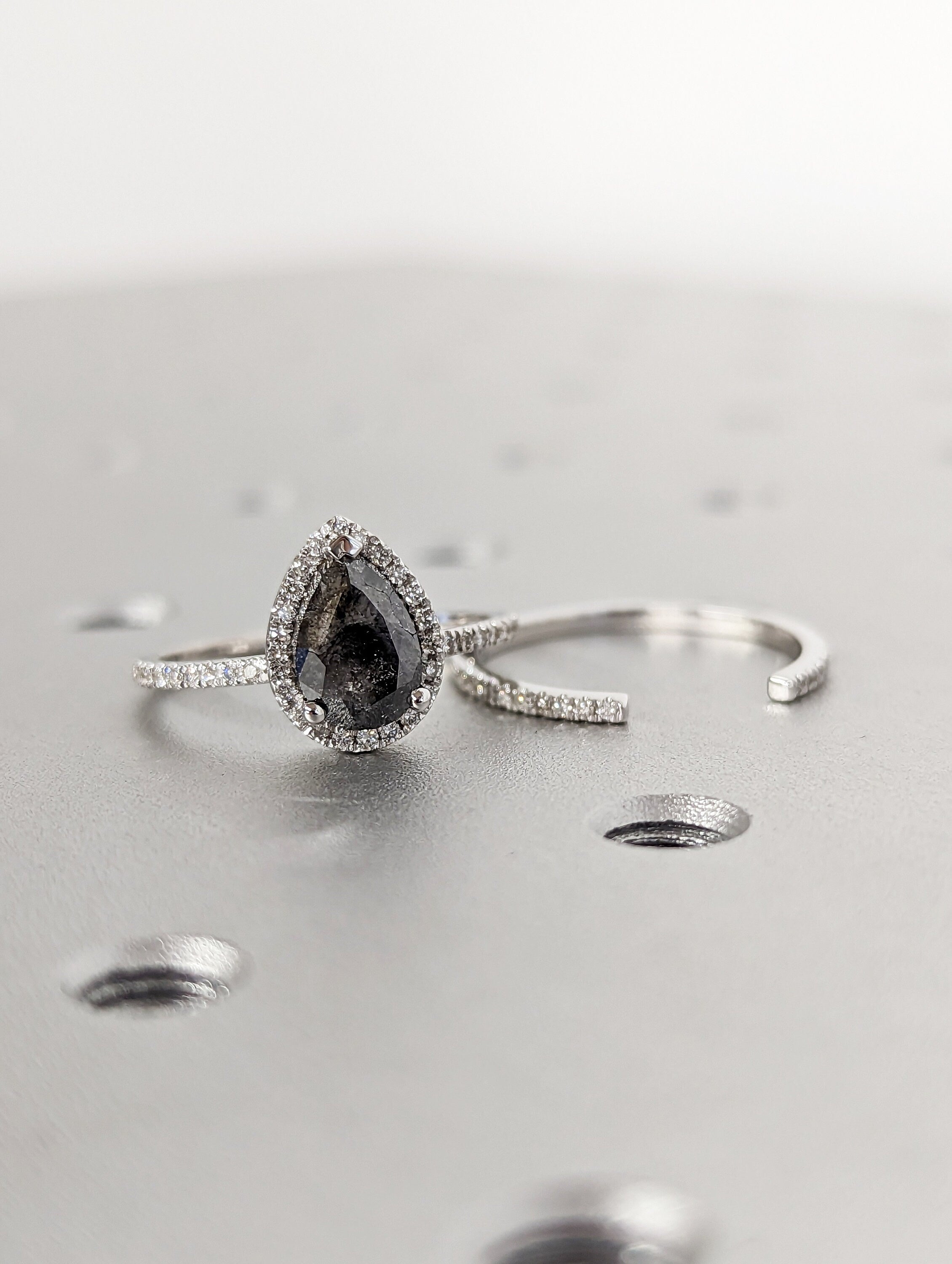 Pear Halo 18K White Gold Salt and Pepper Diamond engagement ring set Wedding Band For Women vintage Pear cut Halo diamond Anniversary ring