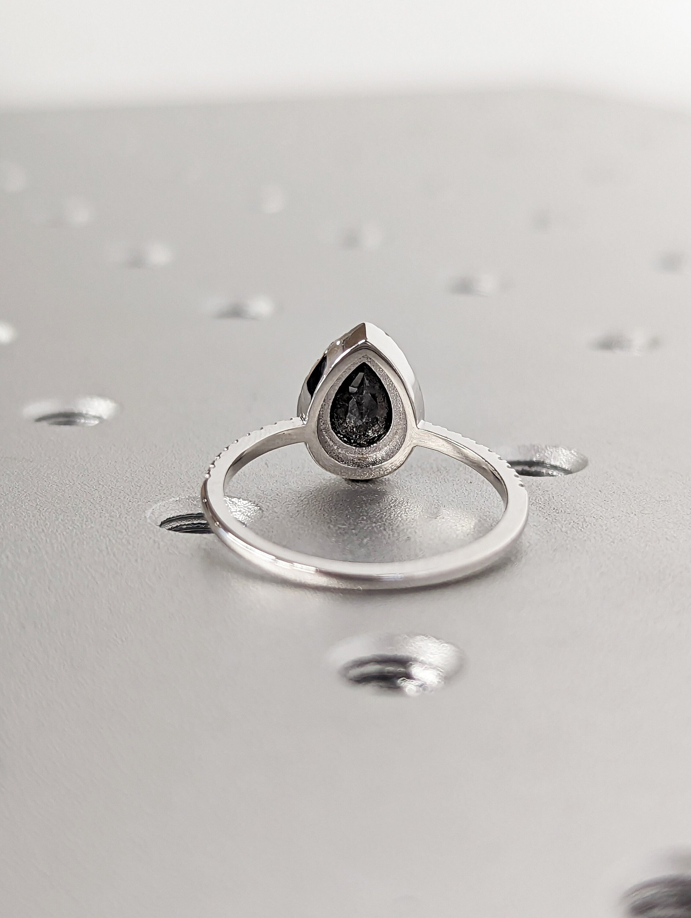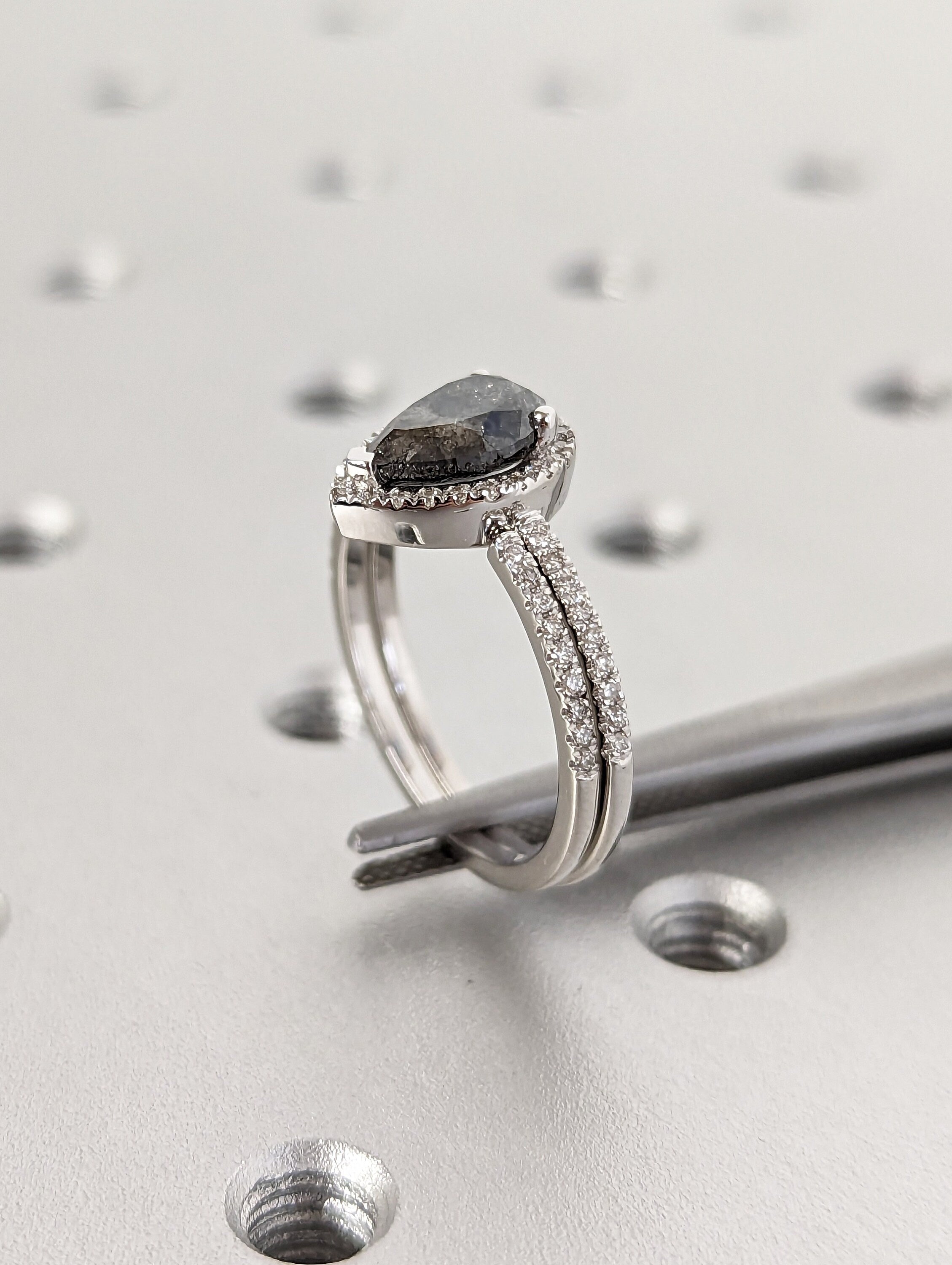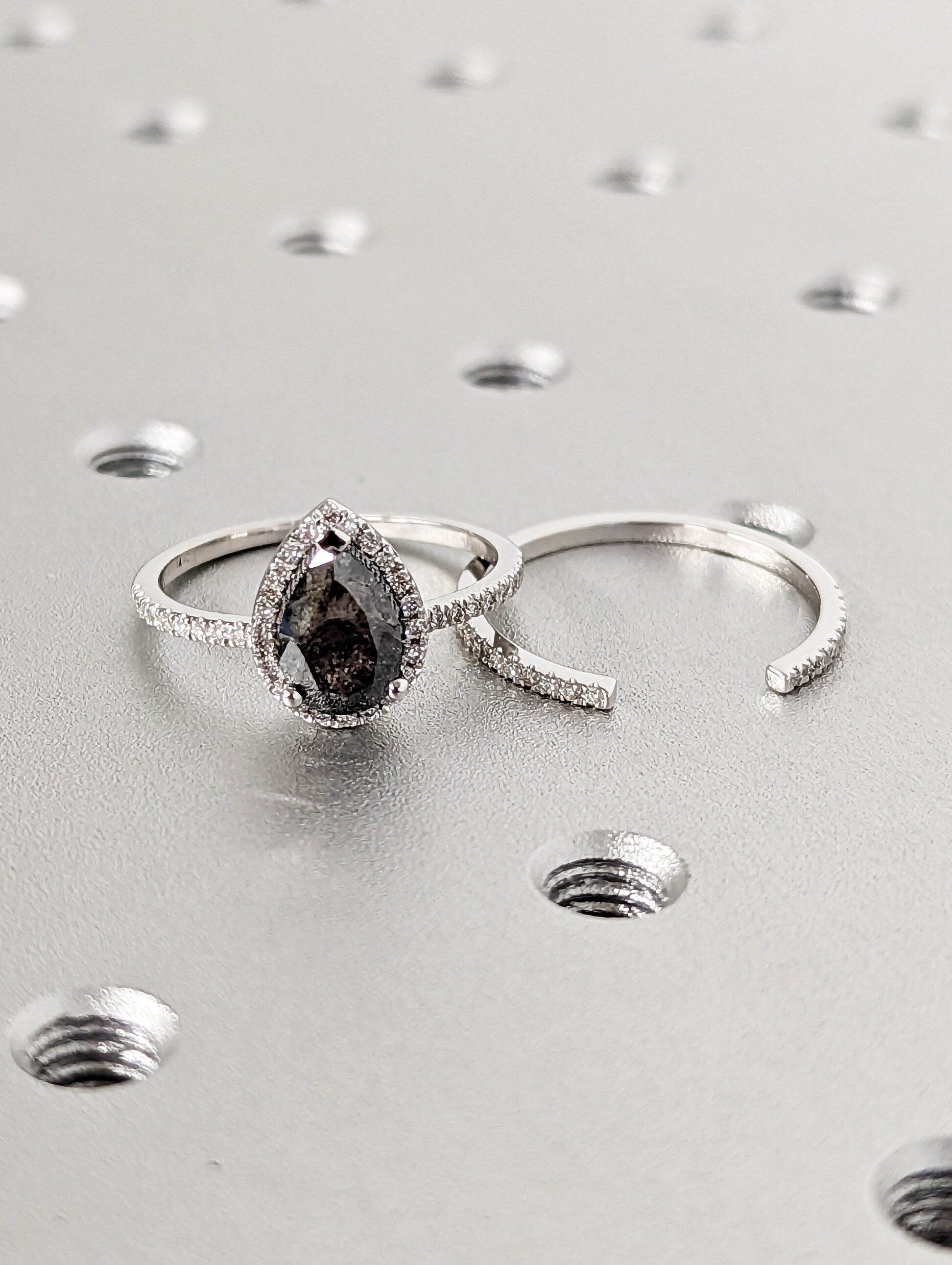 Pear Halo 18K White Gold Salt and Pepper Diamond engagement ring set Wedding Band For Women vintage Pear cut Halo diamond Anniversary ring
