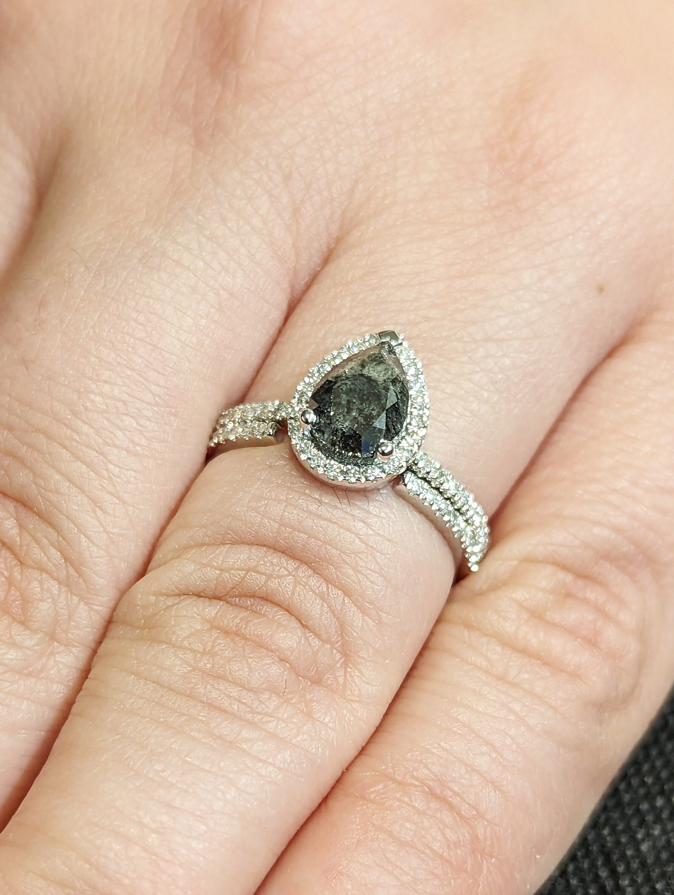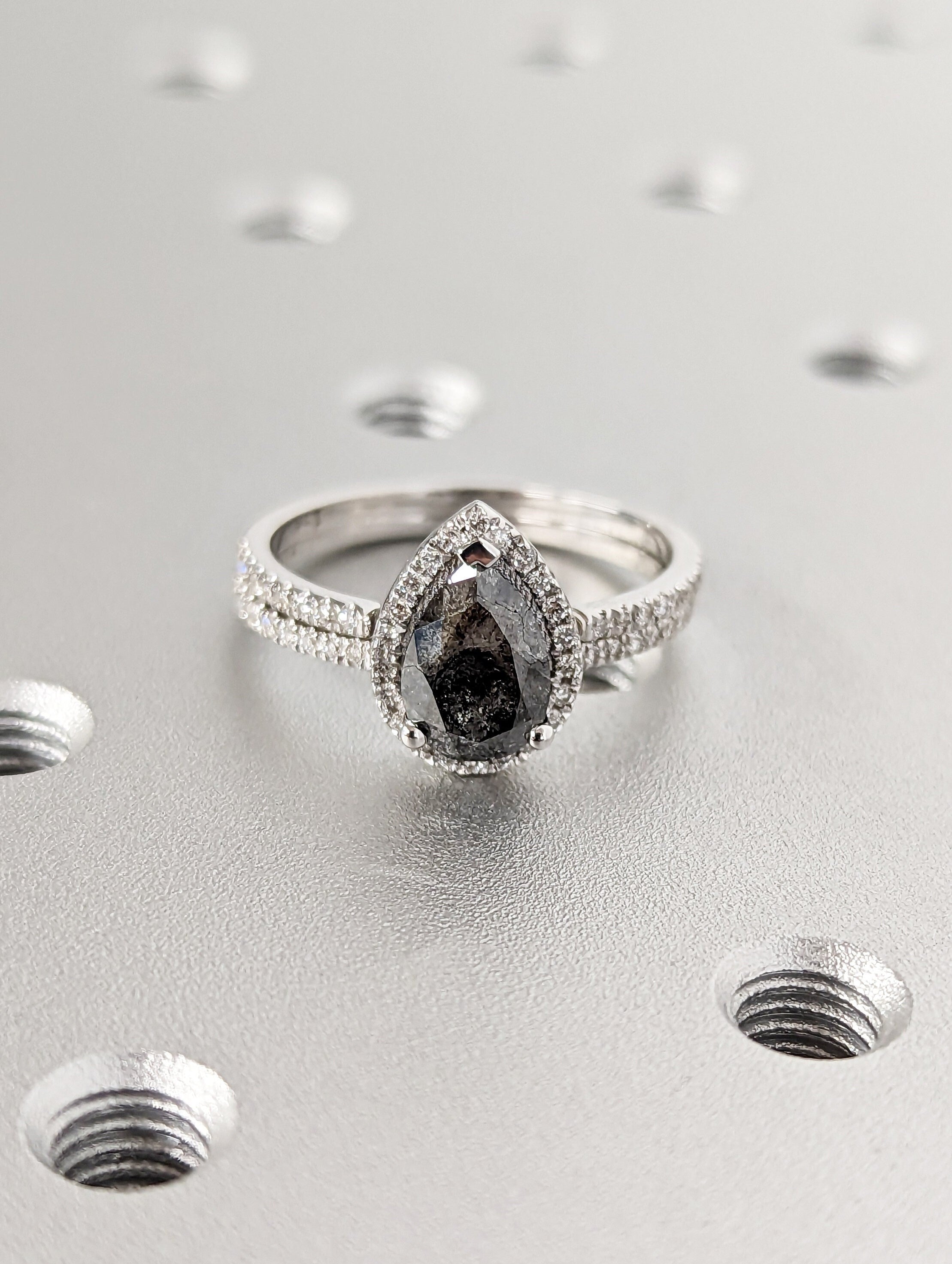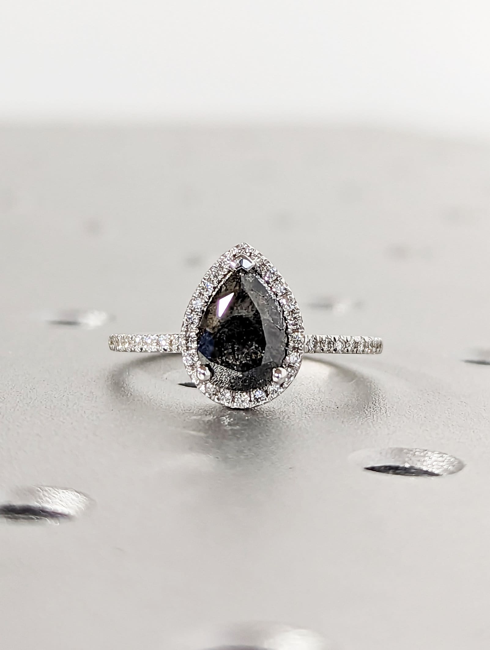 Enchanting vintage inspired design, with a unique pear shaped full cut salt and pepper diamond, adorned with a halo of natural round