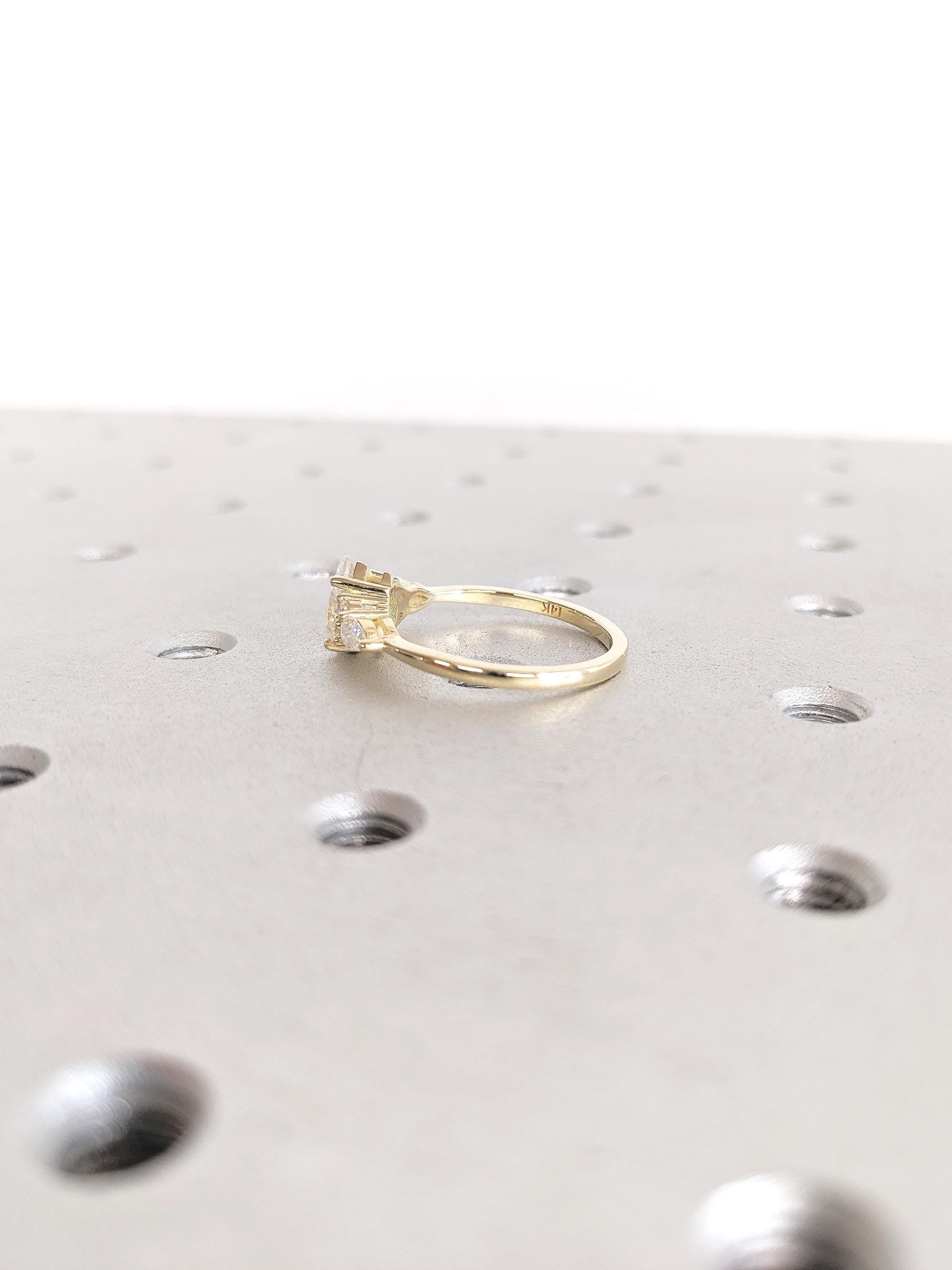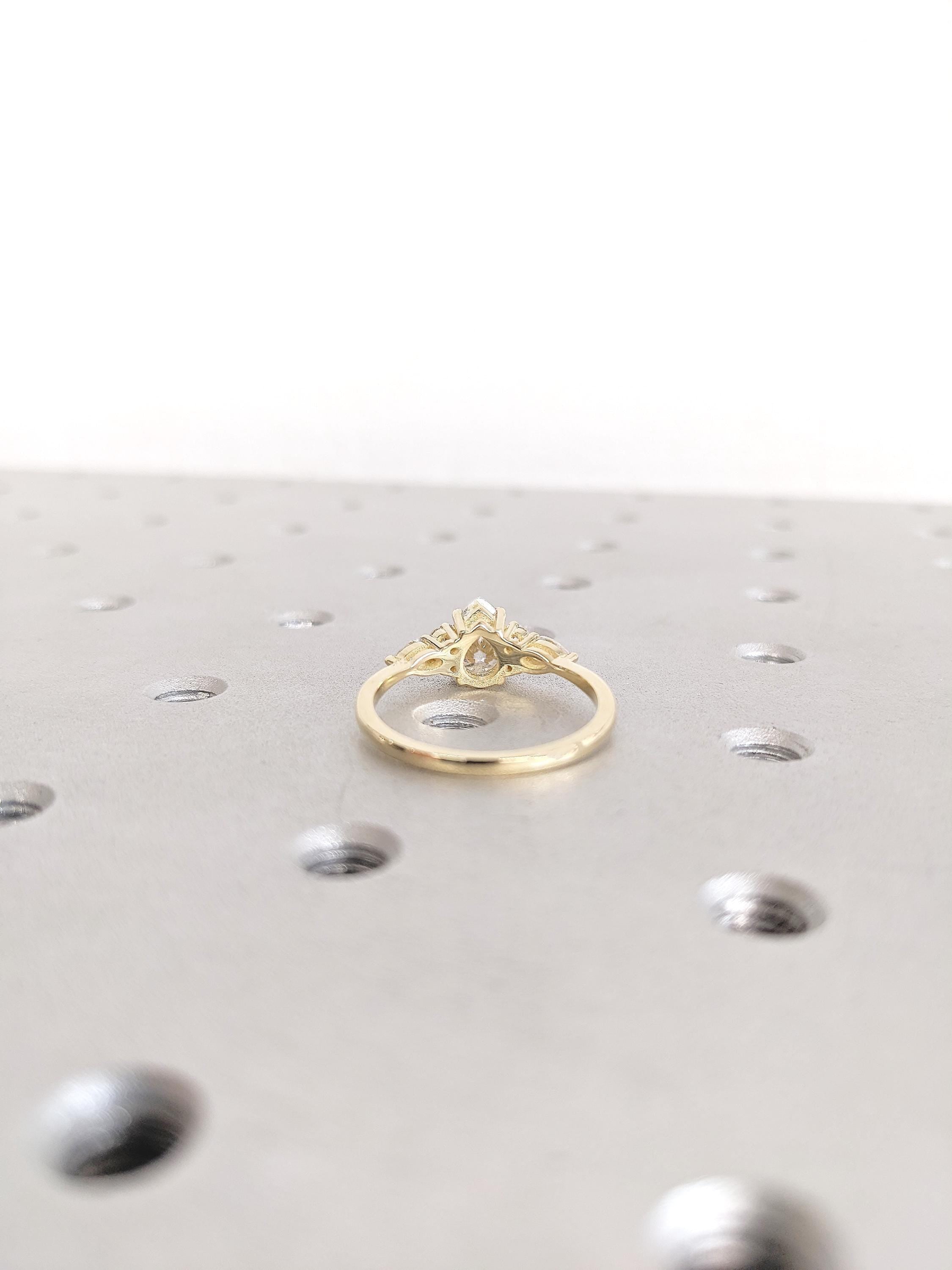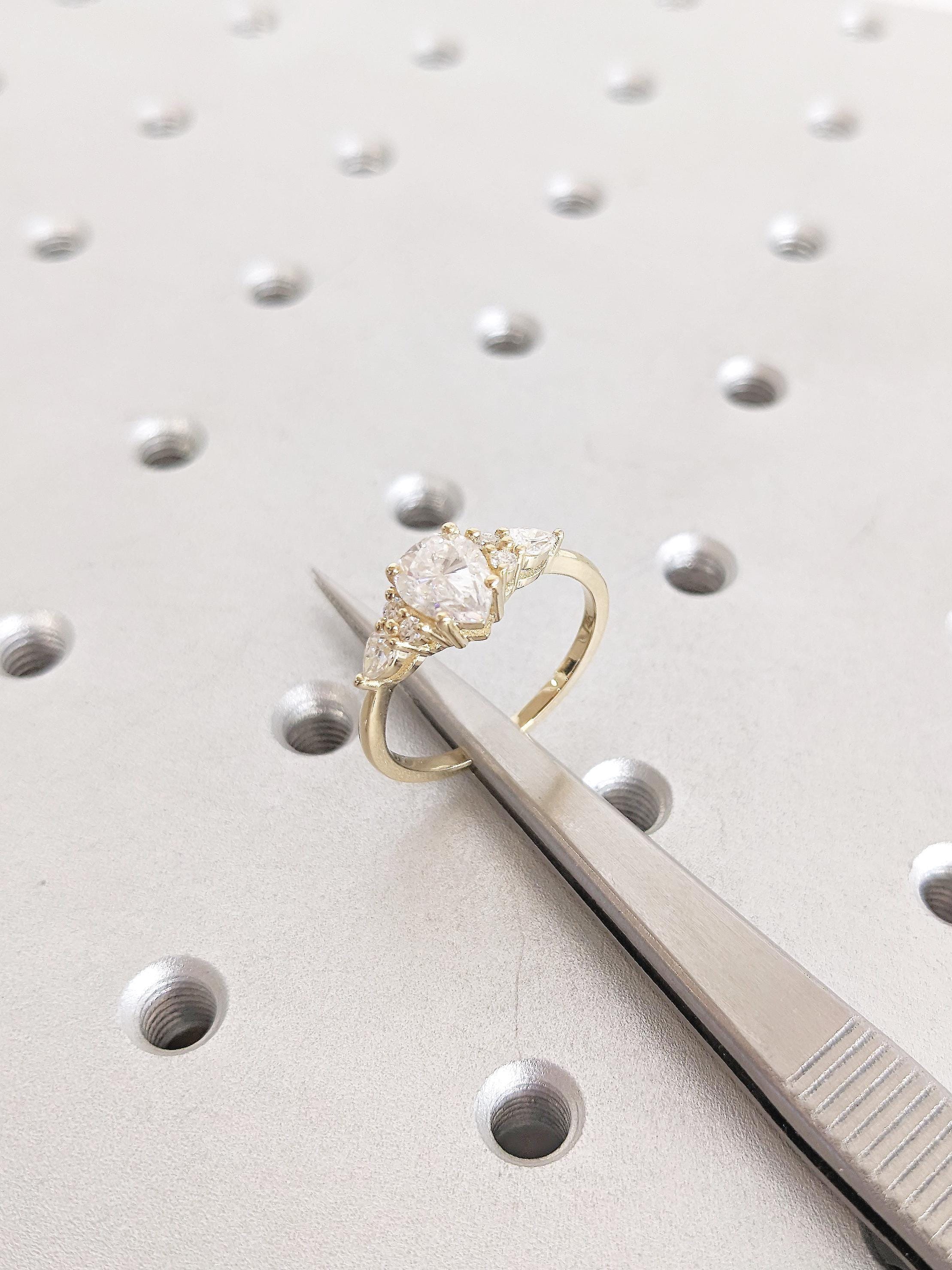 This engagement ring features a pear-cut Lab Grown Diamond in a classic prong setting, accented with round and pear-cut Moissanites or Natural Diamonds along a delicate gold band. Handcrafted with care, it’s a timeless piece that makes a meaningful gift for any special occasion.
