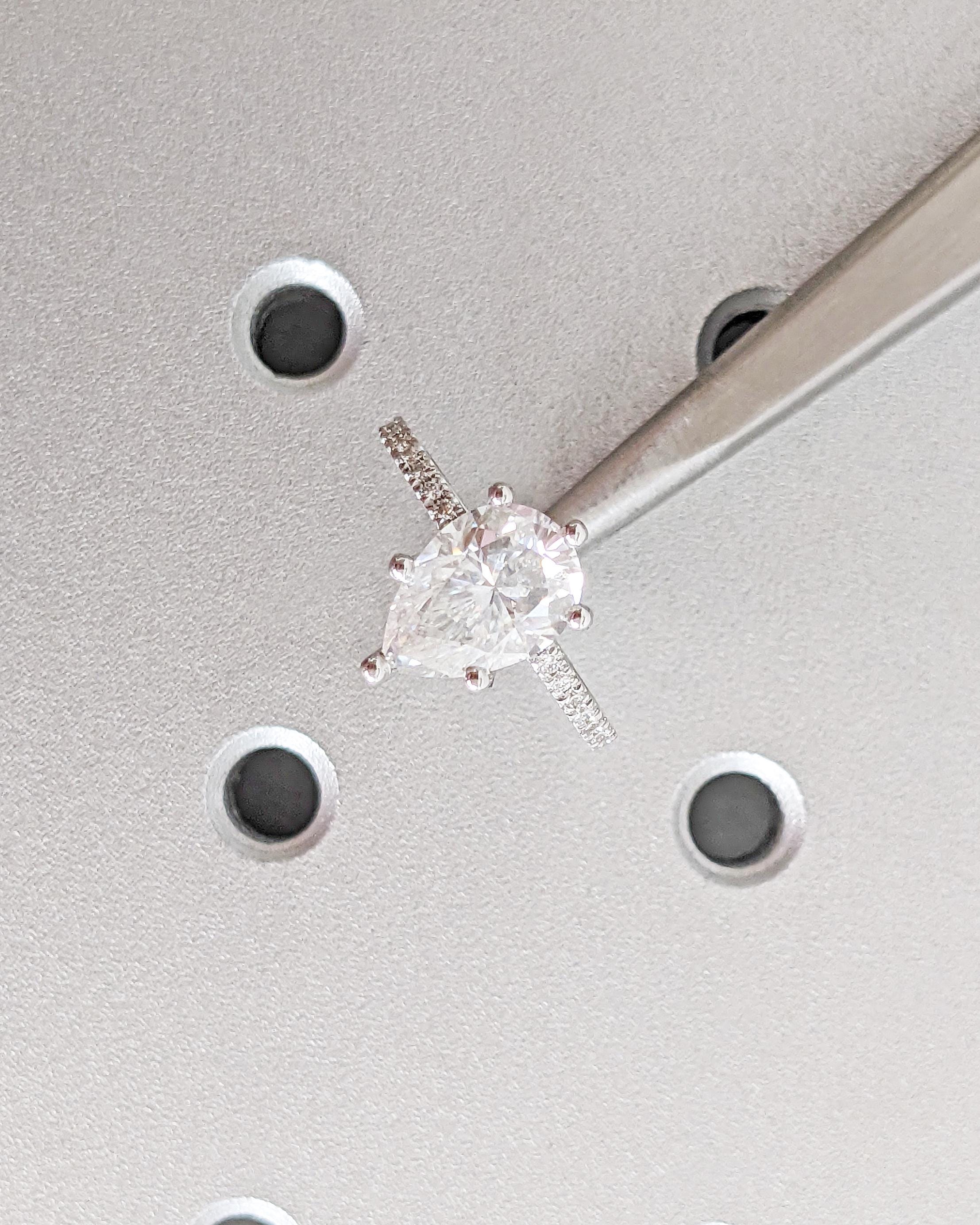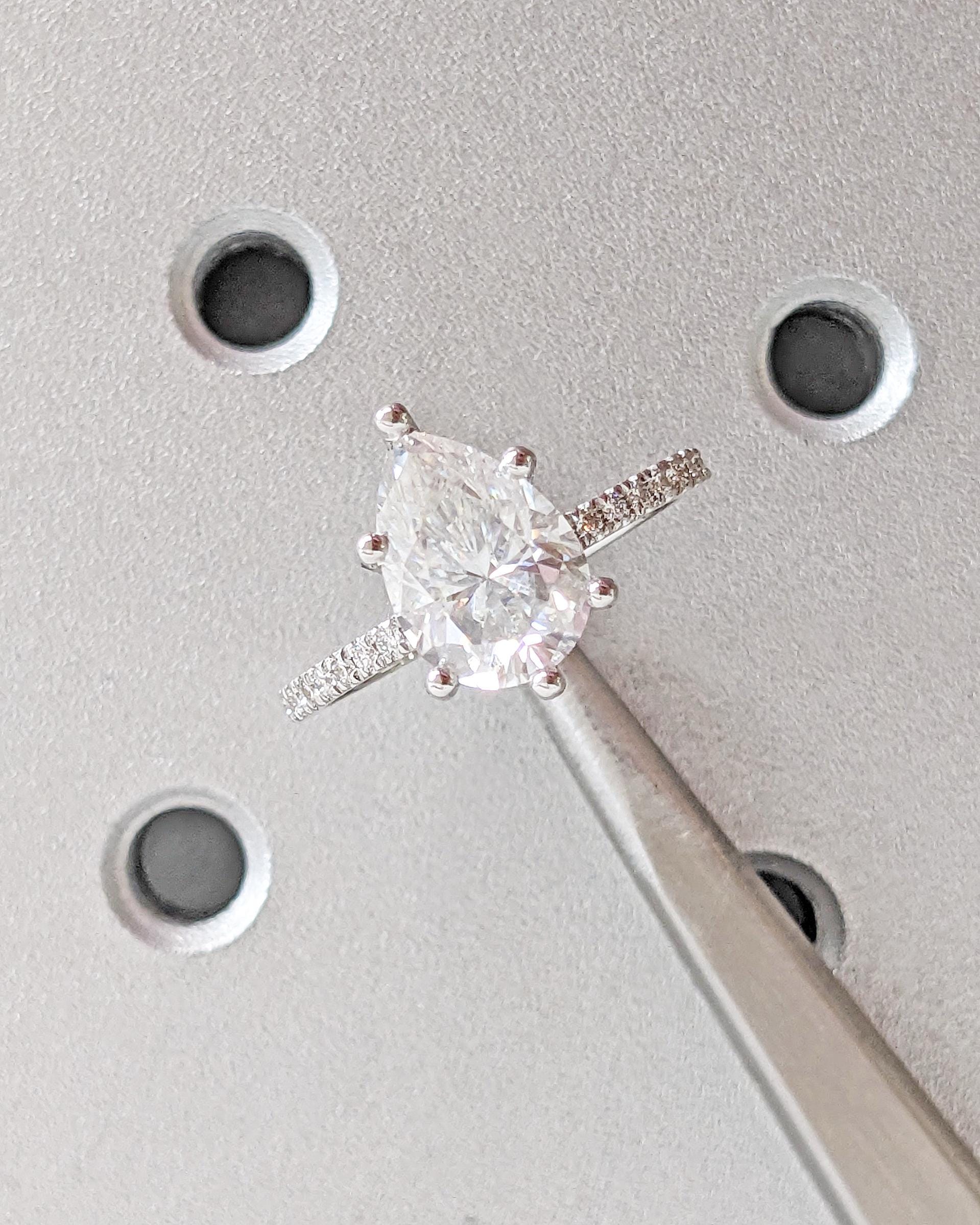 A beautiful pear shaped Lab Cultured Diamond solitaire, set atop a hidden halo of natural diamonds or moisssanite on a thin band of 1.6mm width. Minimalist yet elegant, this fine piece of jewelry is the perfect gift for any occasion.