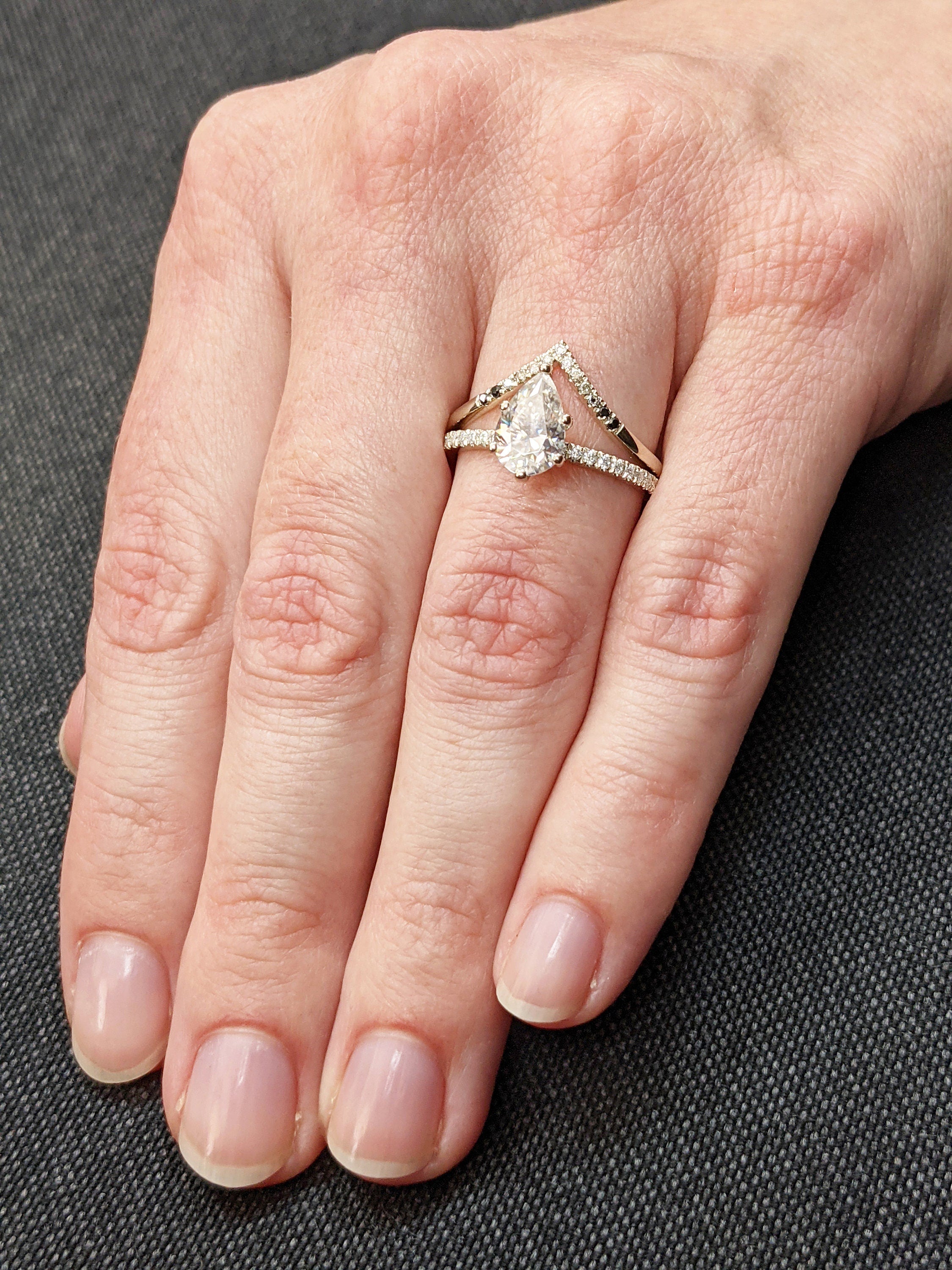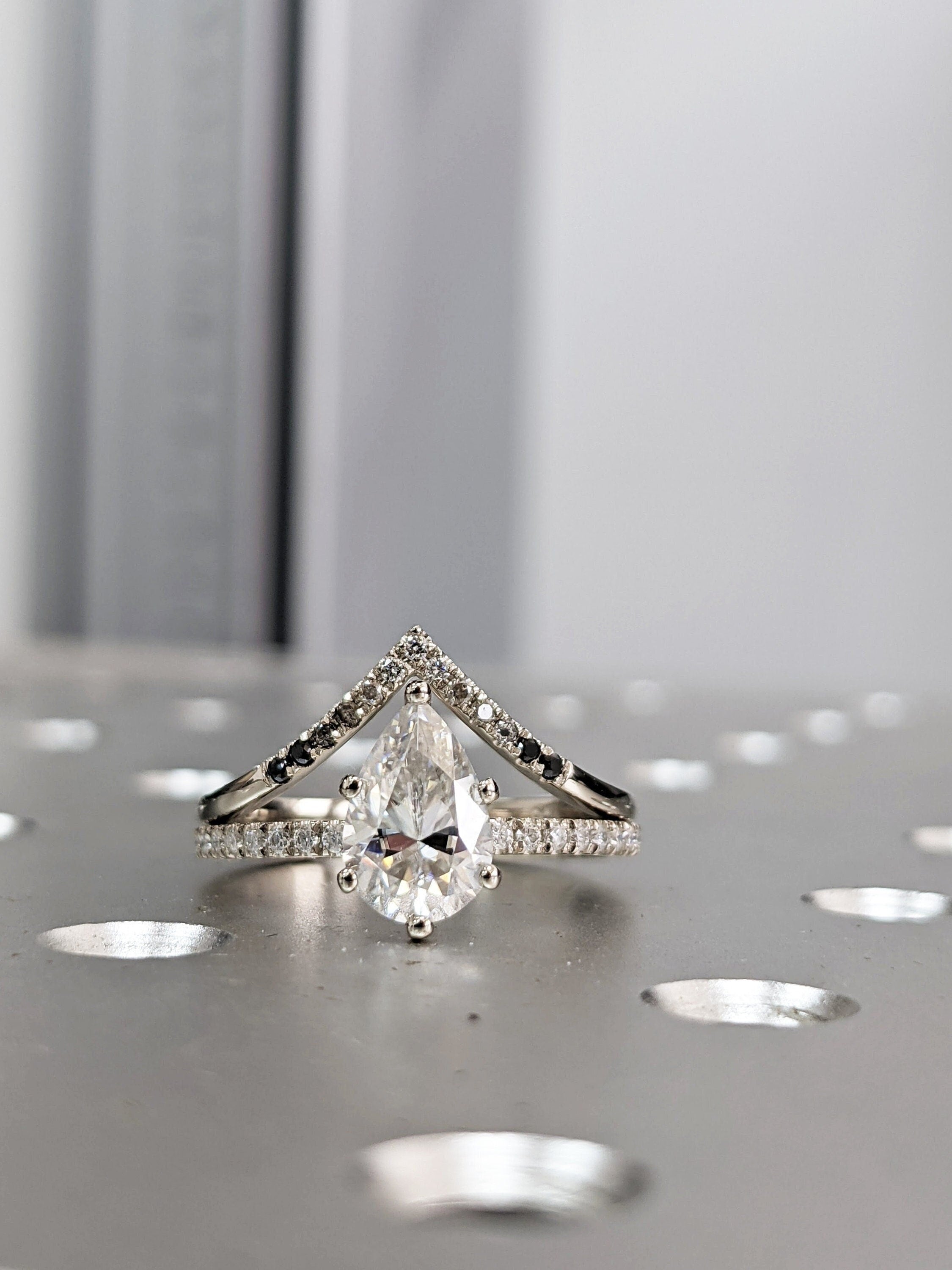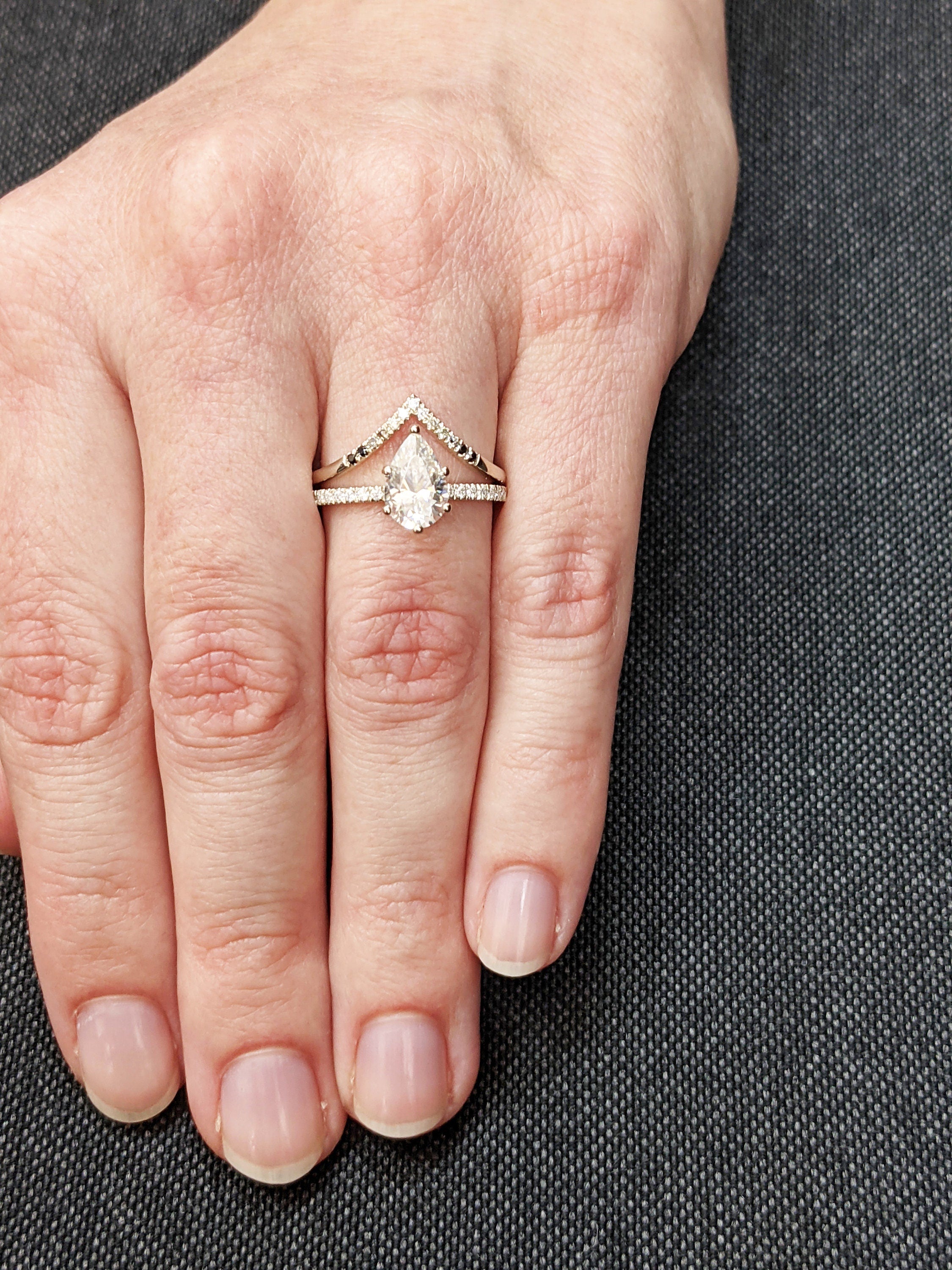 A beautiful pear shaped moissanite, set with a super delicate and thin setting, paved with a row of diamonds from both sides, a thin band of 1.6mm width, make this ring a true stunner! Can match with a unique Ombre diamond band.