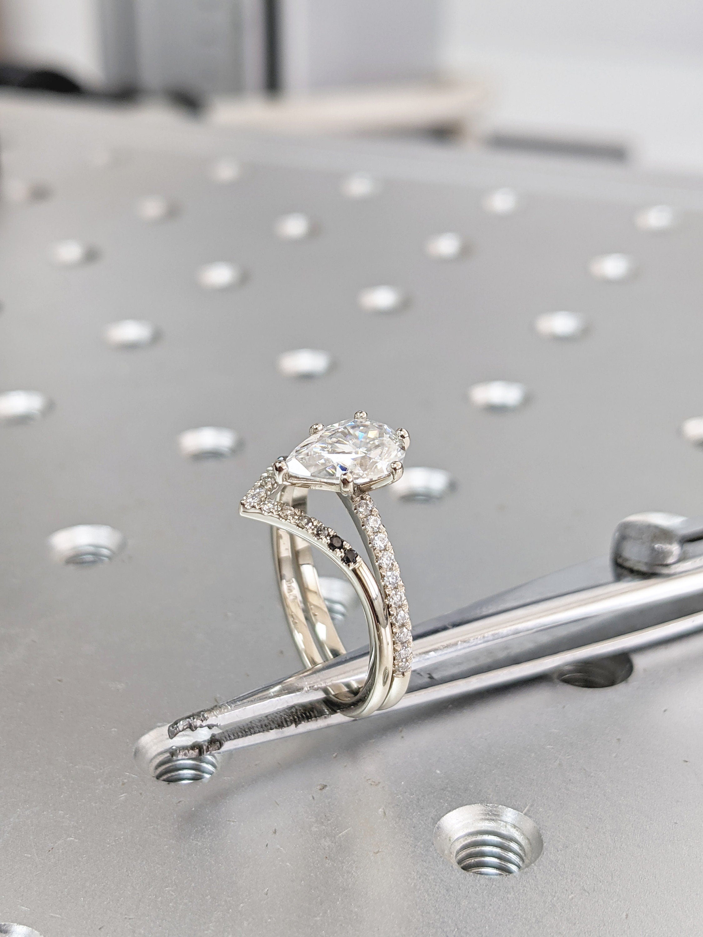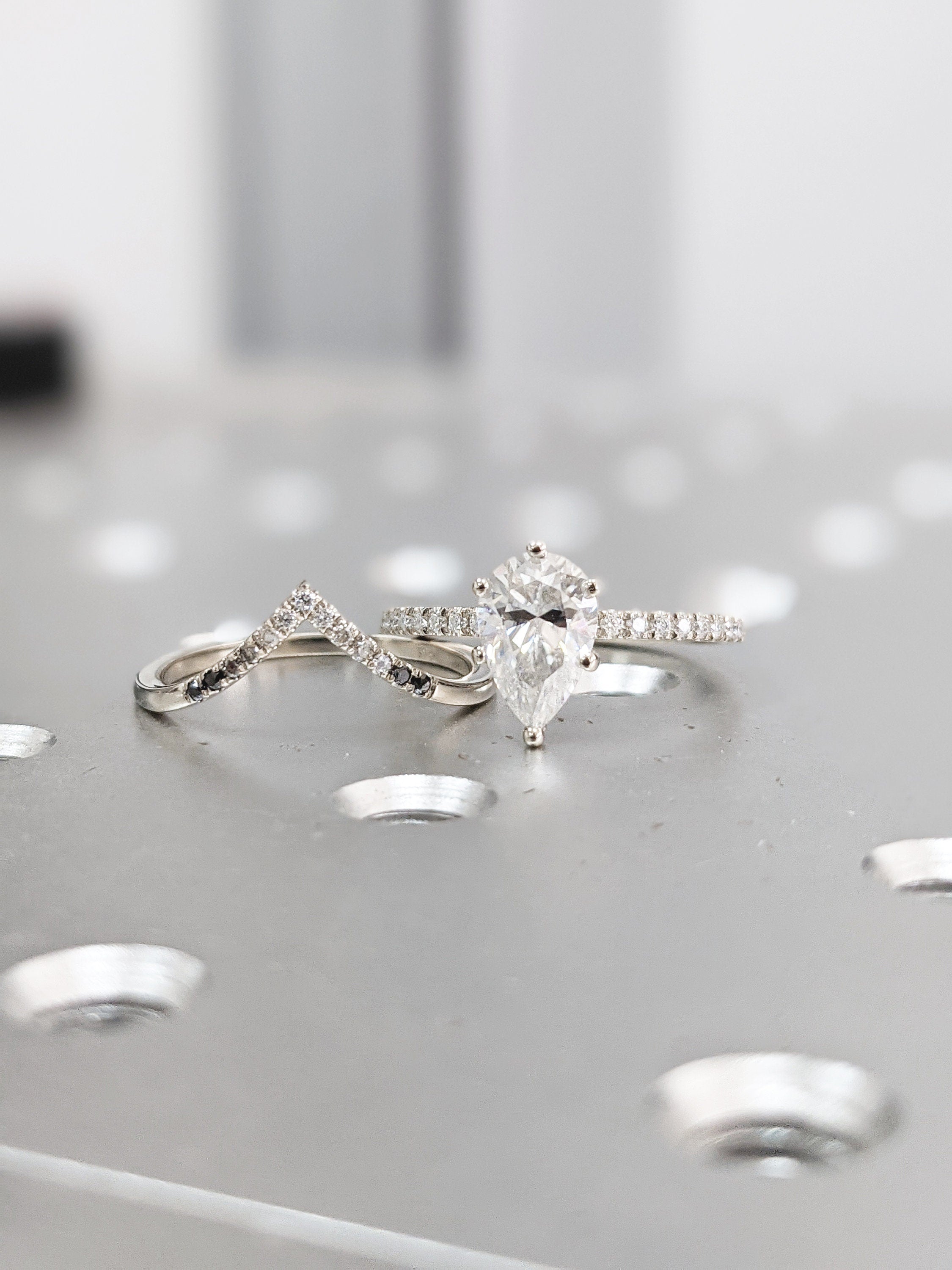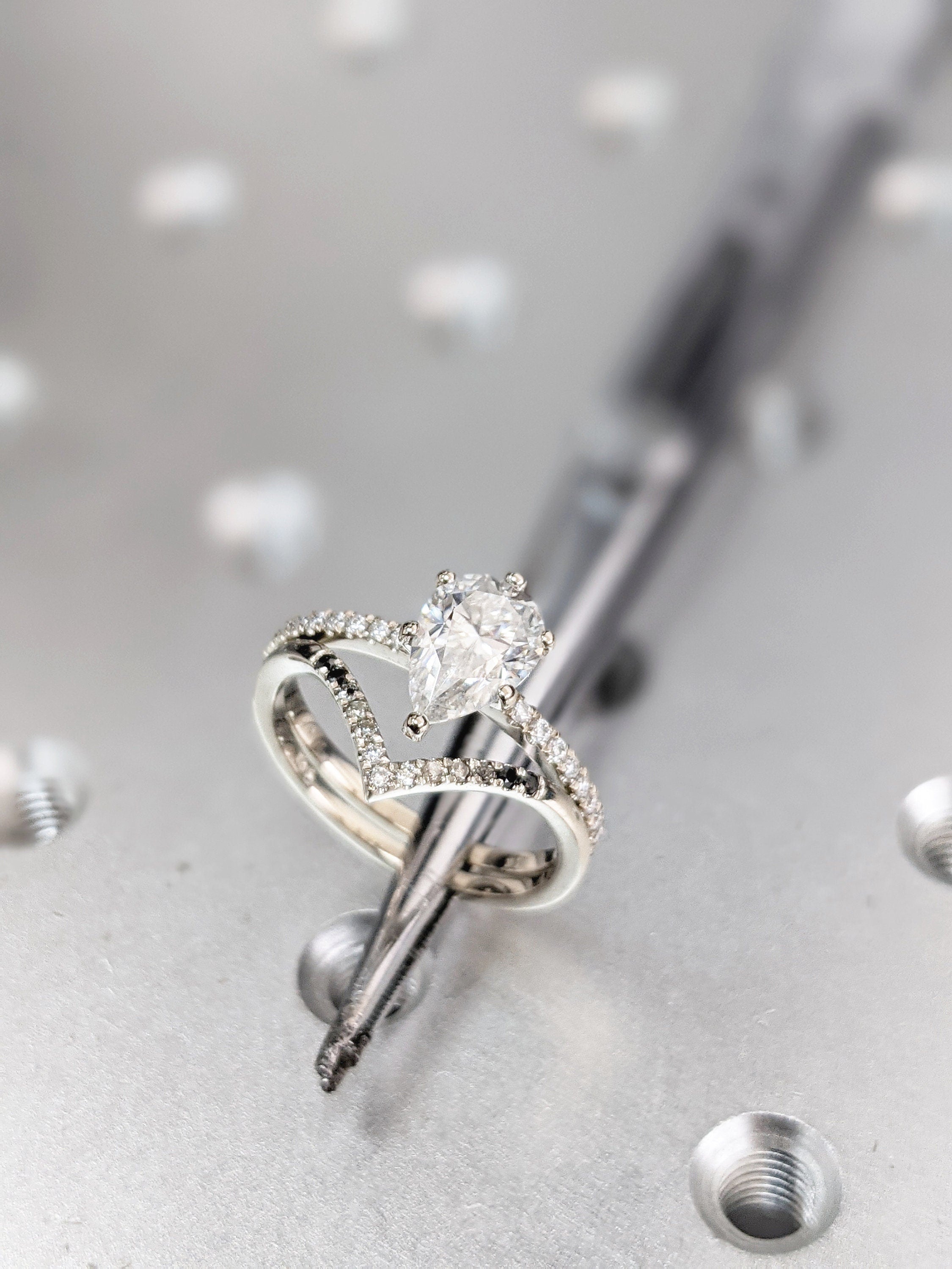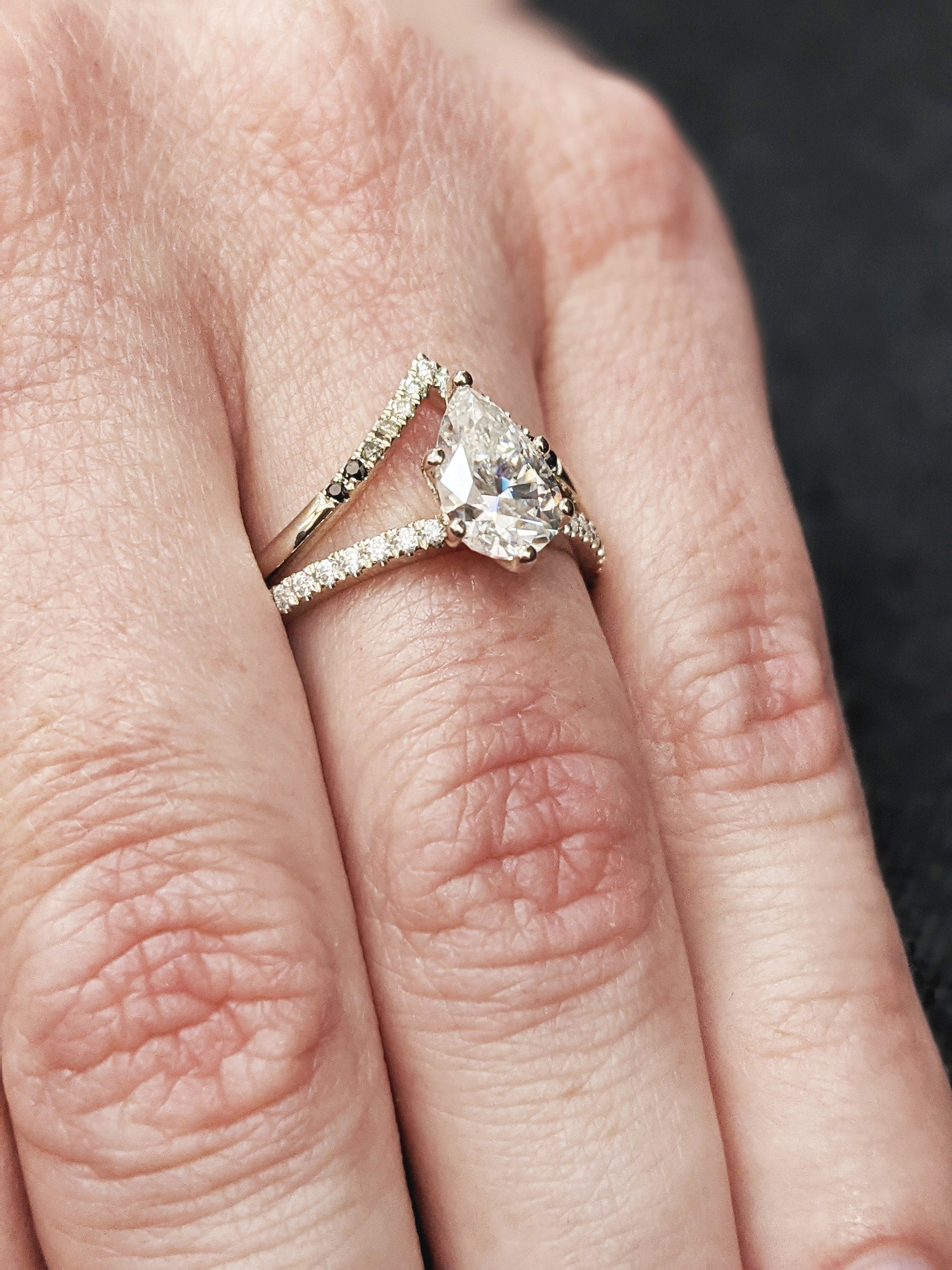 A beautiful pear shaped moissanite, set with a super delicate and thin setting, paved with a row of diamonds from both sides, a thin band of 1.6mm width, make this ring a true stunner! Can match with a unique Ombre diamond band.