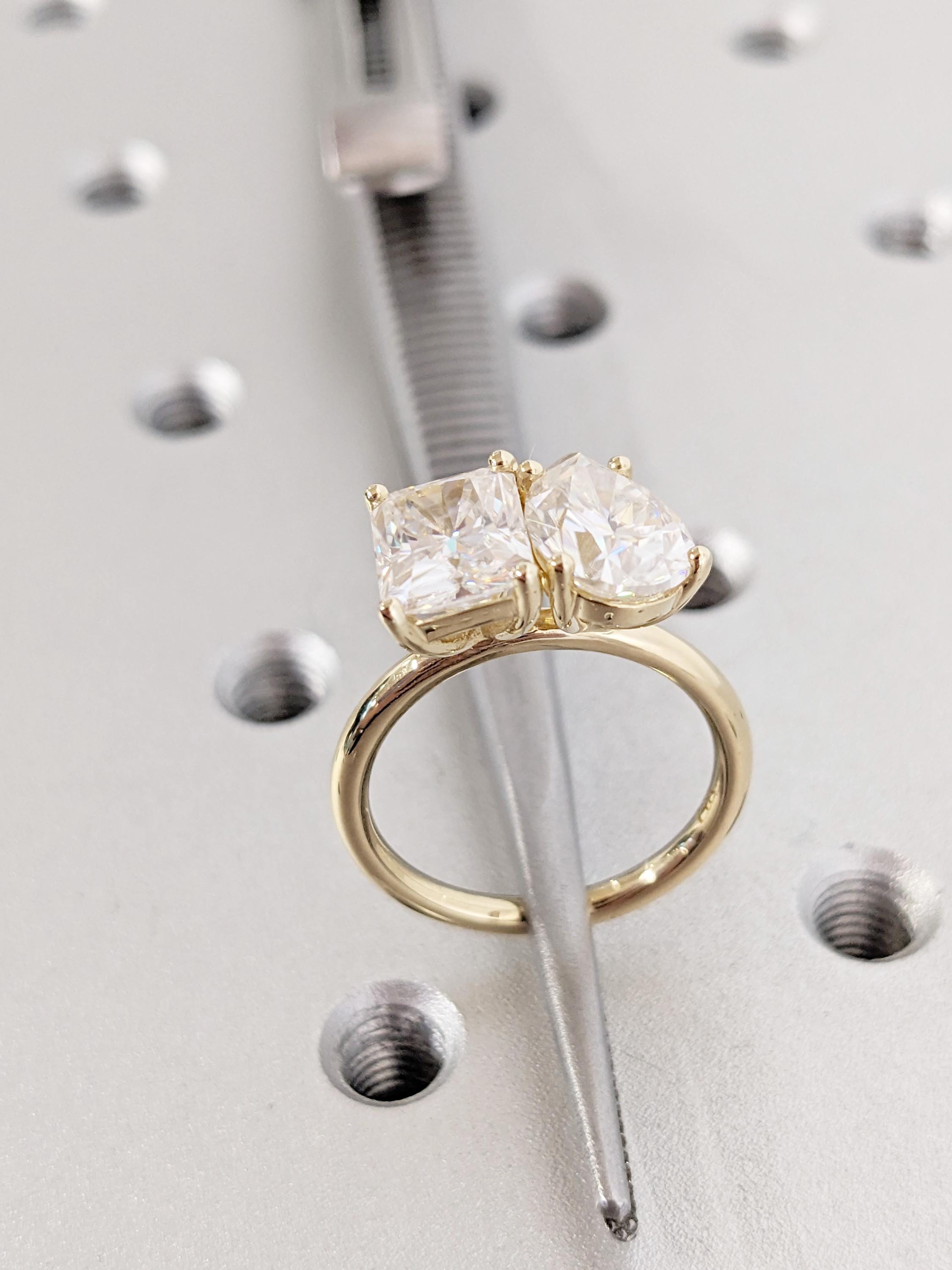 This Two Stone Moissanite Ring pairs a radiant Moissanite and a pear Moissanite in a prong setting, creating a bright duet of sparkle with a modern yet romantic look. The clean band draws attention to both stones, making this design perfect as an engagement ring, promise ring, bridal gift, or elegant everyday piece.