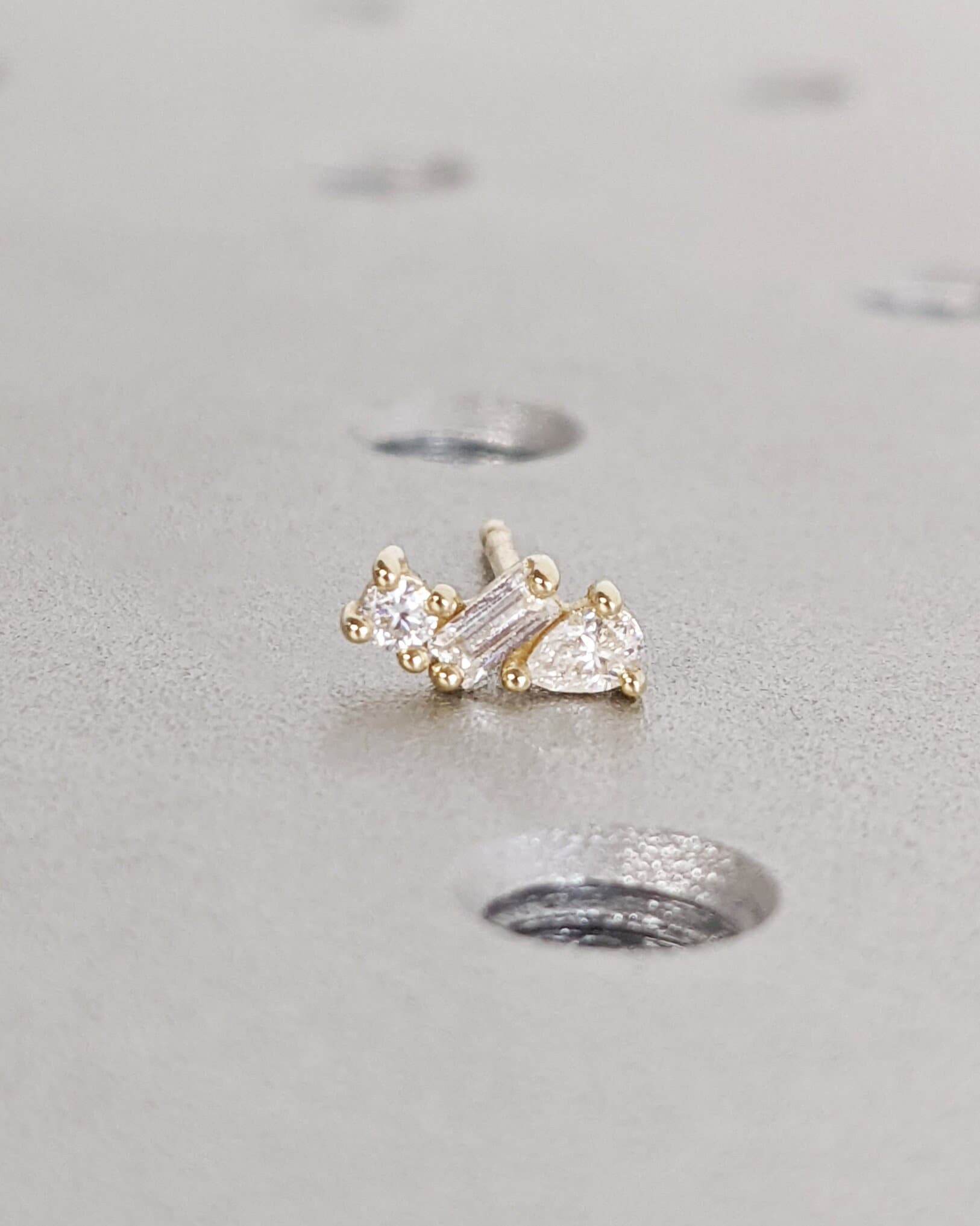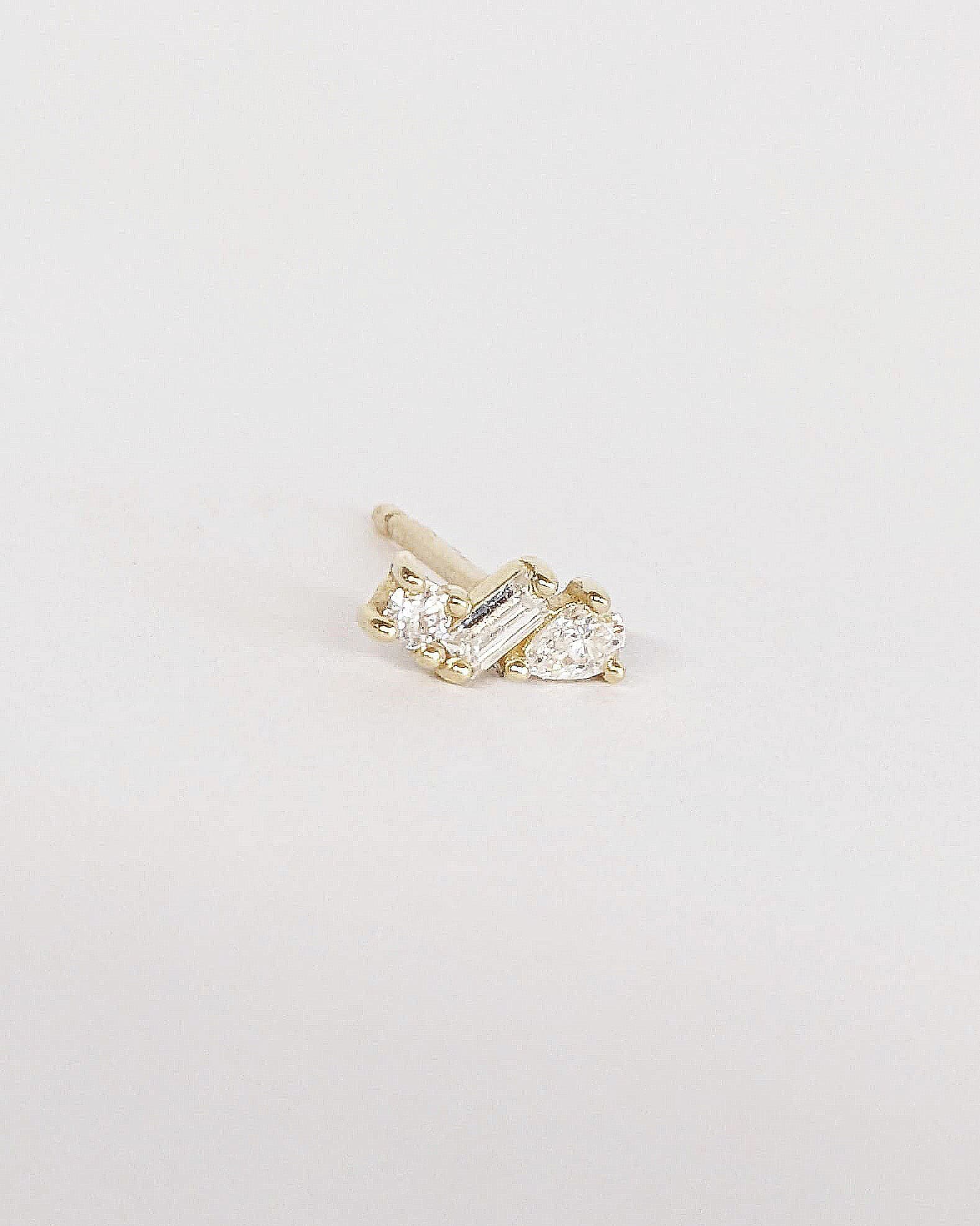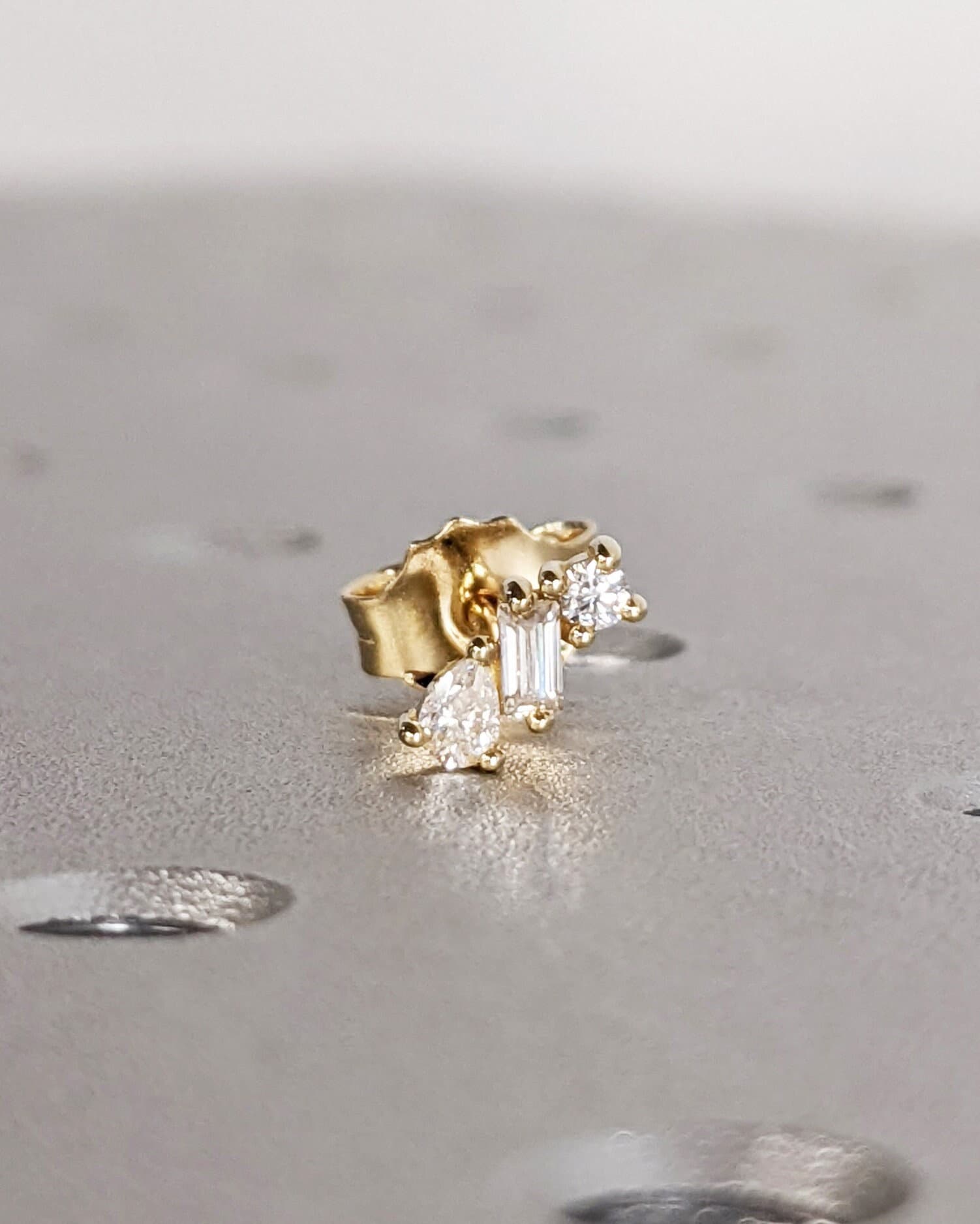 Elevate your style with our enchanting three-stone solid gold earrings, featuring a delicate cluster of tiny pear, baguette, and round Moissanites. Whether you opt for a single earring or a pair, these earrings effortlessly combine classic charm with modern sophistication for an exquisite addition to your jewelry ensemble.