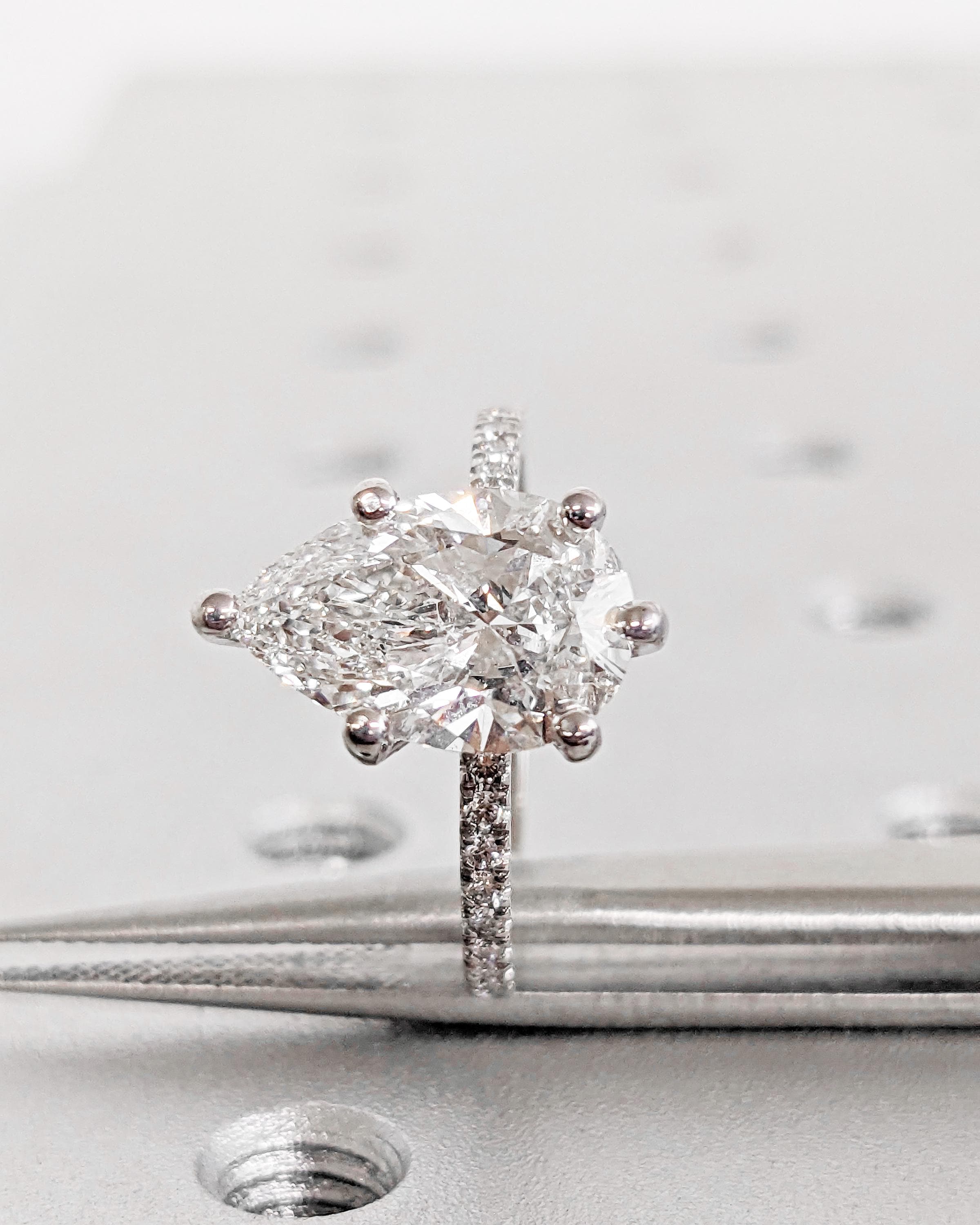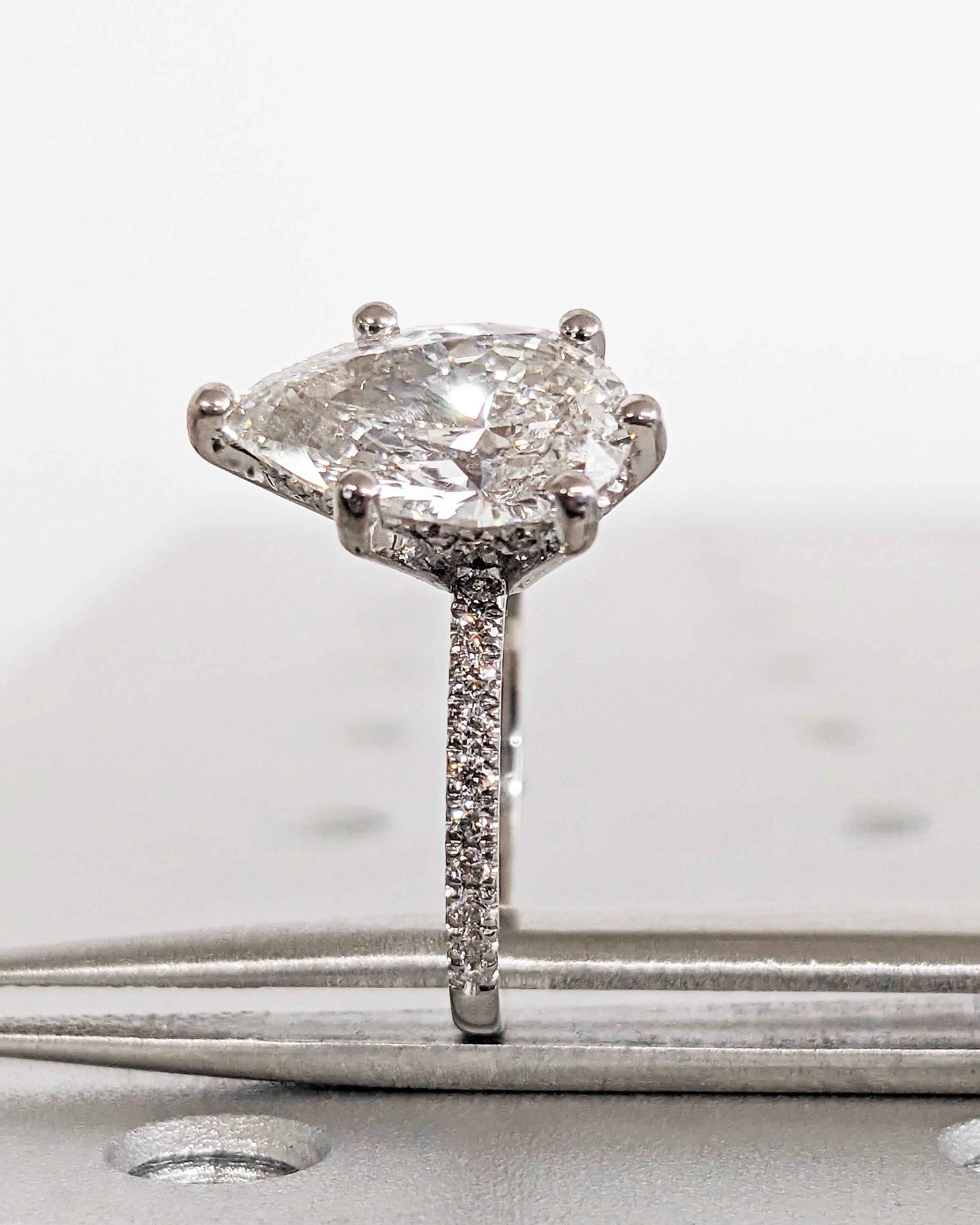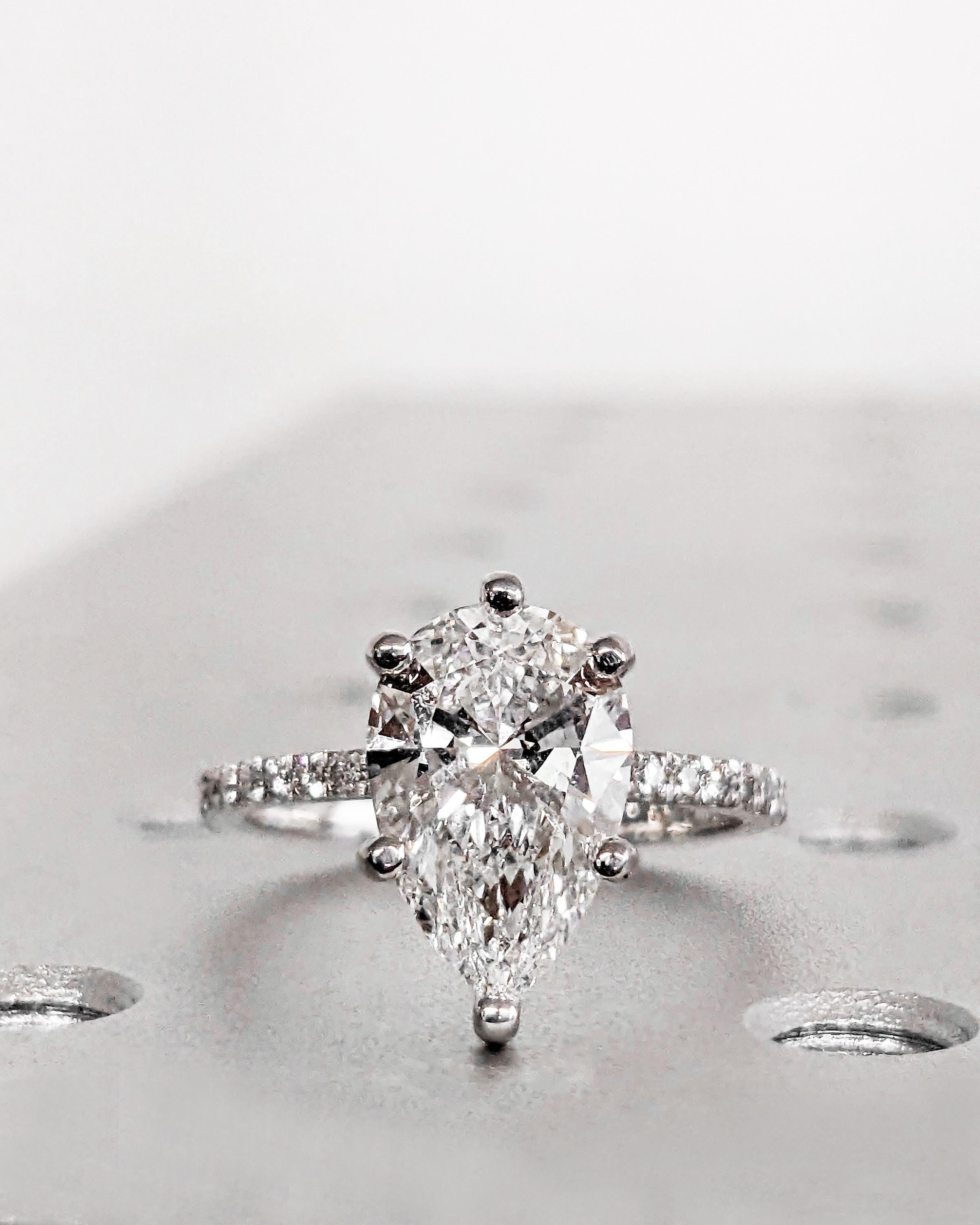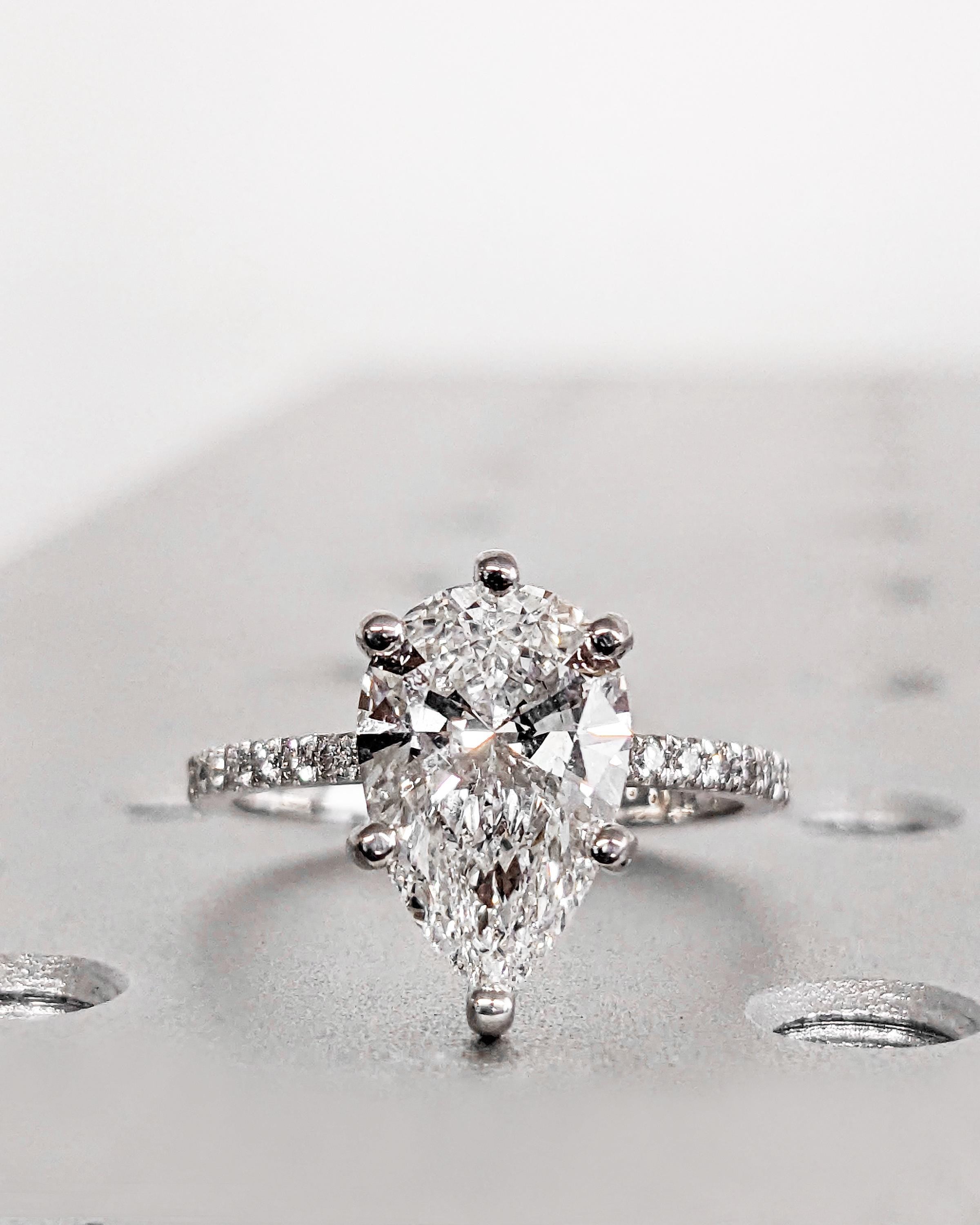The delicate pristine flat-topped, slight tapered band, makes way for the perfectly poised Pear cut Lab Diamond. Embellished with a hidden halo for a luxurious sparkle, this ring is a classic and a head-turner!