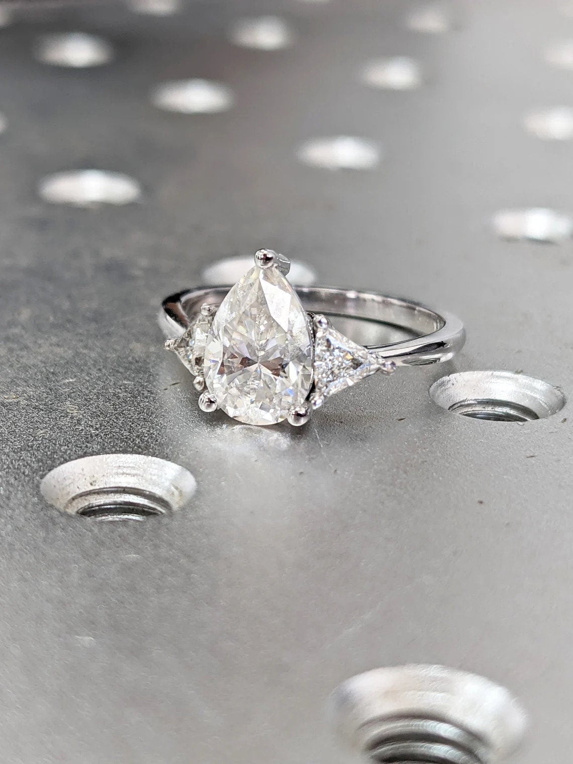 A beautiful pear shaped moissanite, set with a super delicate and thin setting, paved with a row of diamonds from both sides, a thin band of 1.6mm width, make this ring a true stunner!