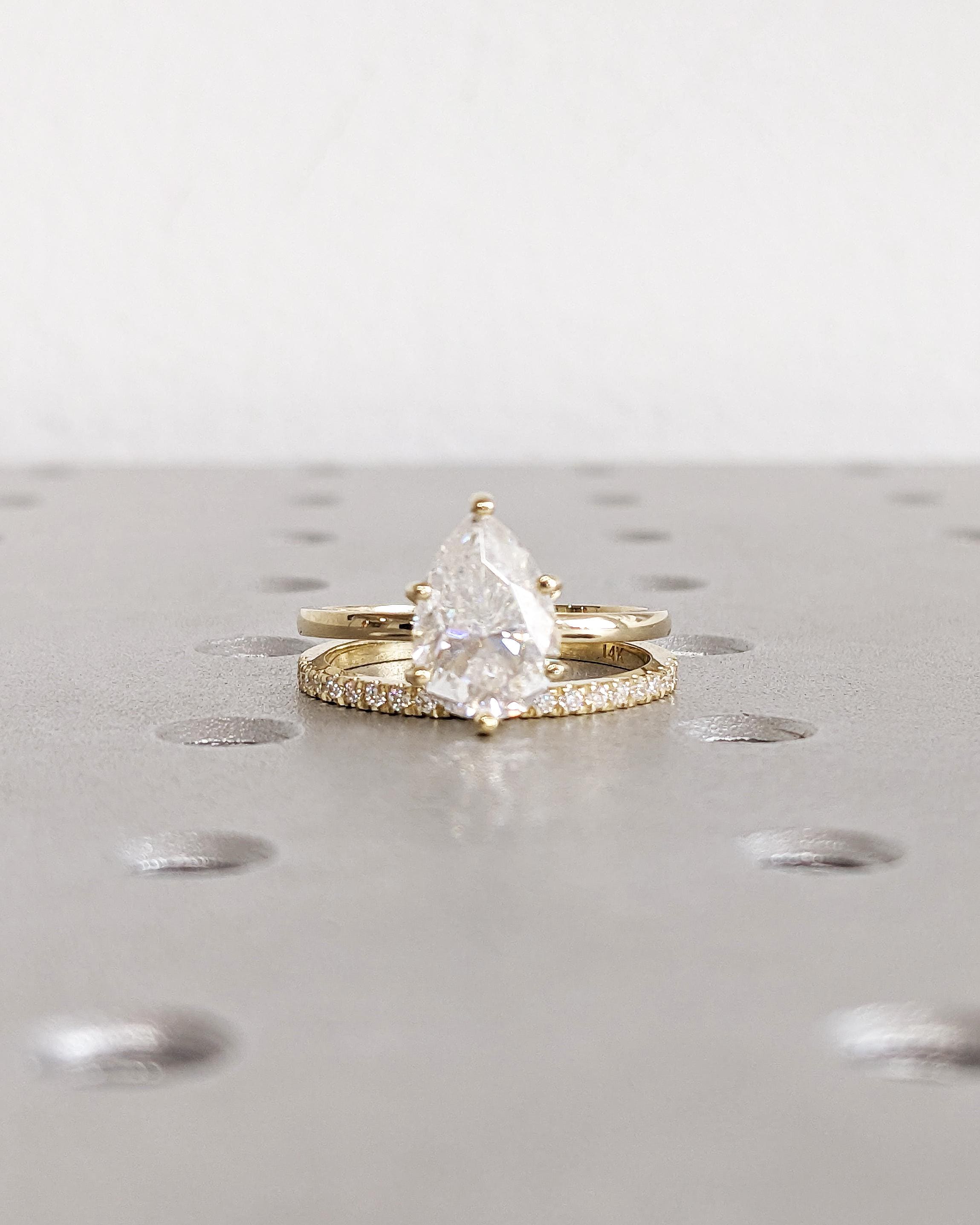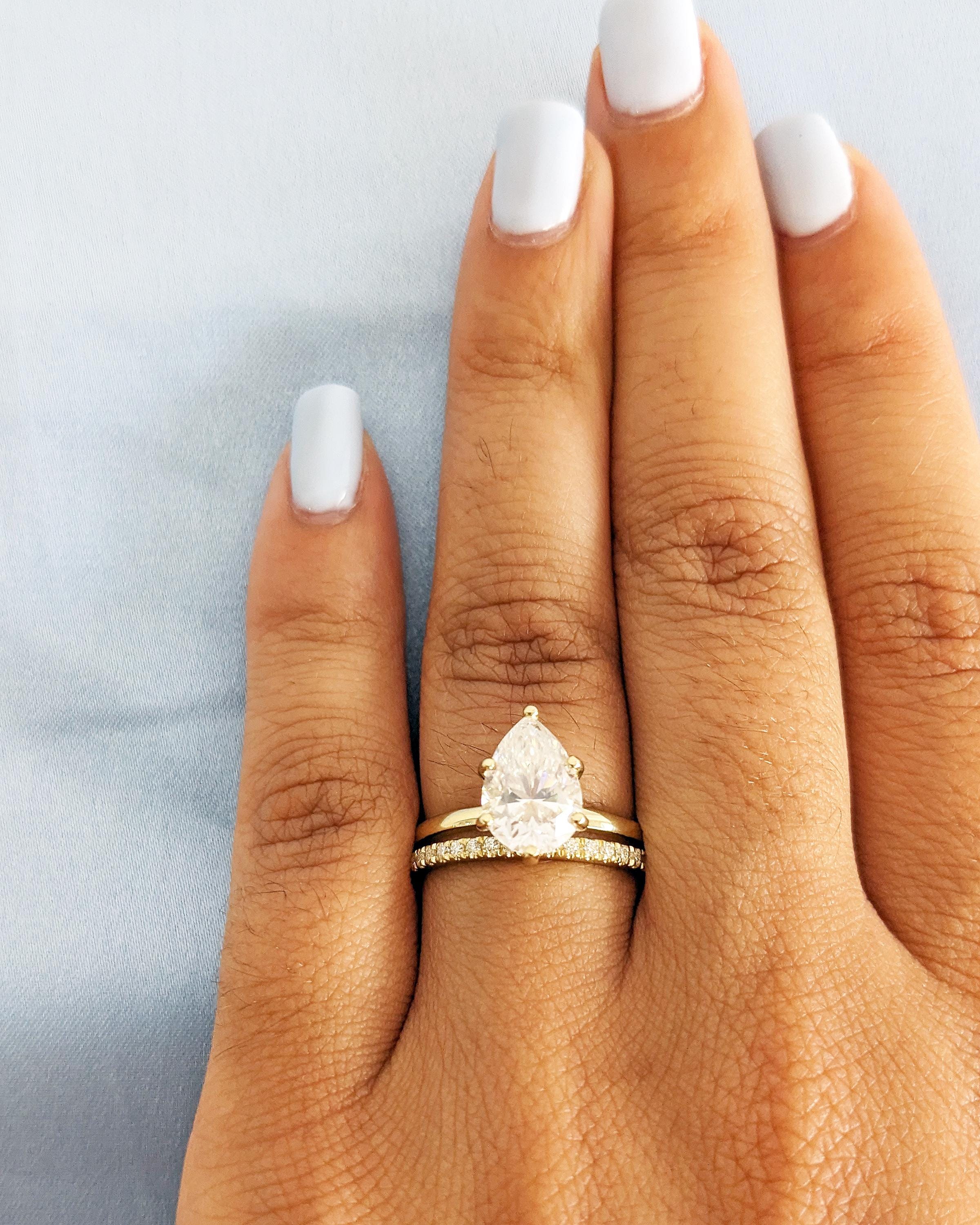 Add a touch of sophistication to your collection with this stunning pear cut Moissanite, gracefully set in a delicate prong setting. The slender 1.6mm band enhances its elegance, creating a timeless and refined piece. Pair it with the matching Moissanite wedding band for a complete bridal set.