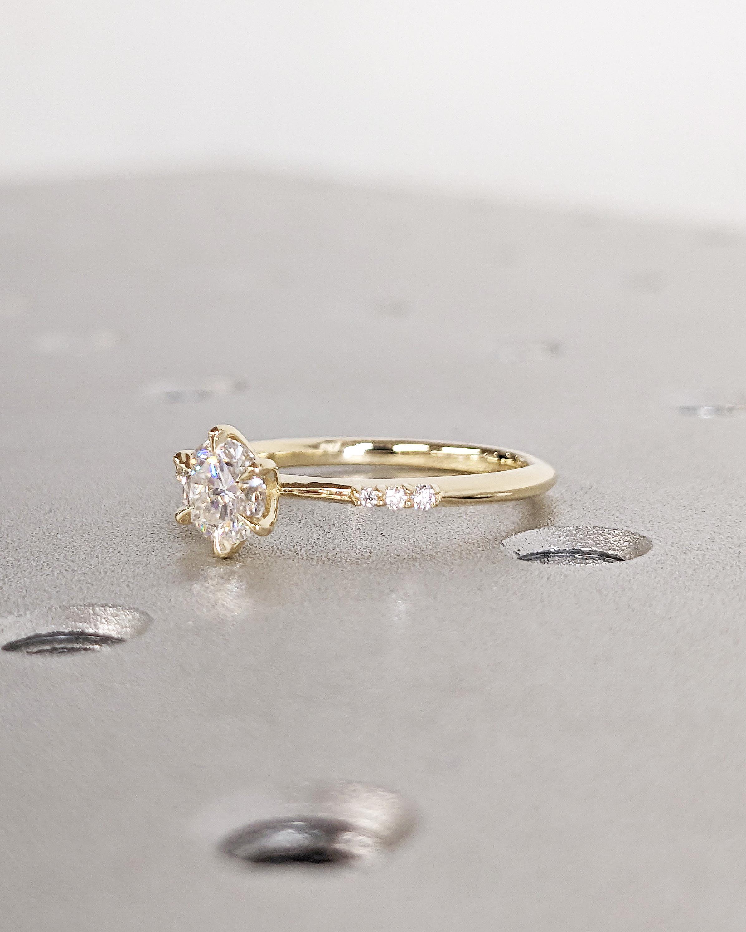 Minimalist yet full of character, this round-cut engagement ring is both simple and intricate. Its six-prong setting offers security and elegance, while three side stones on each side bring extra sparkle and symmetry. Choose from natural diamonds, lab diamonds, or moissanites to personalize your side stones. The dainty 1.7mm band allows the stones to shine while providing a comfortable, lightweight fit. A stunning option for those who love clean, refined designs with a touch of detail.