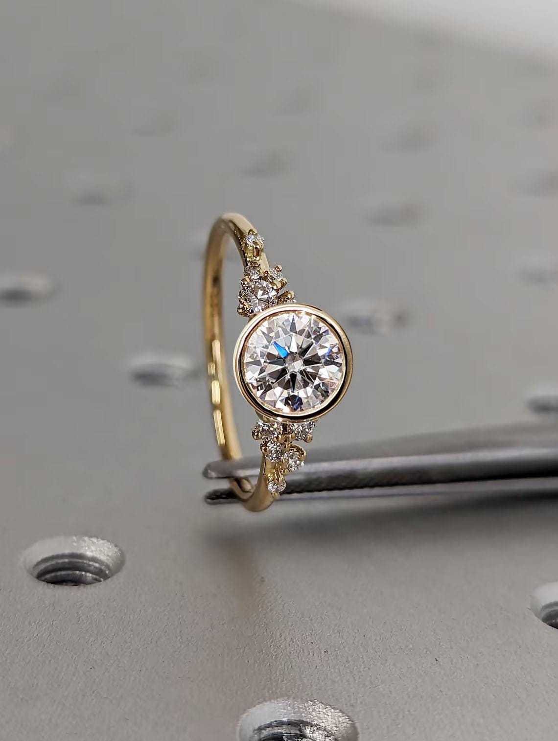 Celebrate the next chapter of your life with our round cut Lab Created Diamond engagement ring, set with a bezel setting. Embraced by delicate snowdrift of Natural Diamonds, Man Made Diamonds or Moissanites cluster, sparkling like freshly fallen snow. This finely handcrafted ring is the perfect symbol of your forever love.