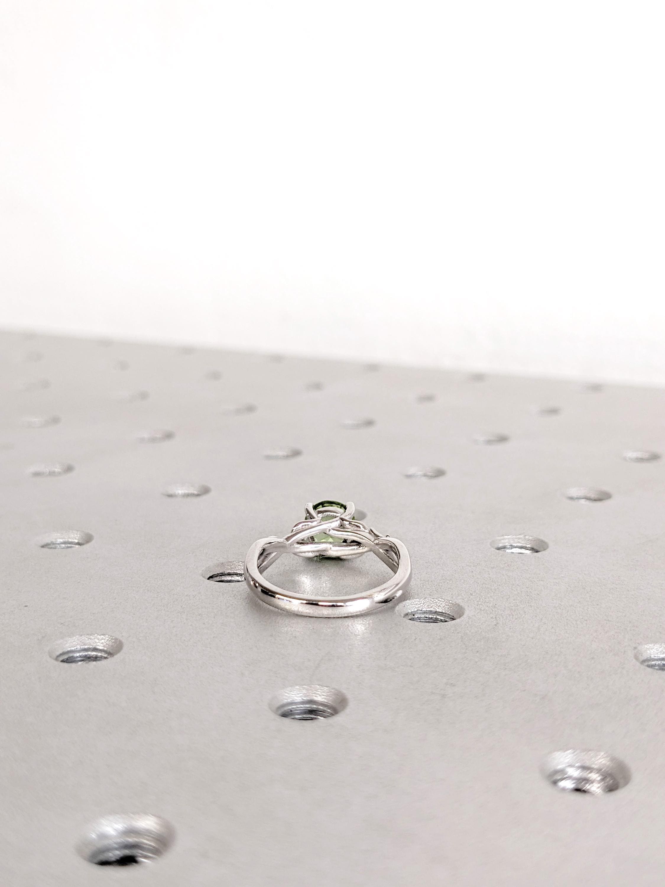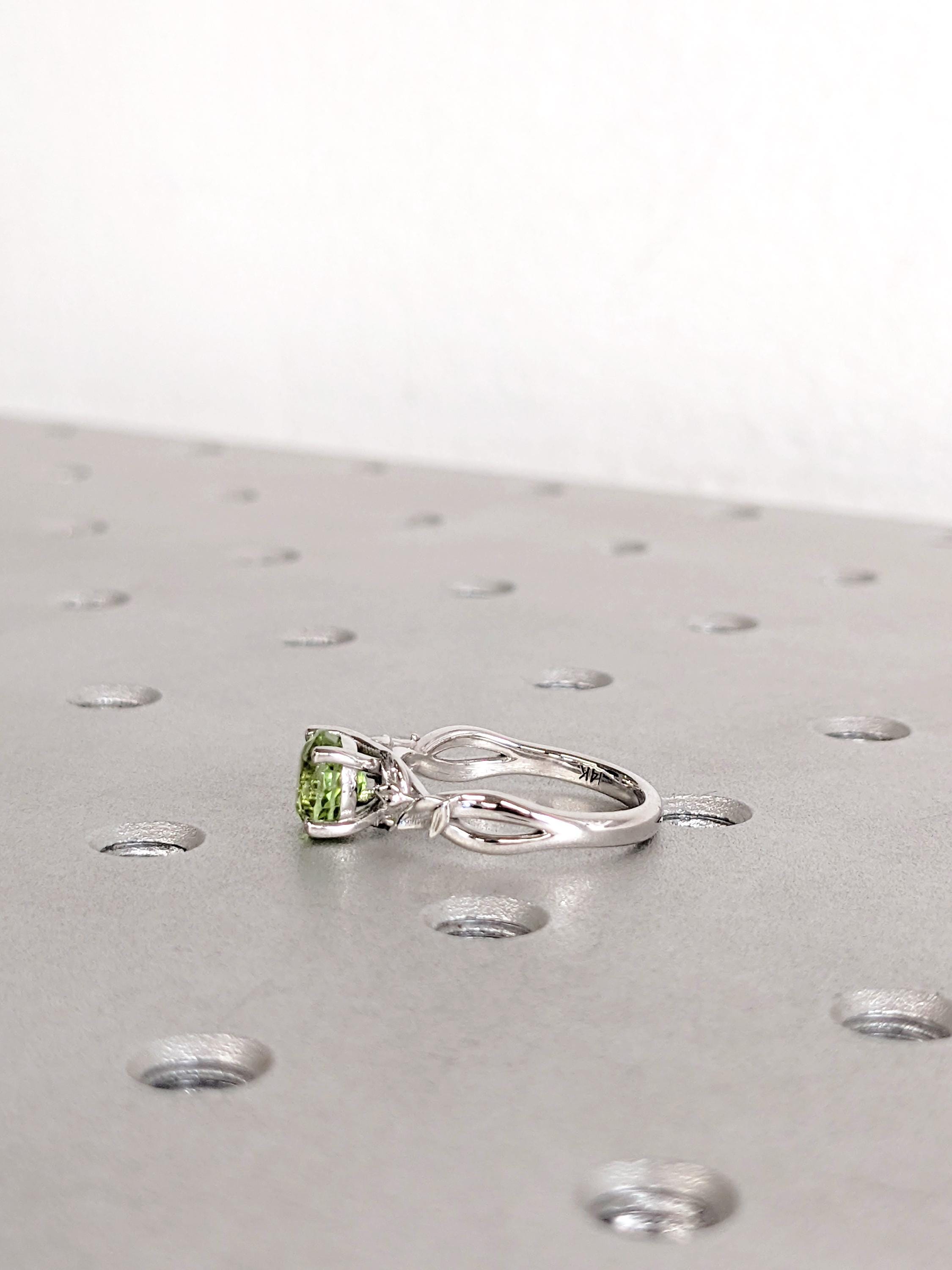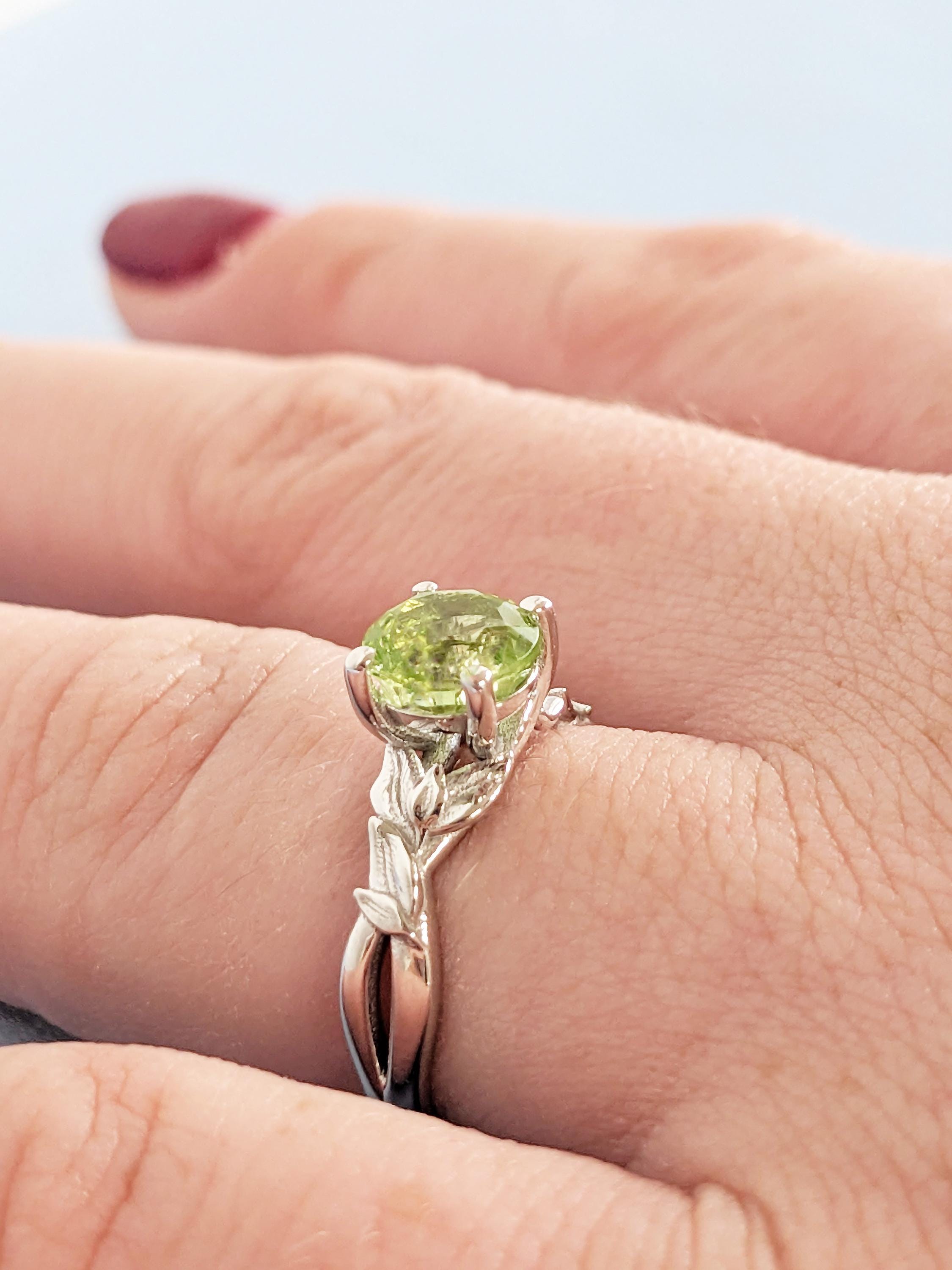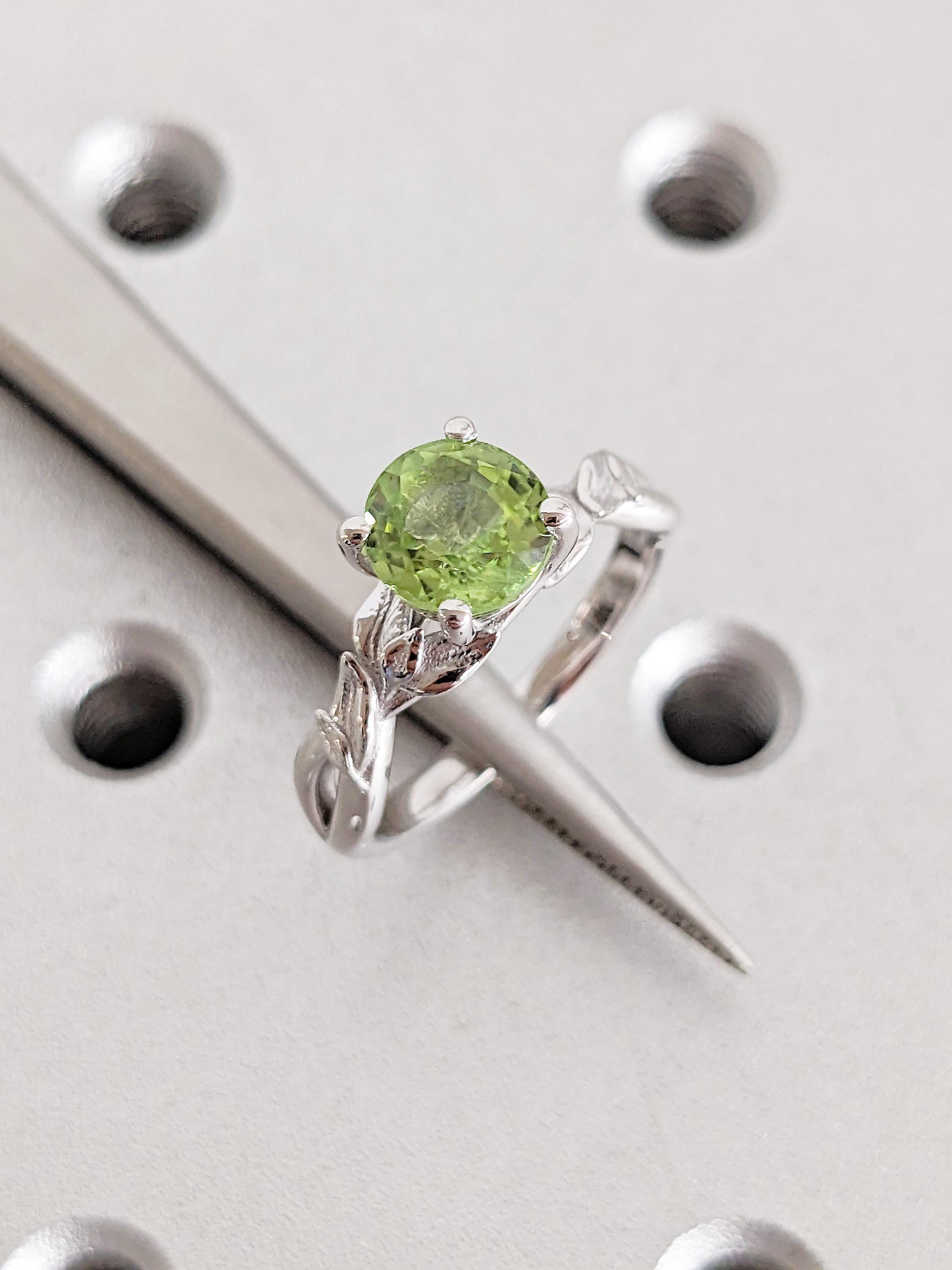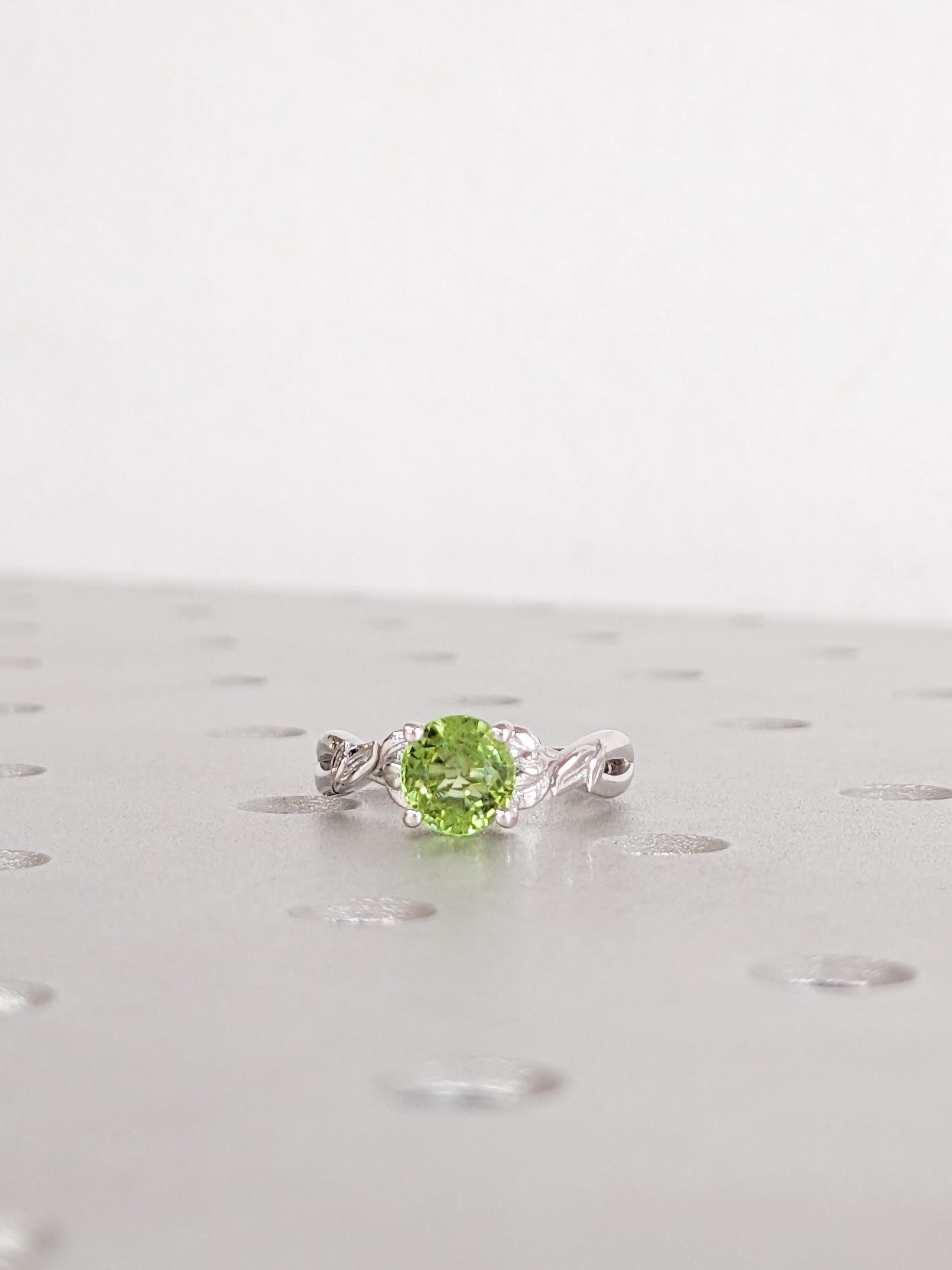 This Natural Peridot engagement ring highlights a round Peridot center stone in a prong setting, paired with a nature-inspired leaf design that gives the ring a soft organic look. The bright green Peridot creates a fresh and elegant style that stands out beautifully for bridal, anniversary, or everyday wear. A meaningful choice for anyone who loves unique gemstone jewelry with a natural touch.